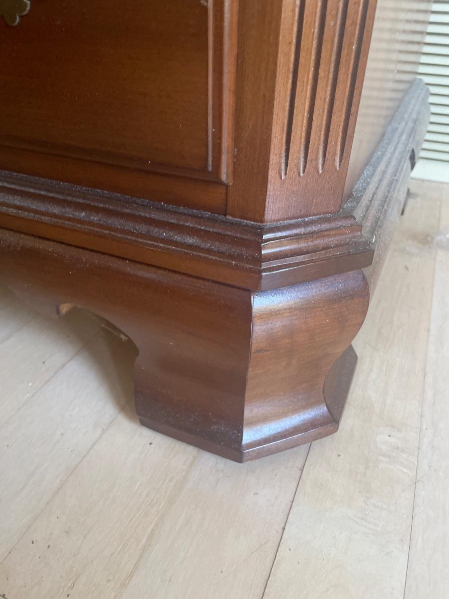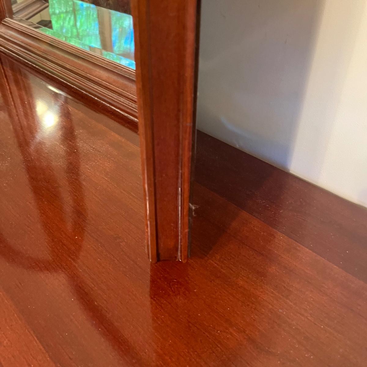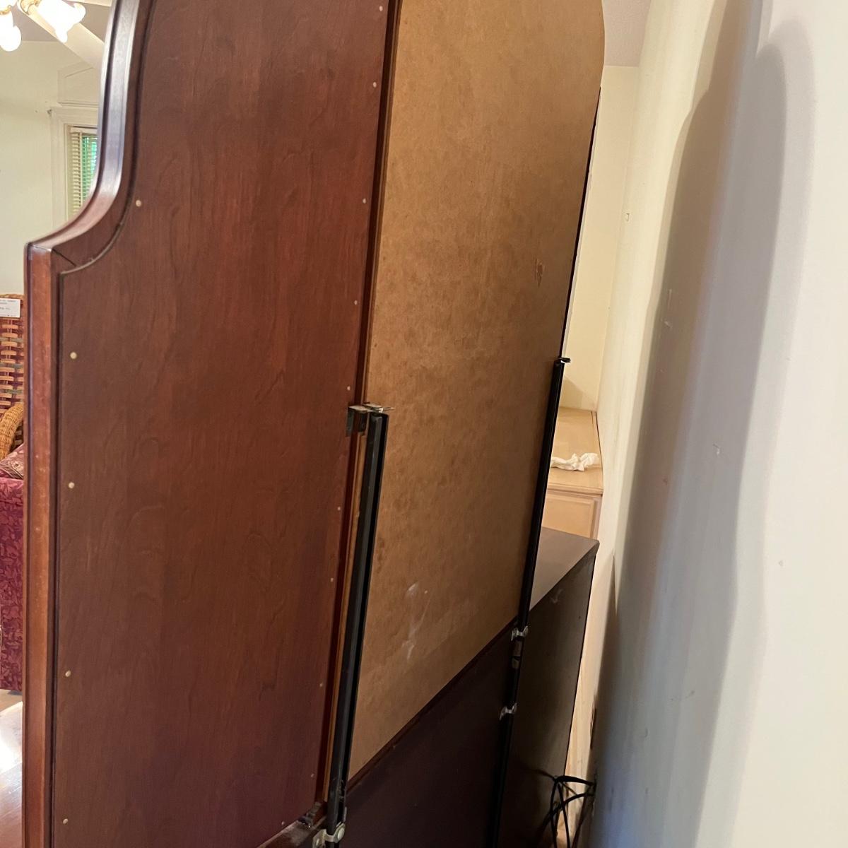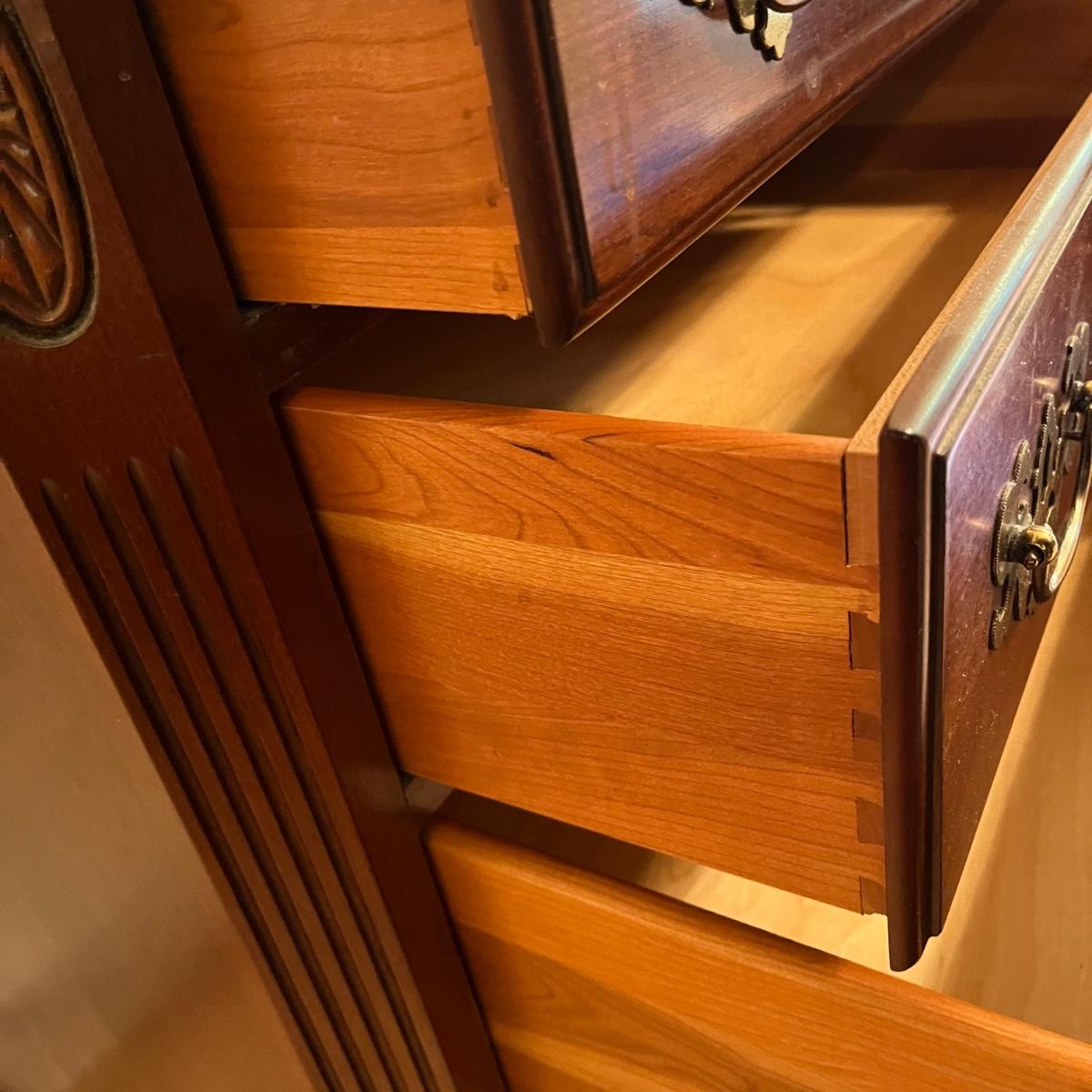Lot includes a Ethan Allen Georgian Court dresser and mirror. Dresser has nine dovetailed drawers and two more drawers behind cabinet, it is in excellent condition. Mirror is detachable for moving. There are a number of other lots in this sale that are also this Ethan Allen collection. Bring help item is substantial. Dresser measures 20.5” x 74.5” x 34.5” without mirror and mirror measures 55” x 45.5”.