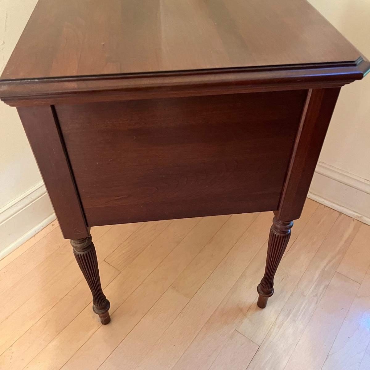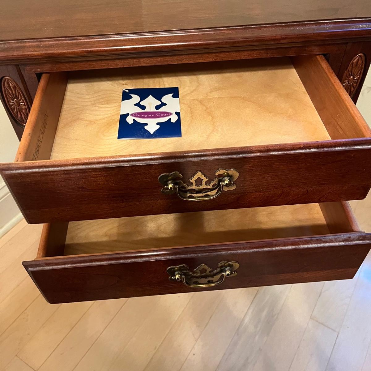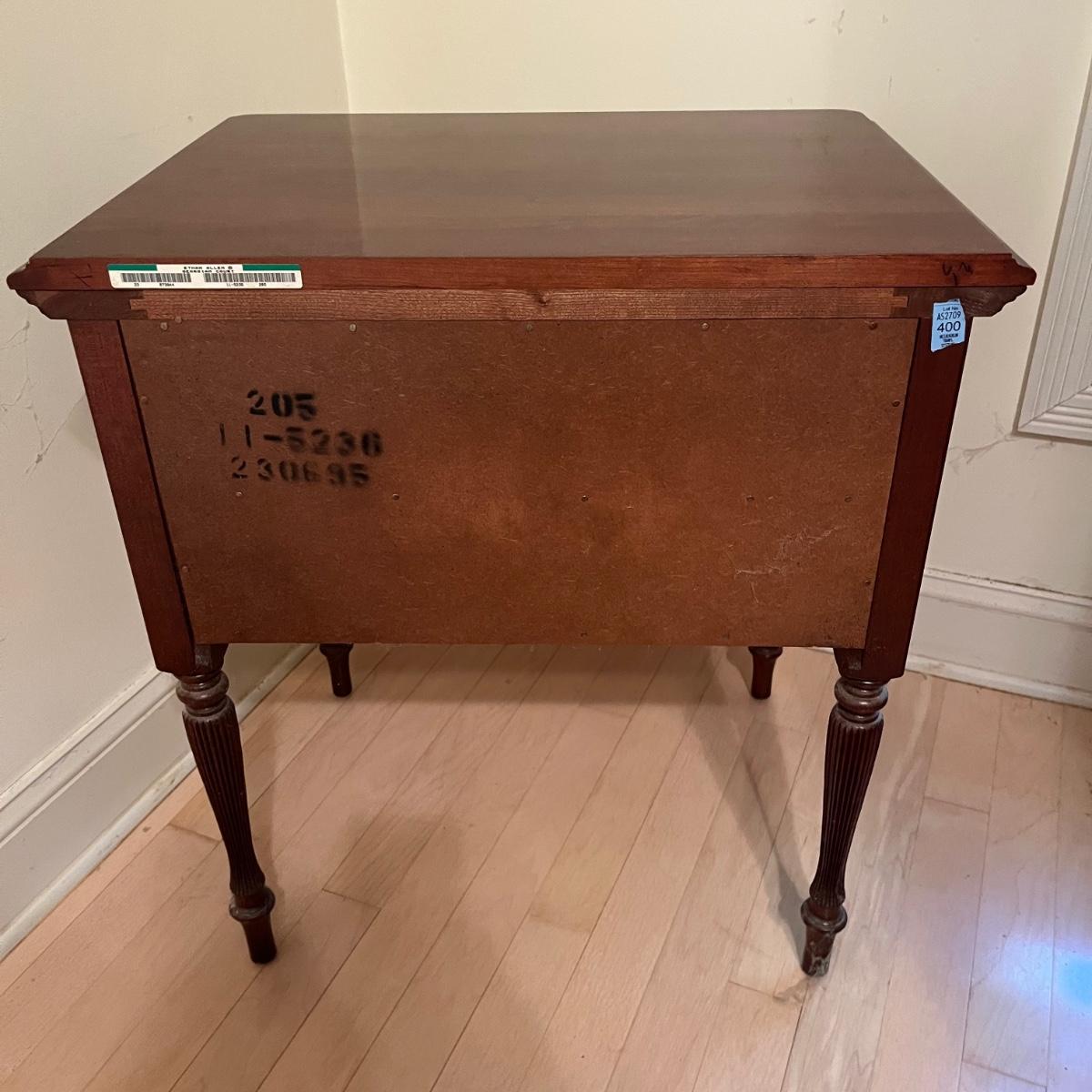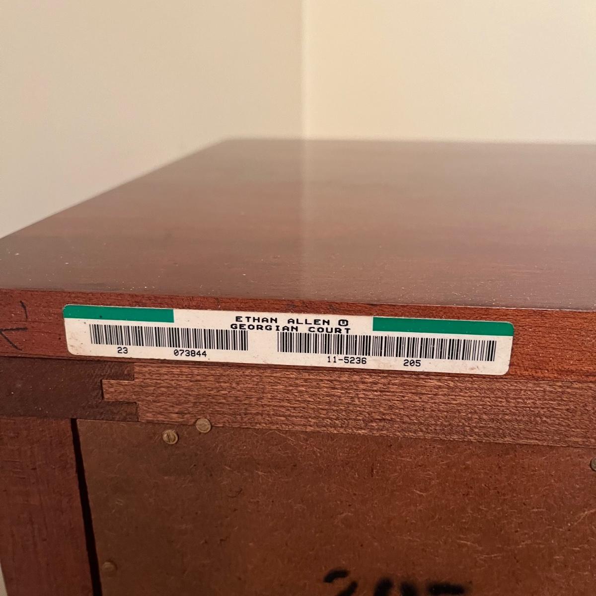 Lot includes a Ethan Allen Georgian Court end table with two dovetailed drawers. Table has a scratch on top, see pictures. There are multiple lots in this estate that are Georgian Court. There are a number of other lots in this sale that are also this Ethan Allen collection. Table measures 18” x 24” x 26.5”.