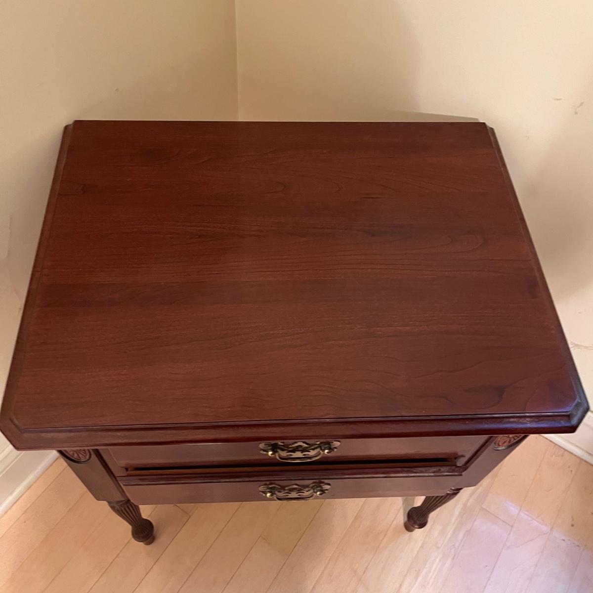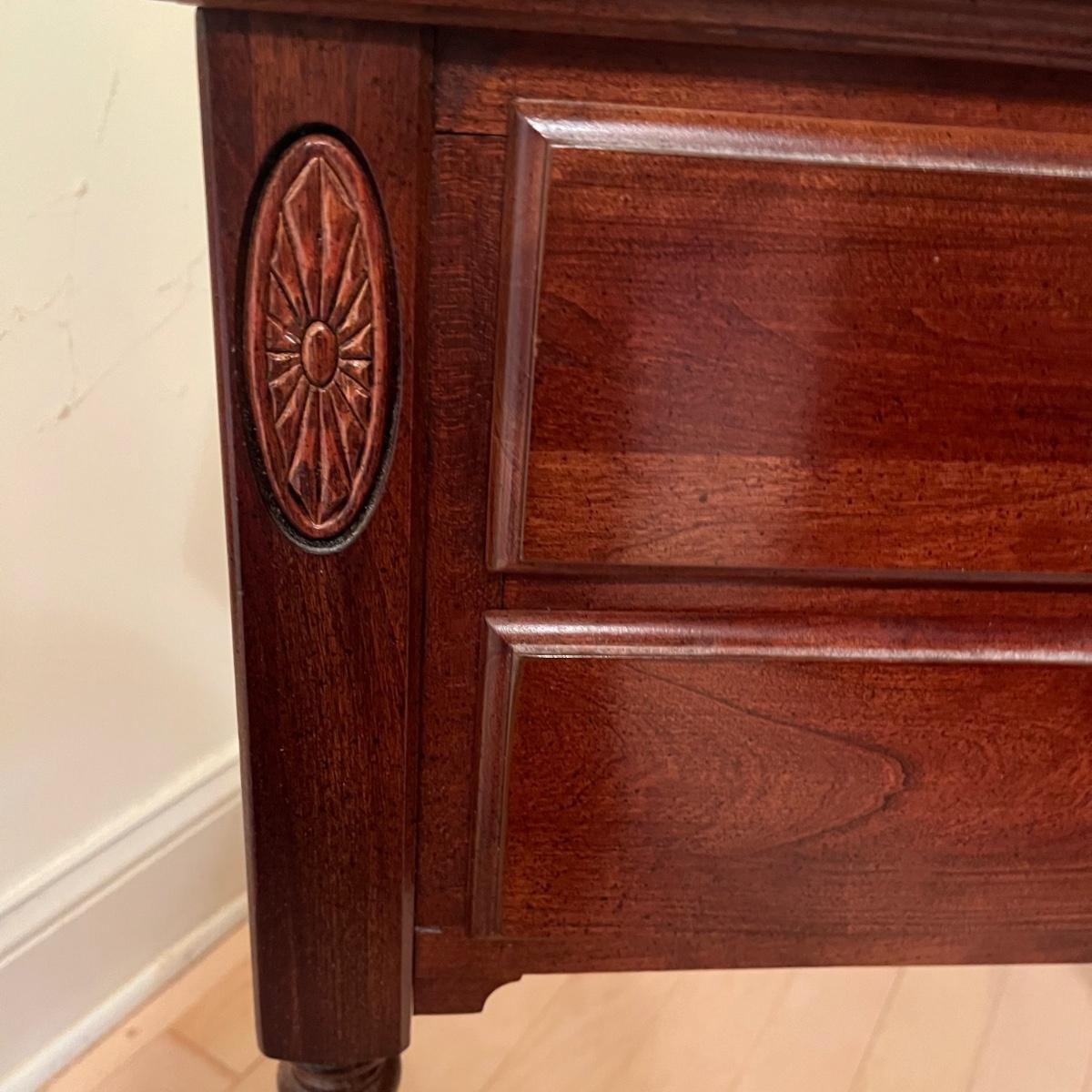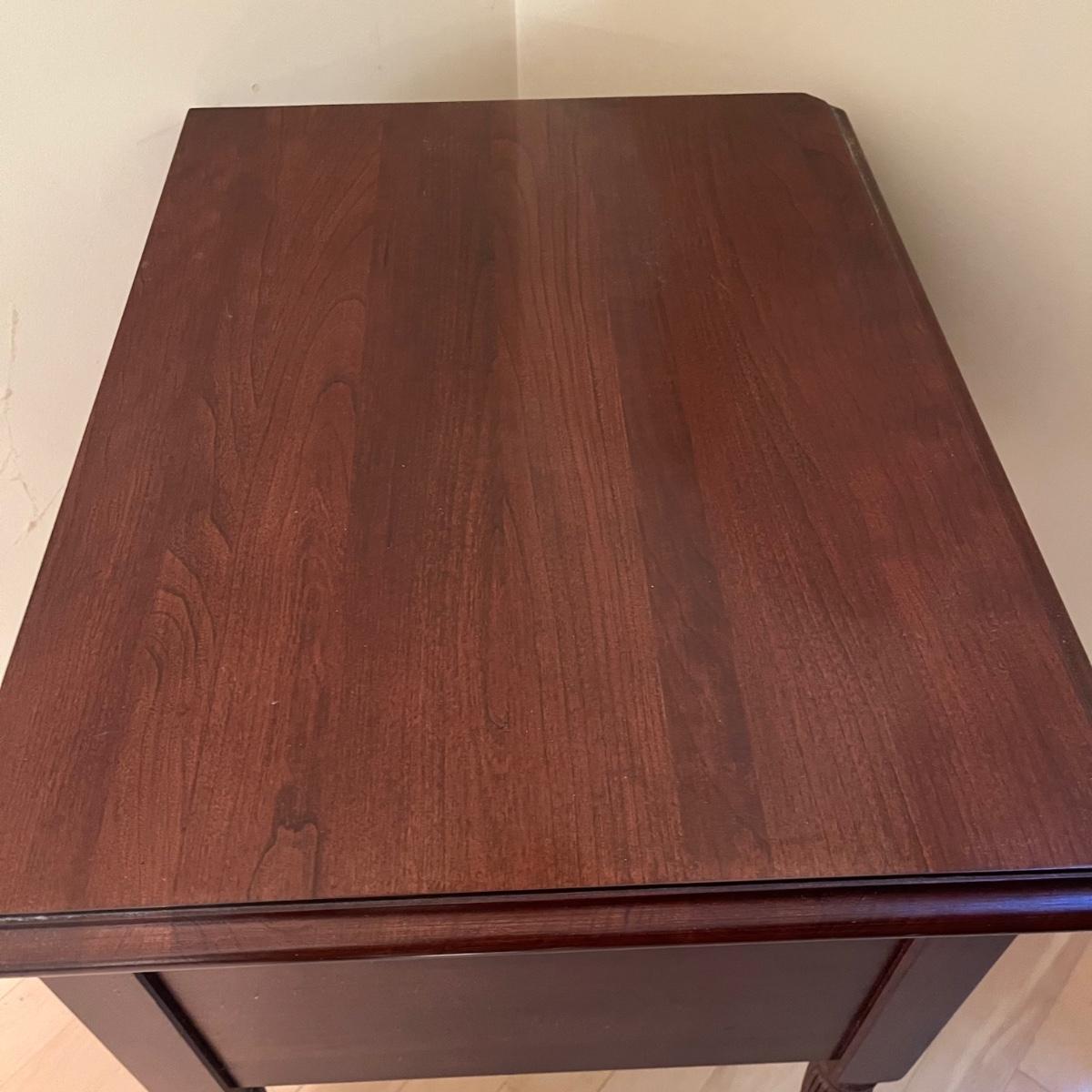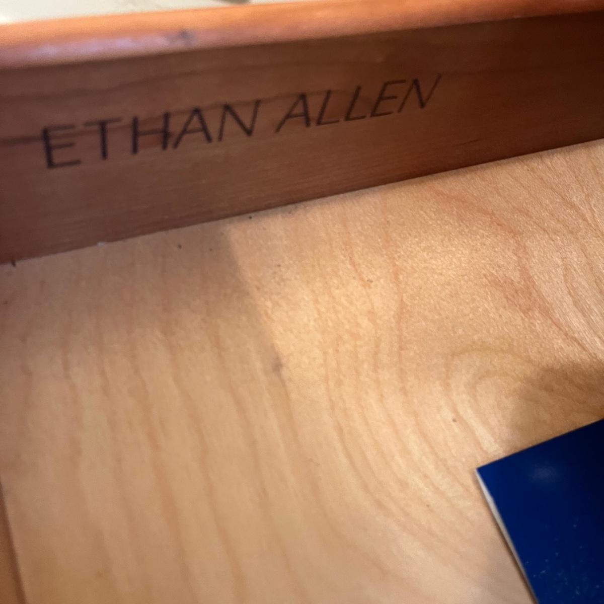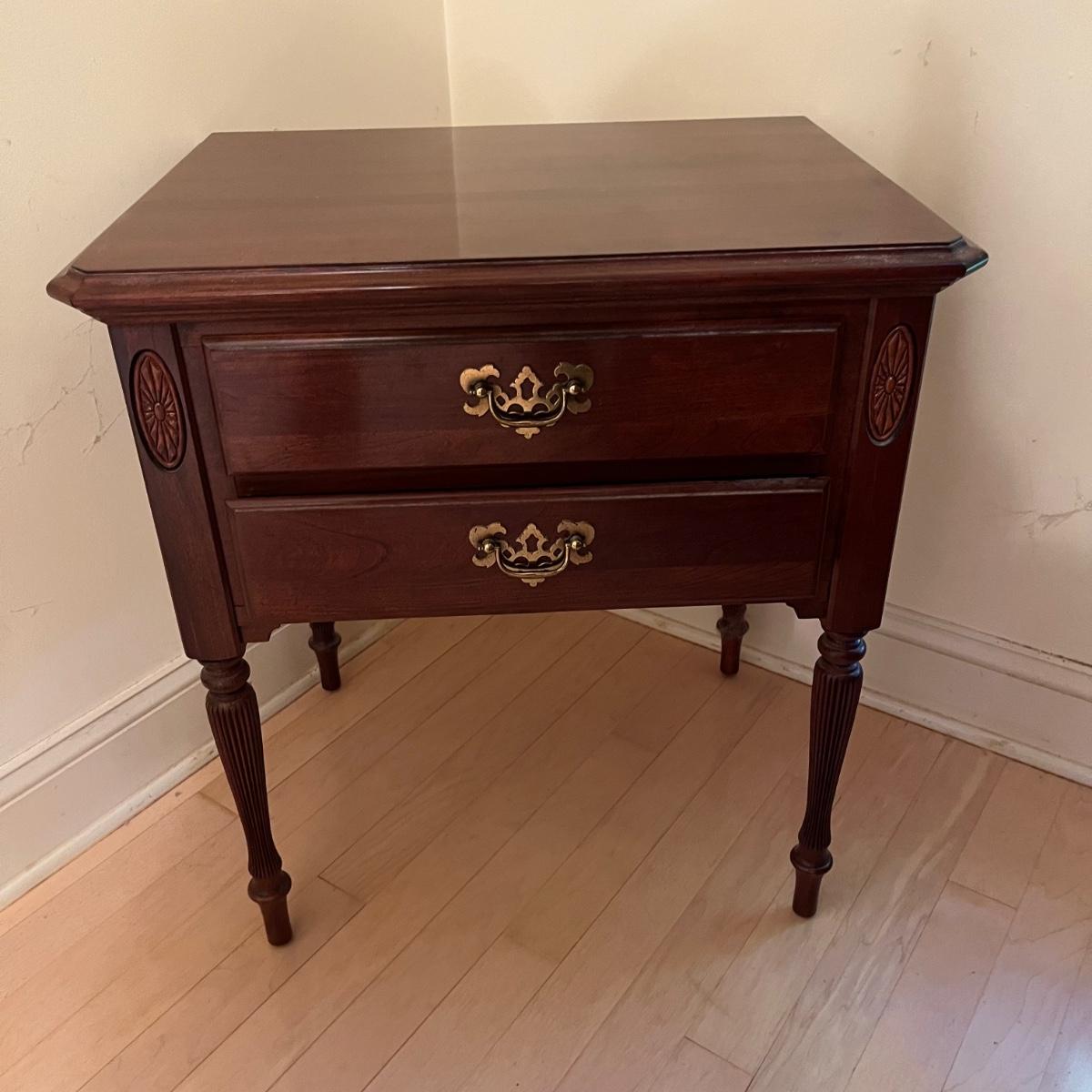 Lot includes a Ethan Allen Georgian Court end table with two dovetailed drawers. Table has a scratch on top, see pictures. There are multiple lots in this estate that are Georgian Court. There are a number of other lots in this sale that are also this Ethan Allen collection. Table measures 18” x 24” x 26.5”.
