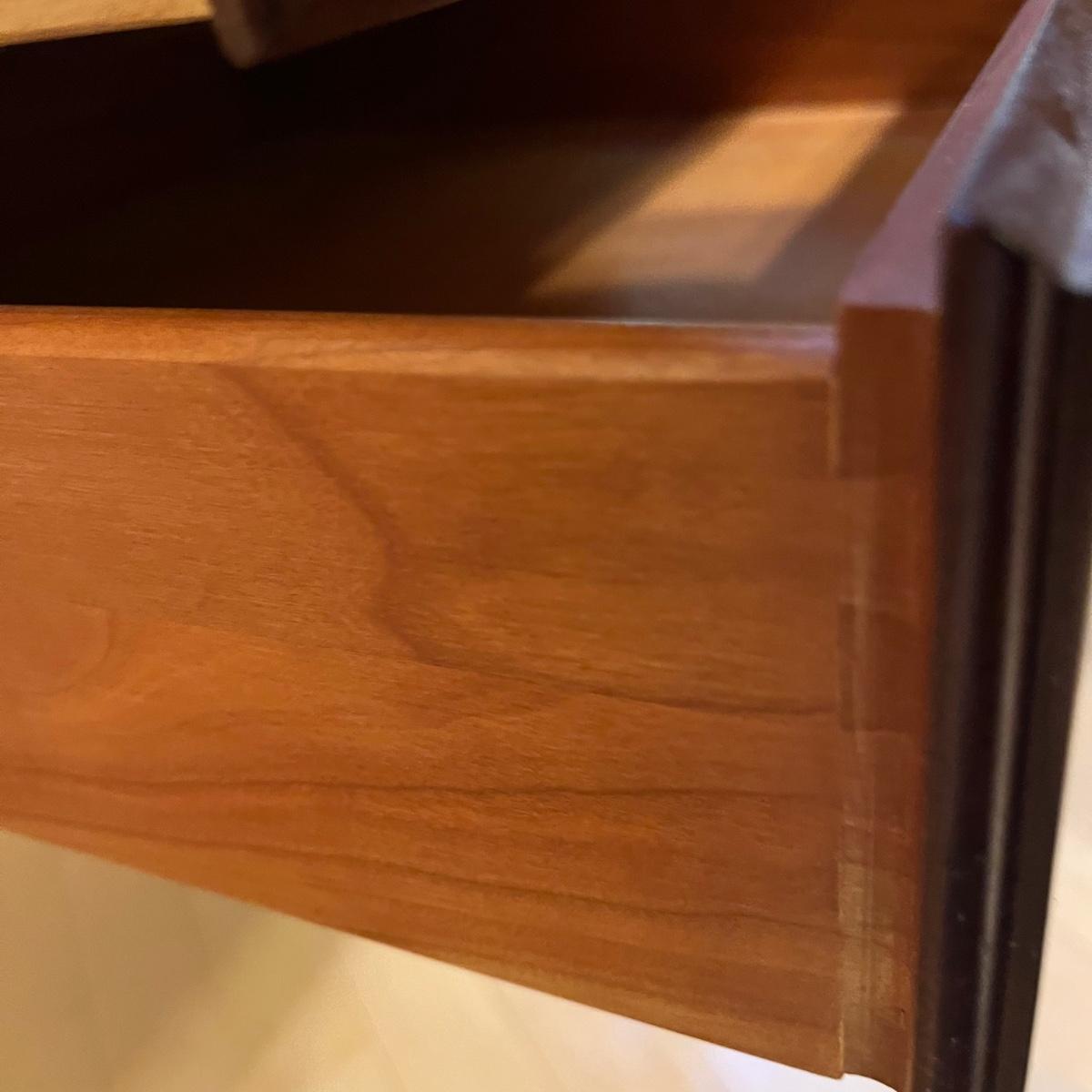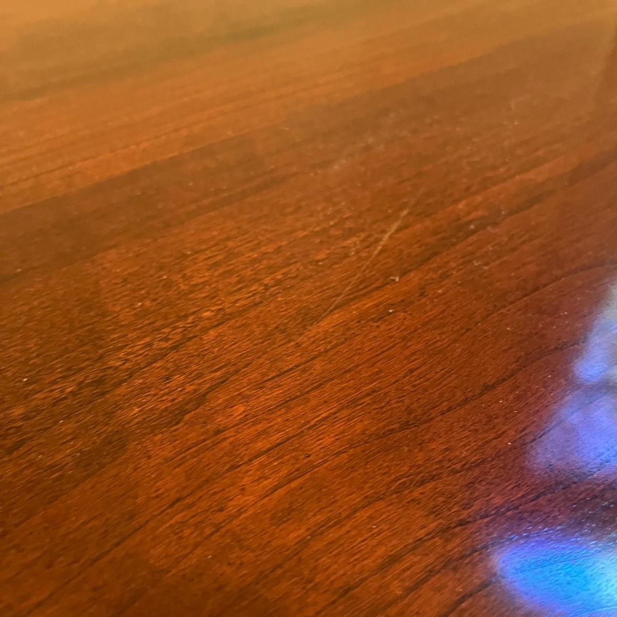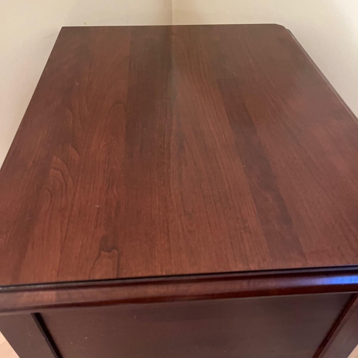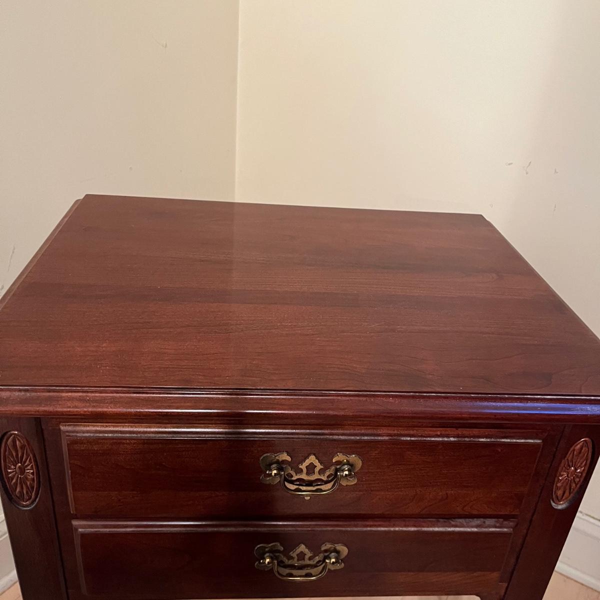 Lot includes a Ethan Allen Georgian Court end table with two dovetailed drawers. Table has a scratch on top, see pictures. There are multiple lots in this estate that are Georgian Court. There are a number of other lots in this sale that are also this Ethan Allen collection. Table measures 18” x 24” x 26.5”.