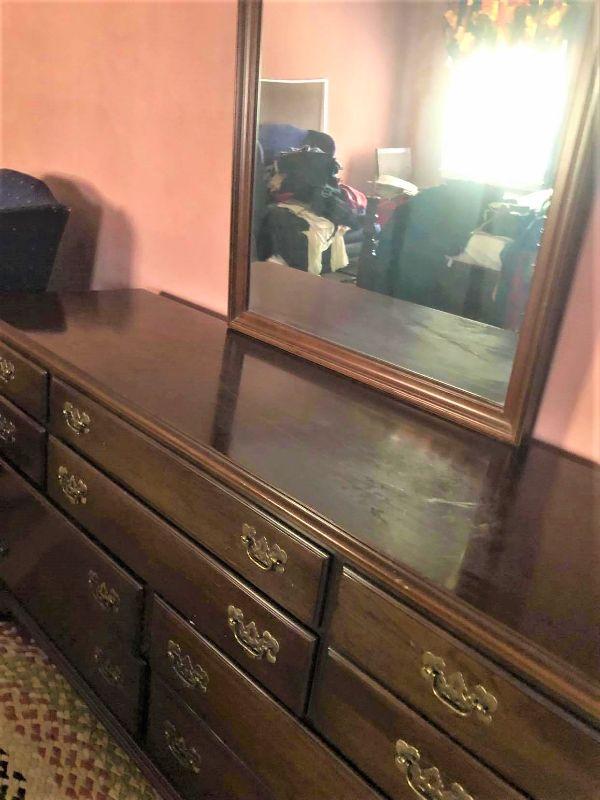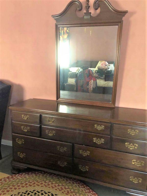 Vintage Ethan Allen Georgian Court Queen Anne Cherry Traditional Triple Dresser and mirror. Fine Furniture. 66ʺW × 20.25ʺD × 34ʺH. Slight scratch on top from everyday use. Beautiful heavy piece.