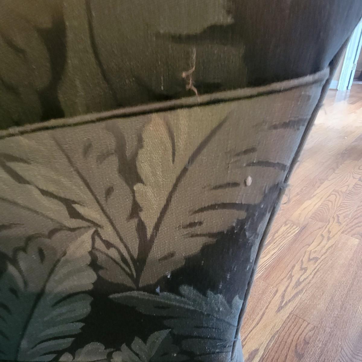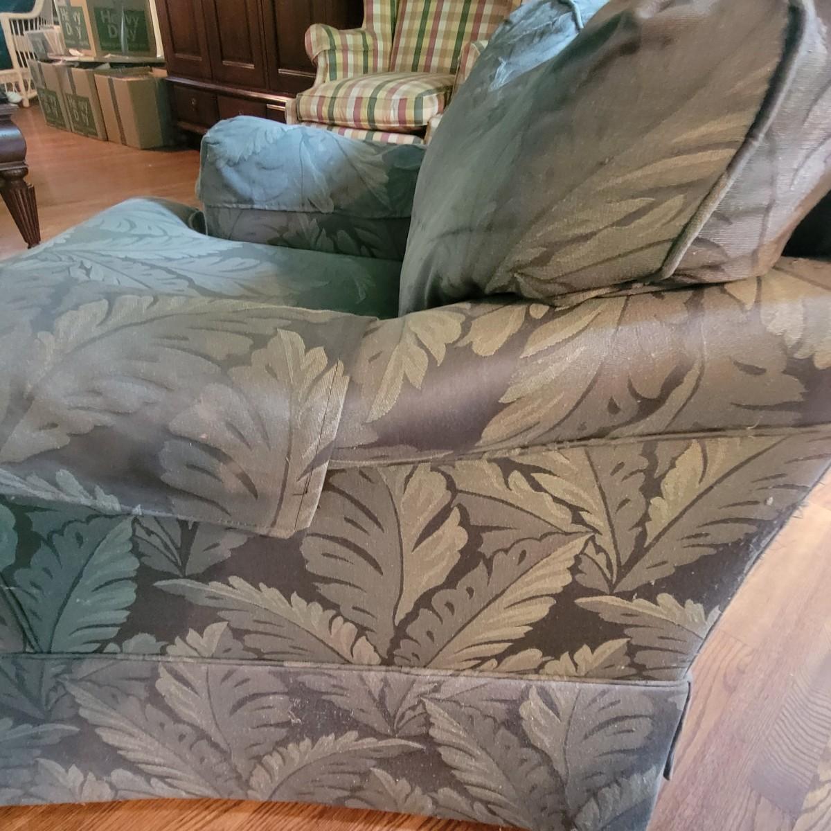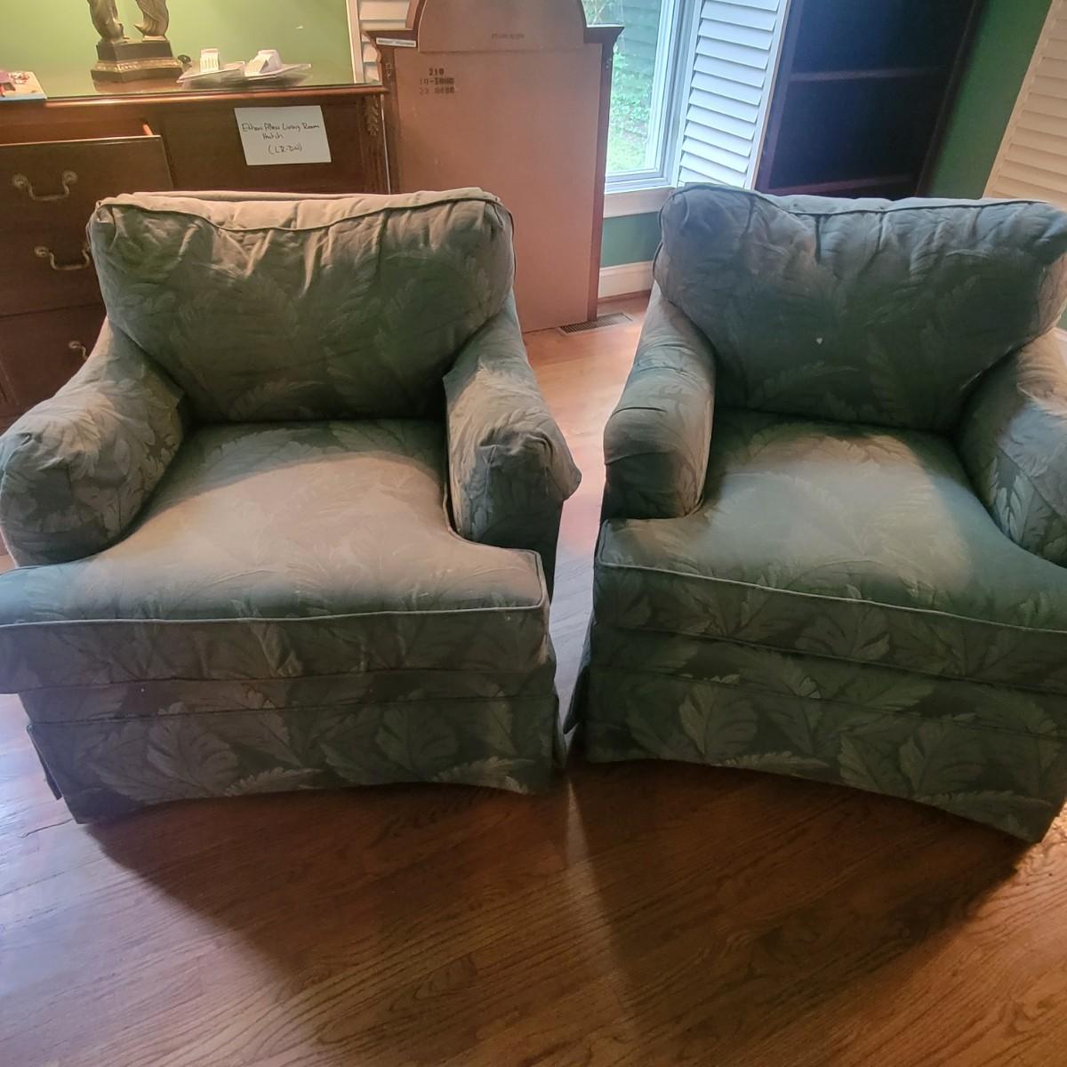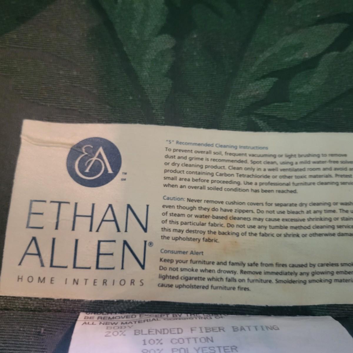 A set of two armchairs crafted by Ethan Allen with a green floral motif. The fabric has some damage from use and cats. One chair has a rip behind the back cushion. See photos. Measure approximately 36" x 28" x 30" each. Local pickup only