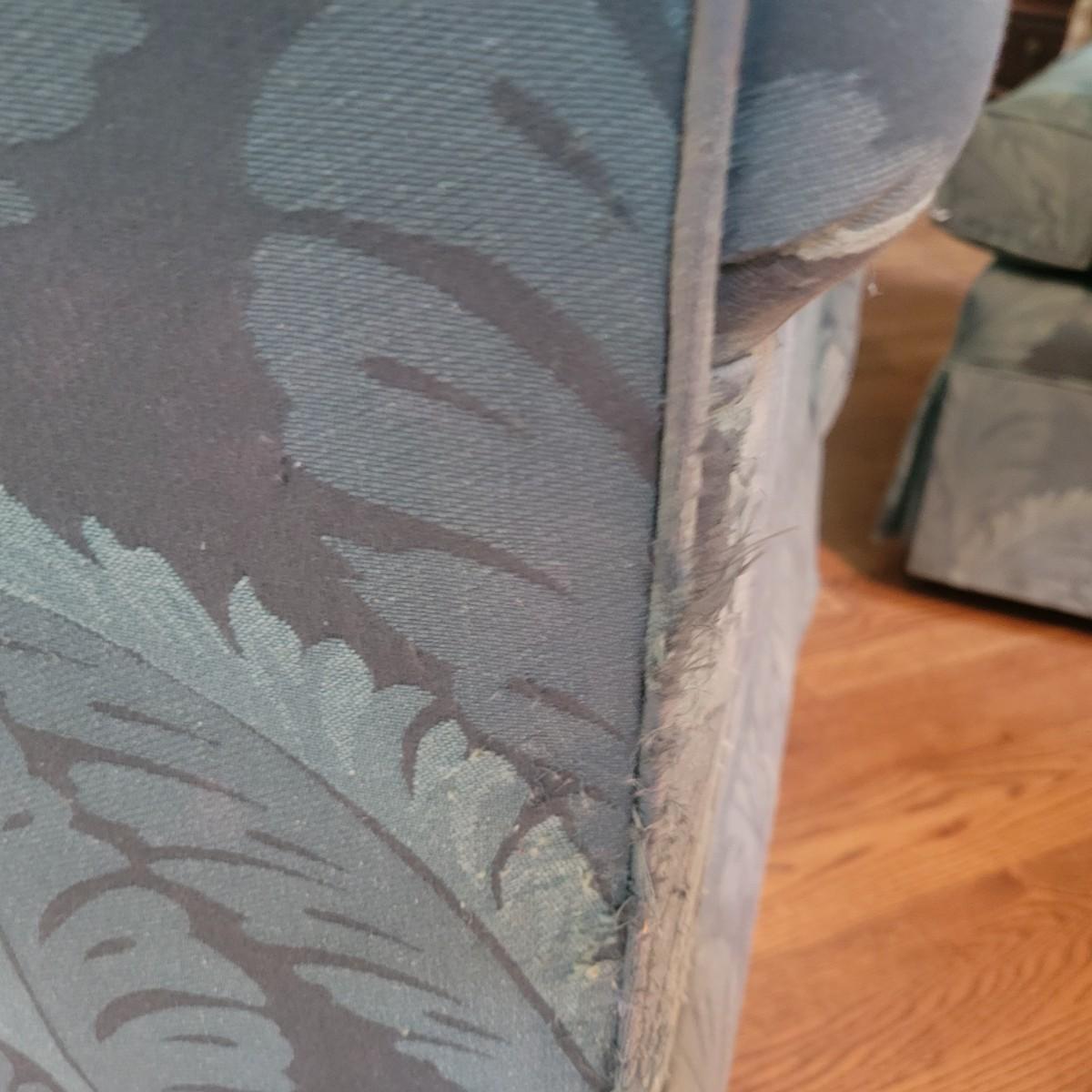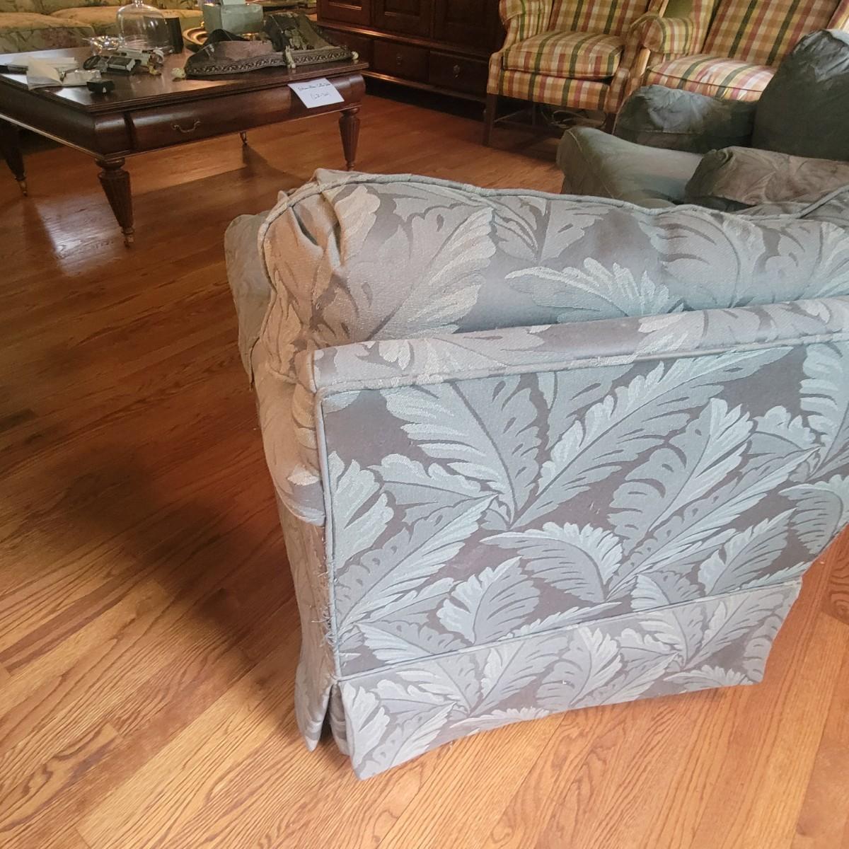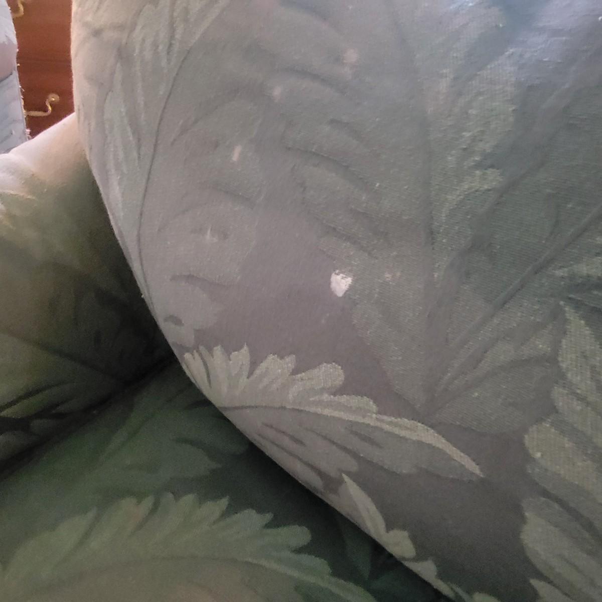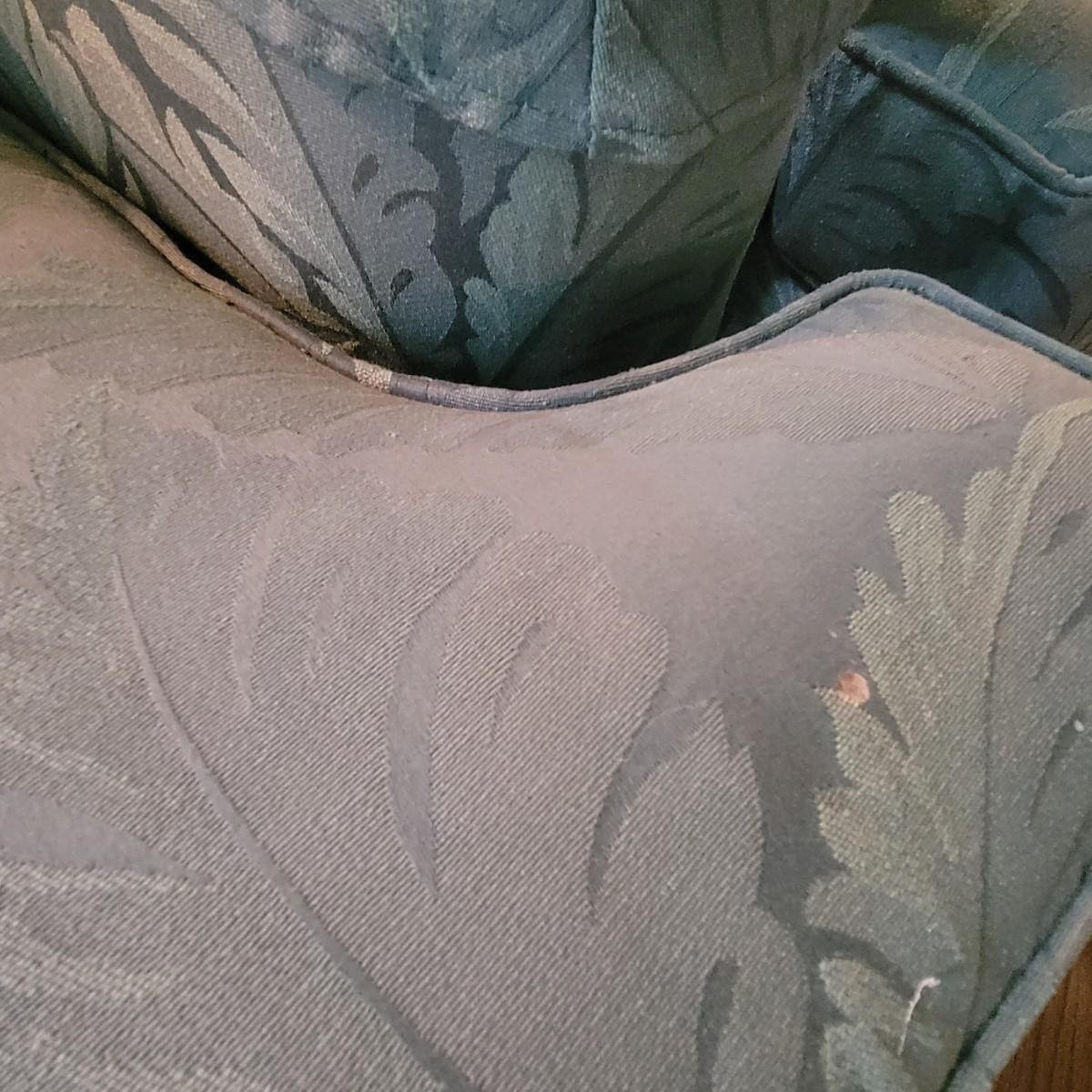 A set of two armchairs crafted by Ethan Allen with a green floral motif. The fabric has some damage from use and cats. One chair has a rip behind the back cushion. See photos. Measure approximately 36" x 28" x 30" each. Local pickup only