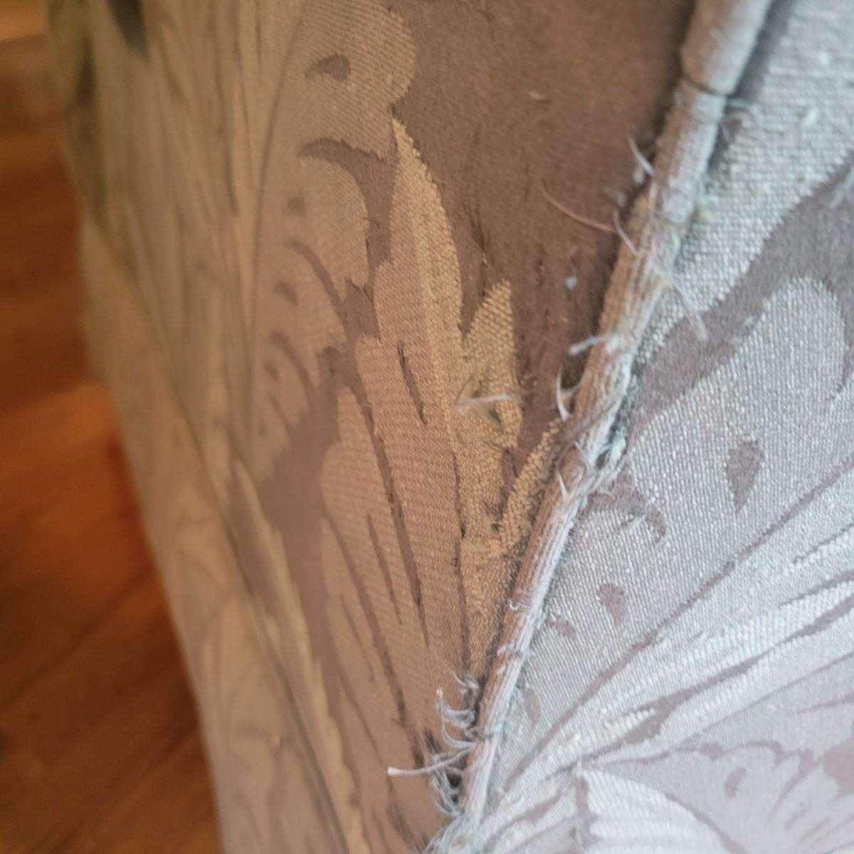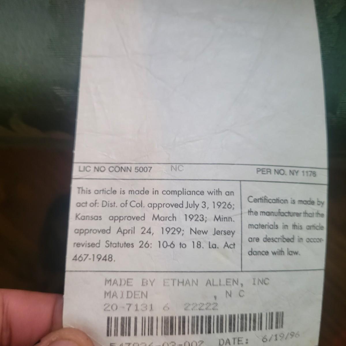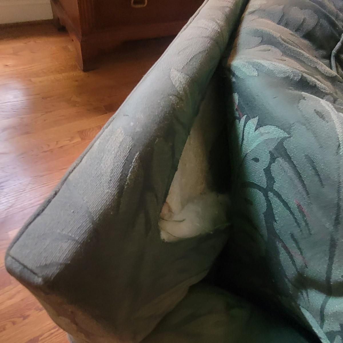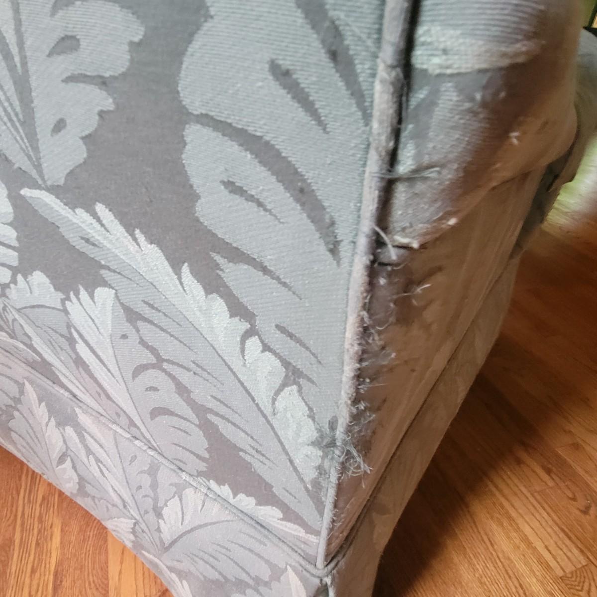 A set of two armchairs crafted by Ethan Allen with a green floral motif. The fabric has some damage from use and cats. One chair has a rip behind the back cushion. See photos. Measure approximately 36" x 28" x 30" each. Local pickup only
