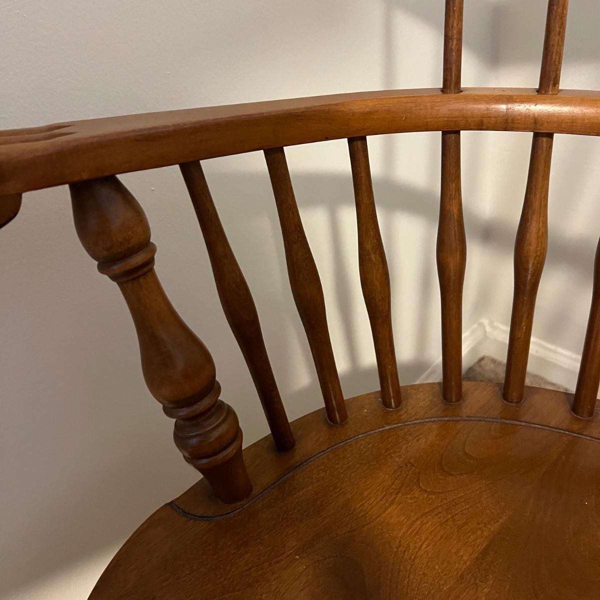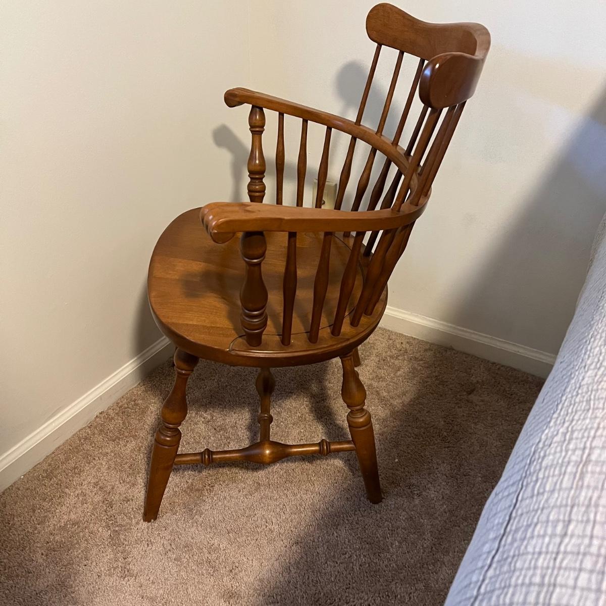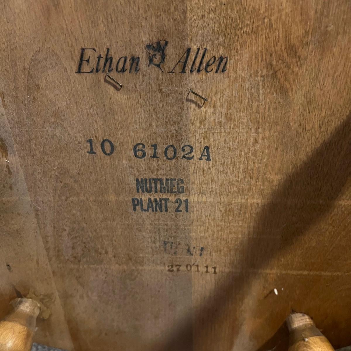 Sturdy solid wood arm chair by Ethan Allen. A photo shows one spindle that has come a little out of its hole, should be an easy fix. Light scratch mark on seat, shown in a photo.