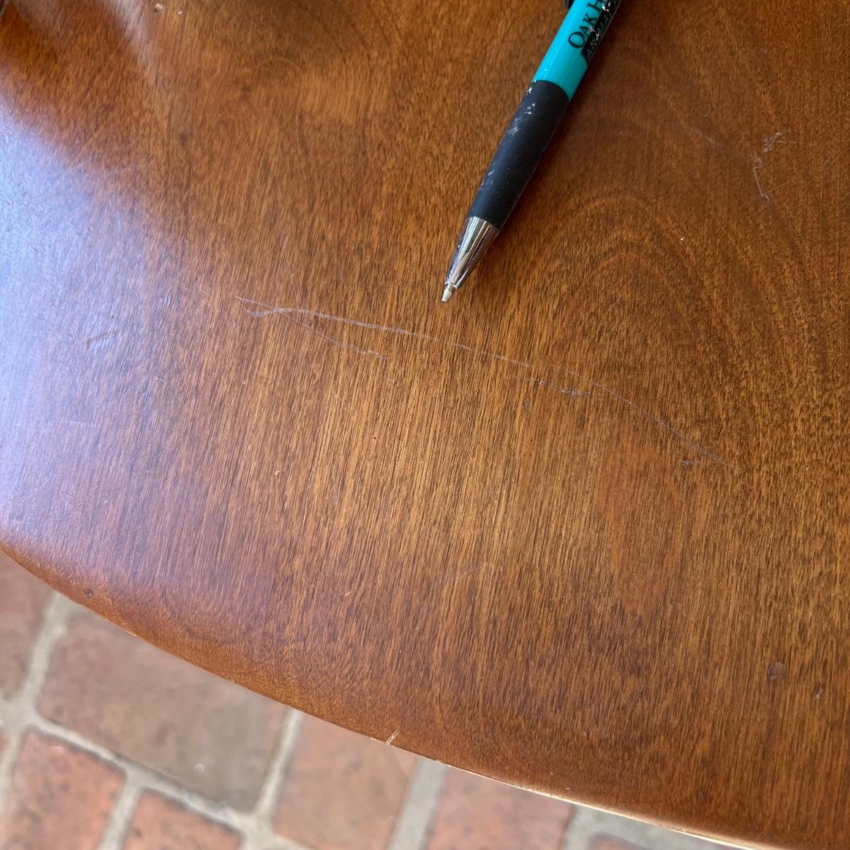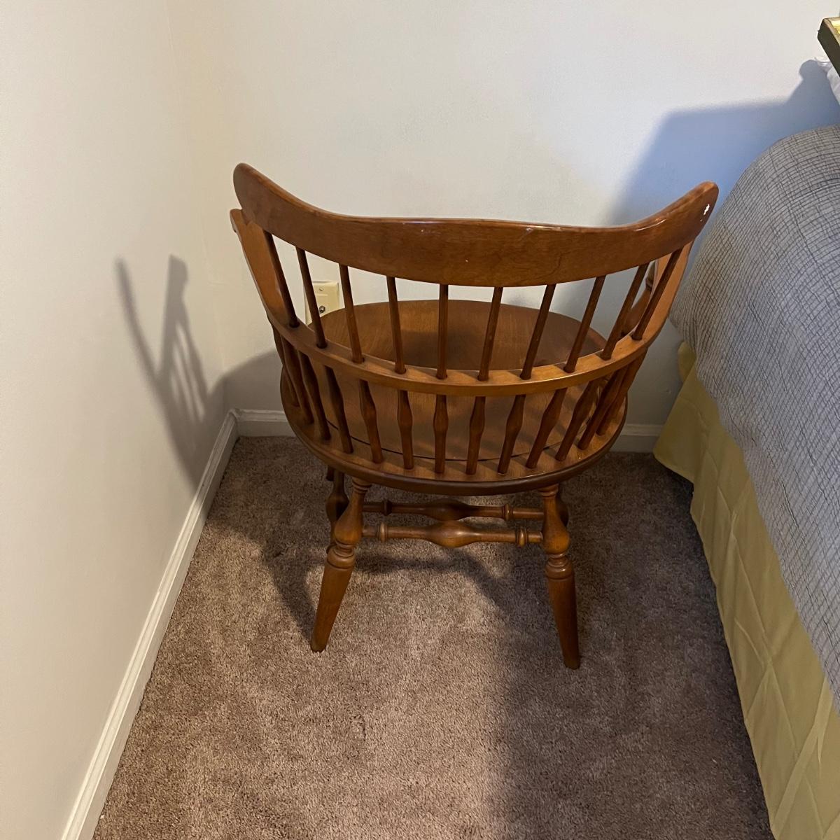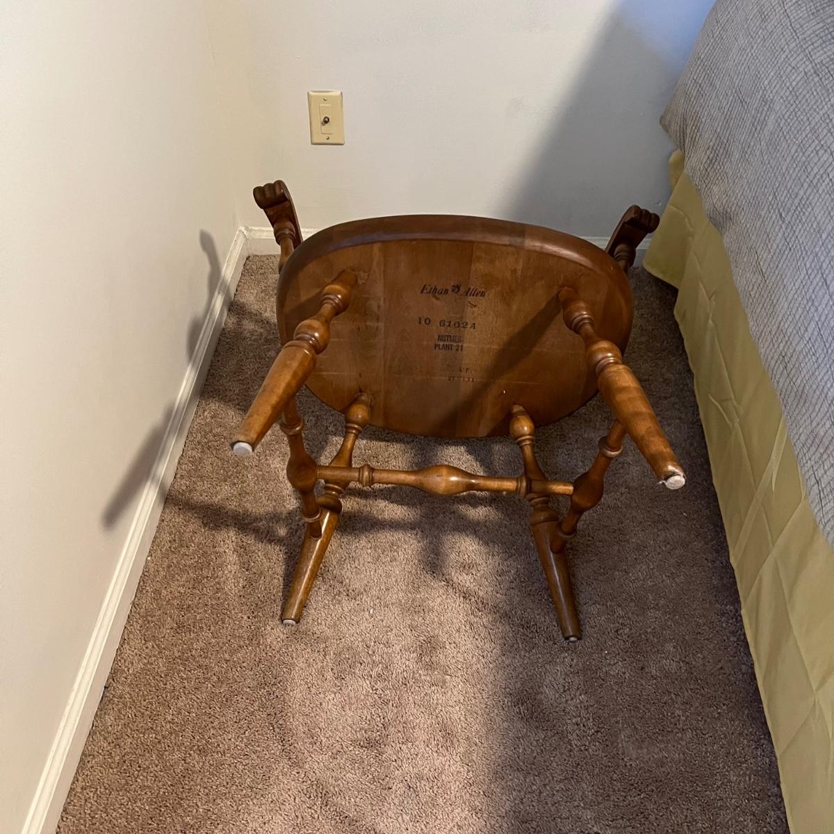 Sturdy solid wood arm chair by Ethan Allen. A photo shows one spindle that has come a little out of its hole, should be an easy fix. Light scratch mark on seat, shown in a photo.