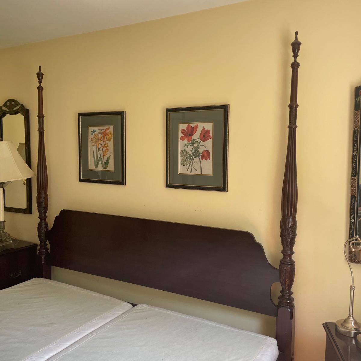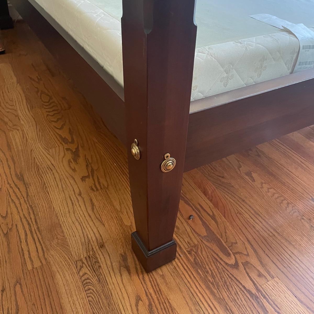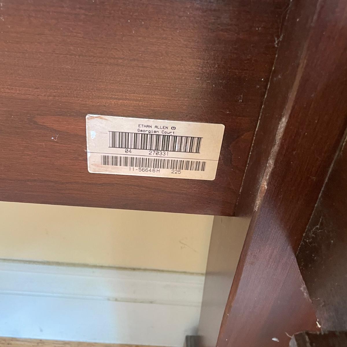 This gorgeous four poster Ethan Allen king sized bed is from the Georgian Court Collection and is solid cherry wood with brass accents. It’s in excellent condition with some very small minor scratches on the inside of the rails and note that the base rails have come unscrewed from the one side which is an easy fix and doesn’t affect the sturdiness of the bed. Matching bedside tables and dresser furniture are found in other lots in this sale.