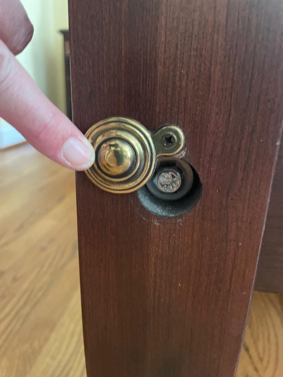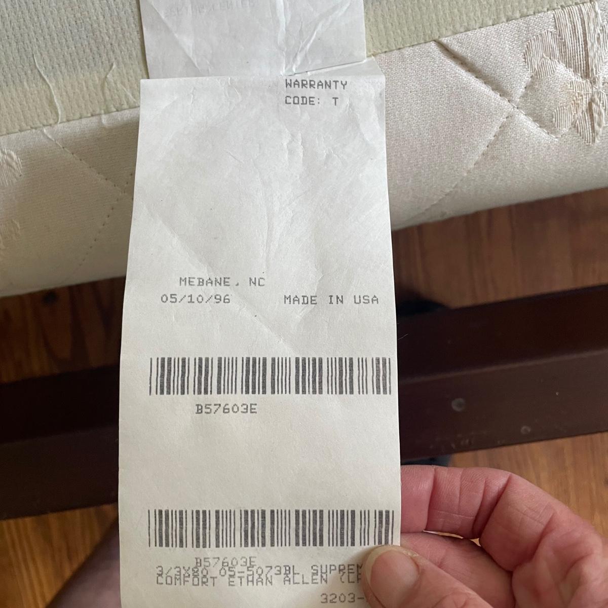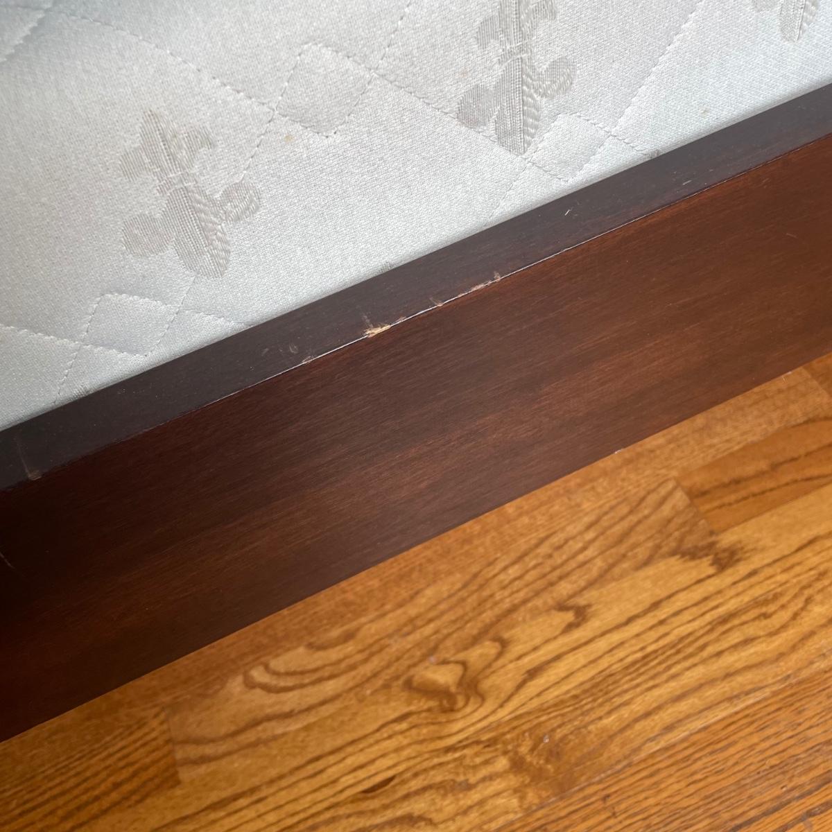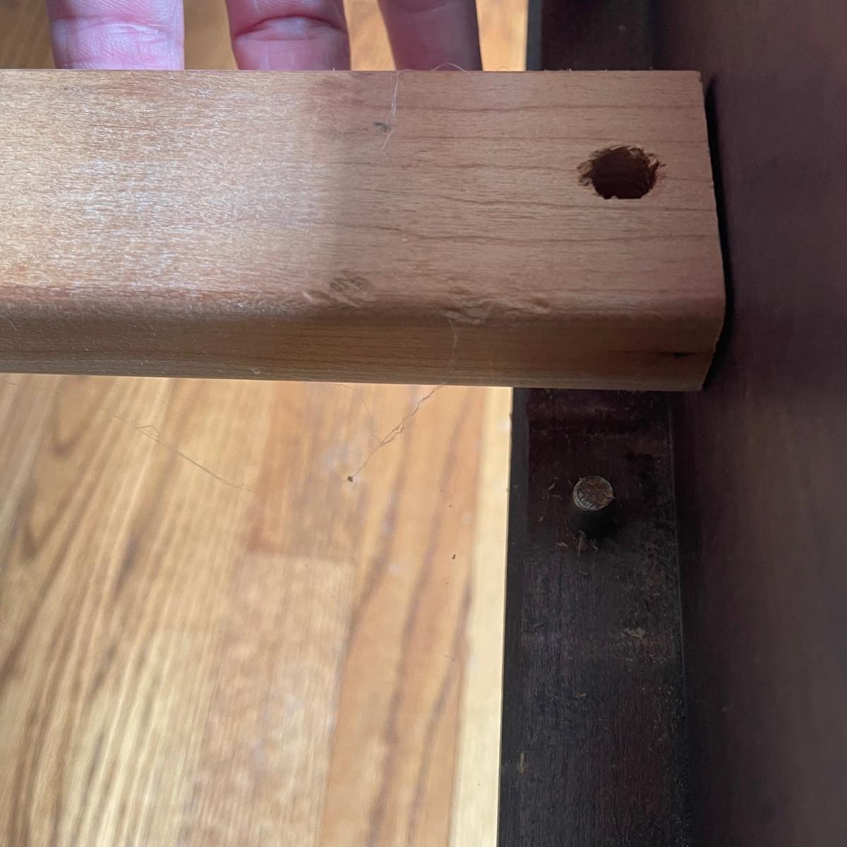 This gorgeous four poster Ethan Allen king sized bed is from the Georgian Court Collection and is solid cherry wood with brass accents. It’s in excellent condition with some very small minor scratches on the inside of the rails and note that the base rails have come unscrewed from the one side which is an easy fix and doesn’t affect the sturdiness of the bed. Matching bedside tables and dresser furniture are found in other lots in this sale.