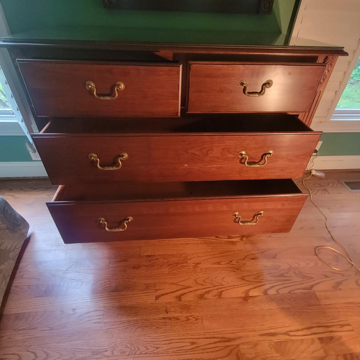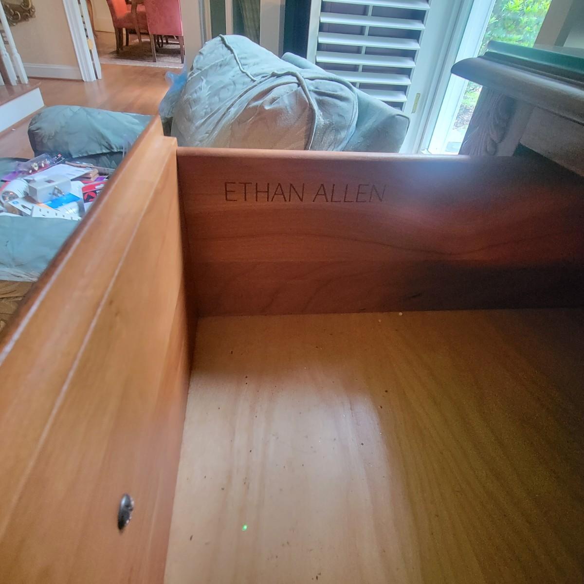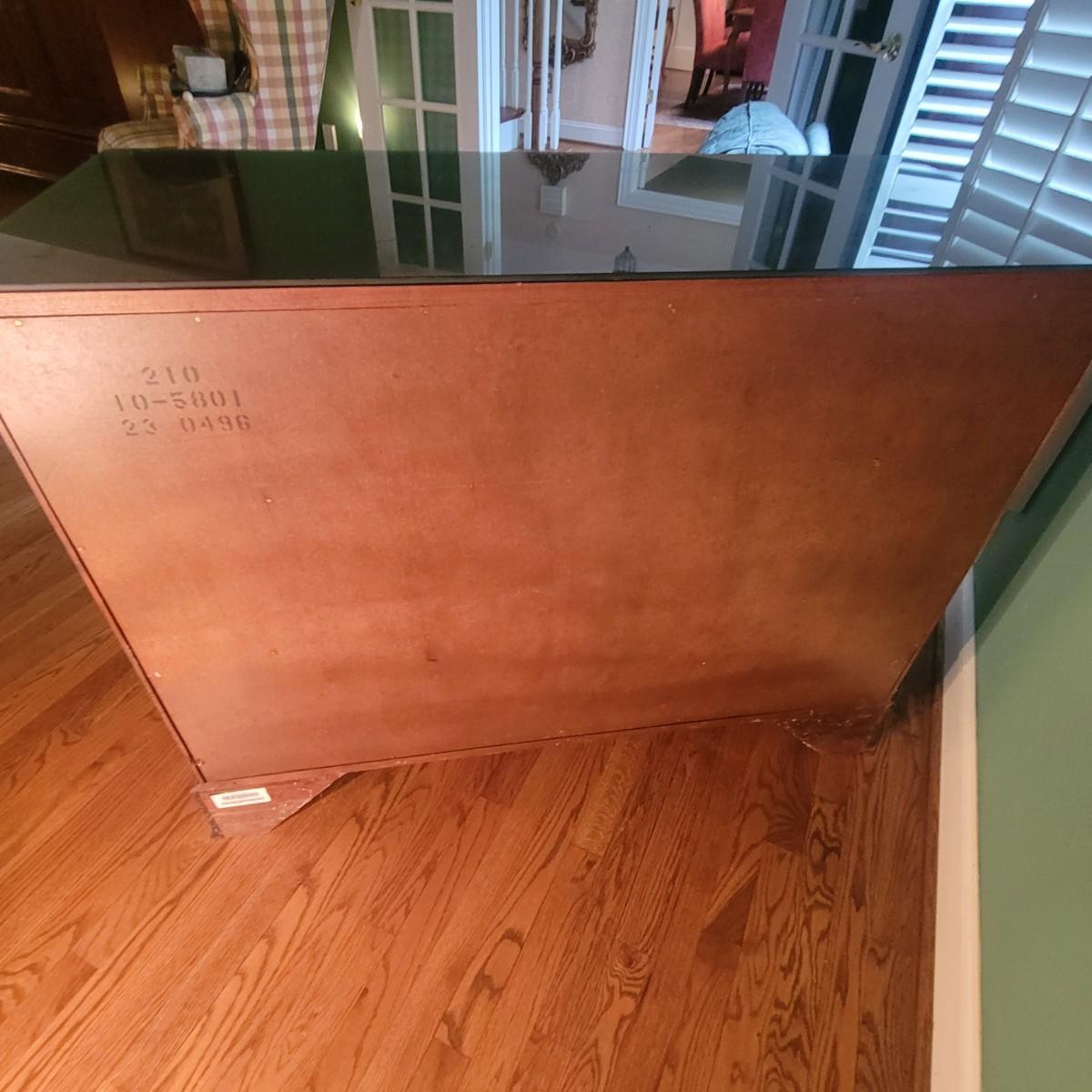 Living room dresser crafted by Ethen Allen with brass hardware, dove tailed joints and 1/4" glass top. Matches end tables and coffee table that are found in different lots in this auction. Measures approximately 44" x 20" x 35". Local pickup only
