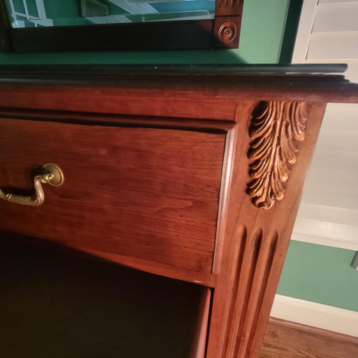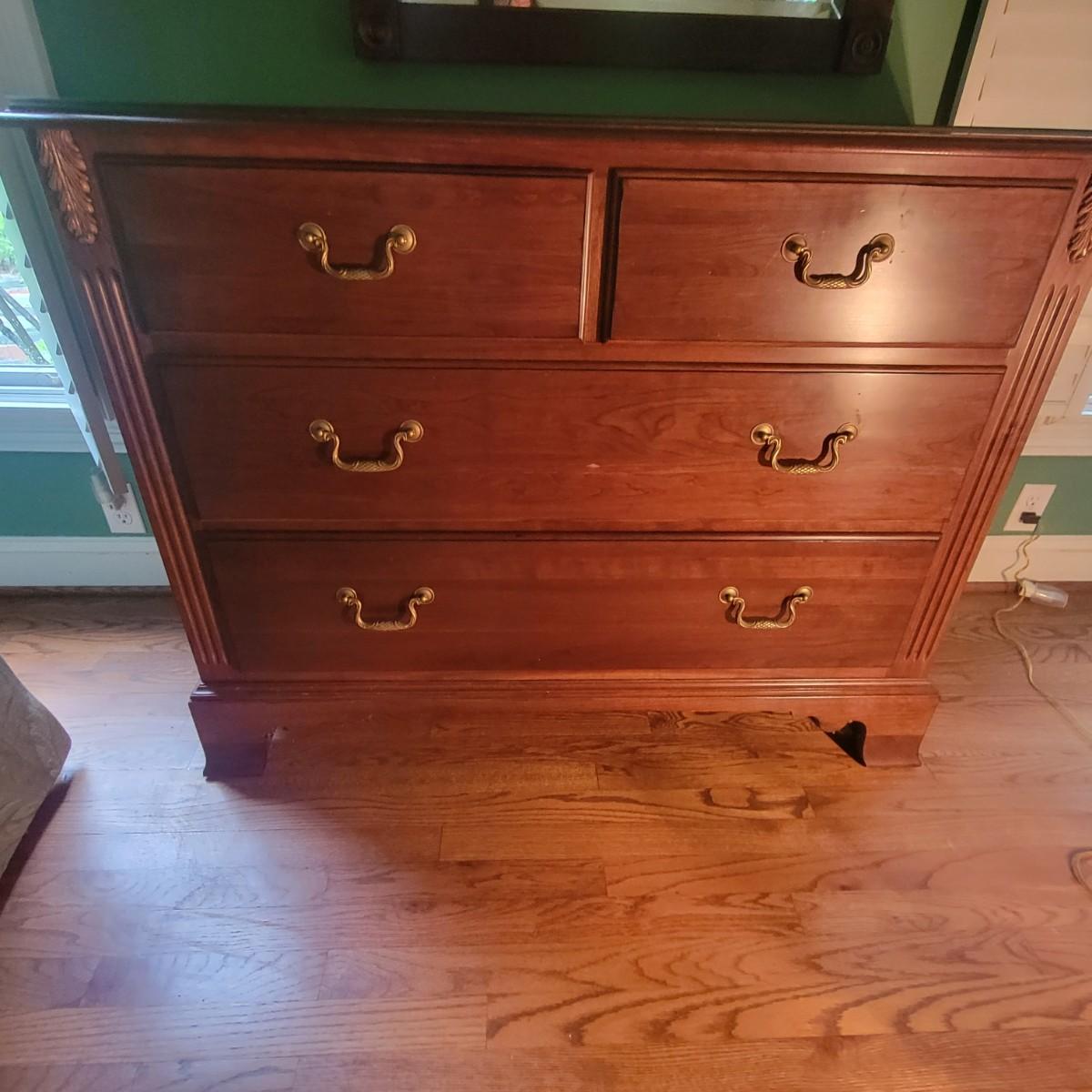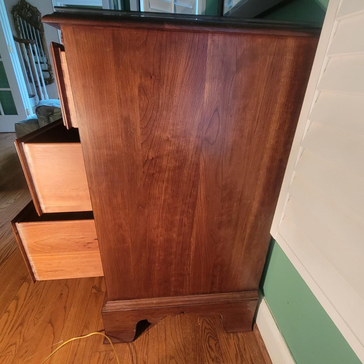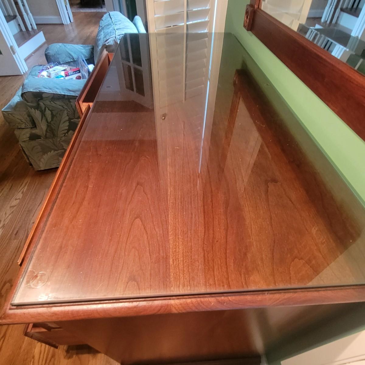Living room dresser crafted by Ethen Allen with brass hardware, dove tailed joints and 1/4" glass top. Matches end tables and coffee table that are found in different lots in this auction. Measures approximately 44" x 20" x 35". Local pickup only