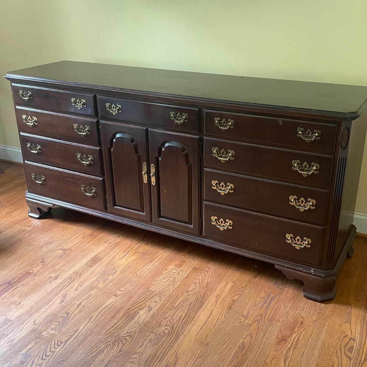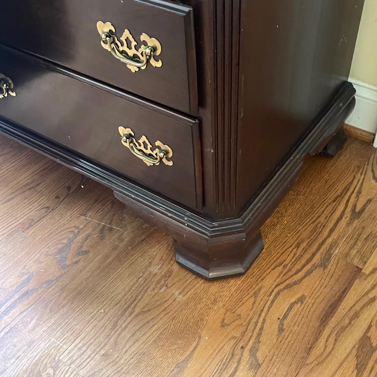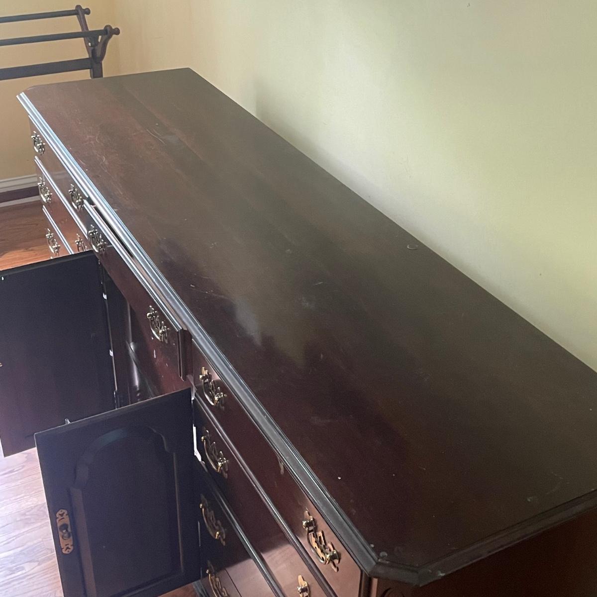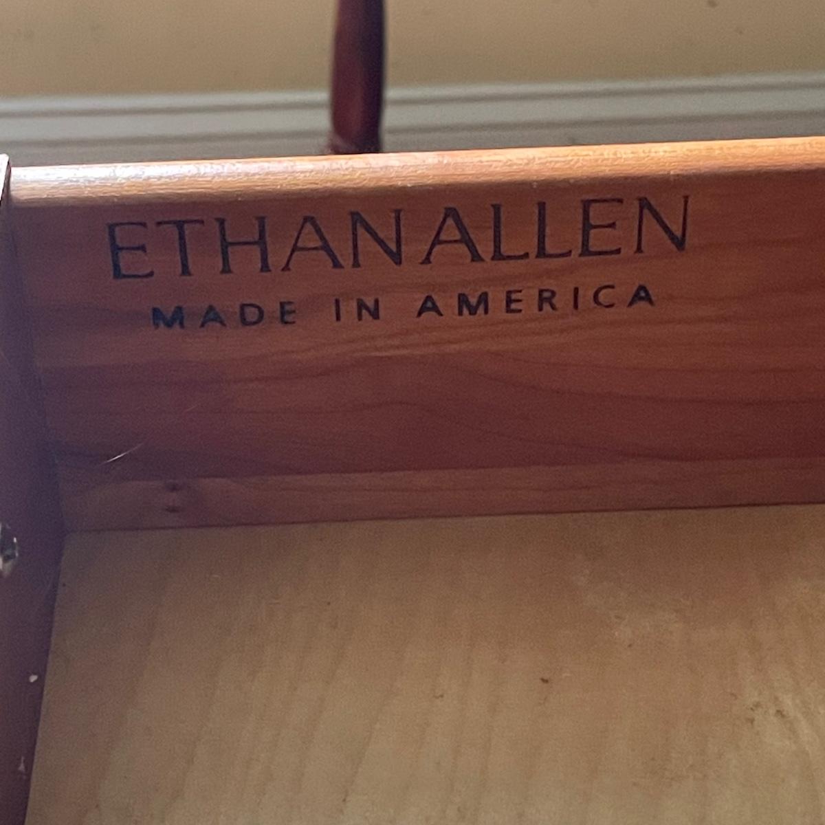 Plenty of storage in this dresser that has 11 dovetailed drawers. It is solid cherry wood with brass hardware and is from the Ethan Allen Georgian Court collection; matching four poster bed and end tables in other lots in this sale. It’s in good condition, but does have some superficial scratches on the top surface. Item is located upstairs, it is heavy, bring help to load.