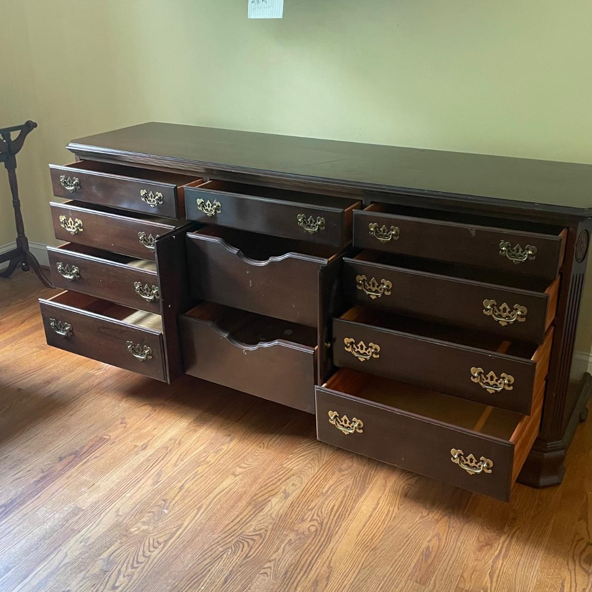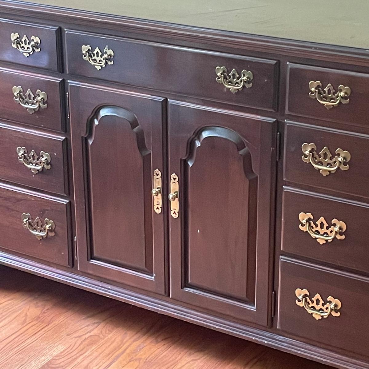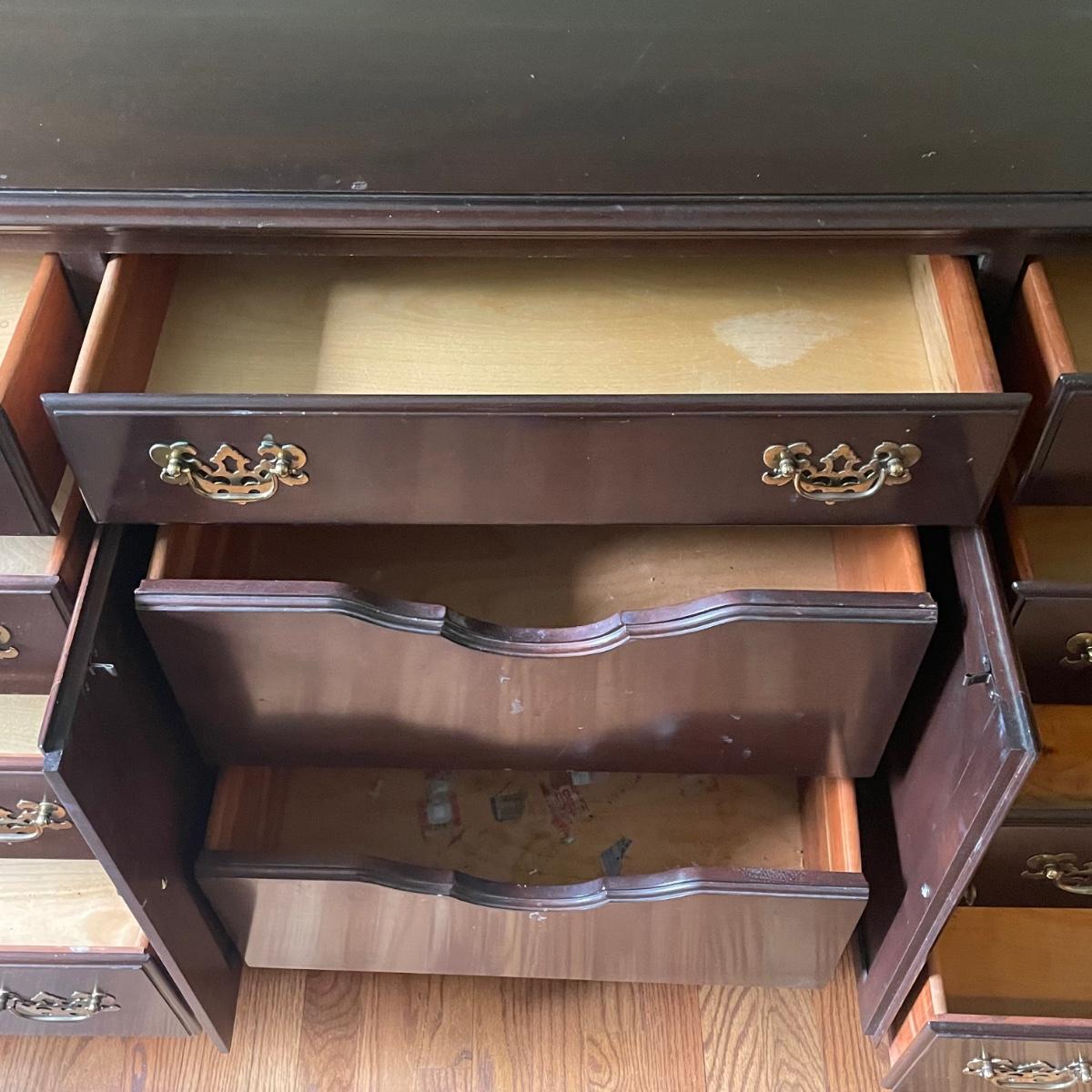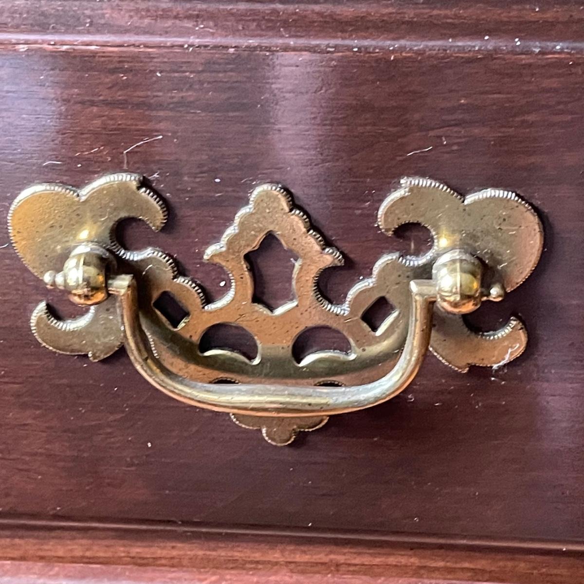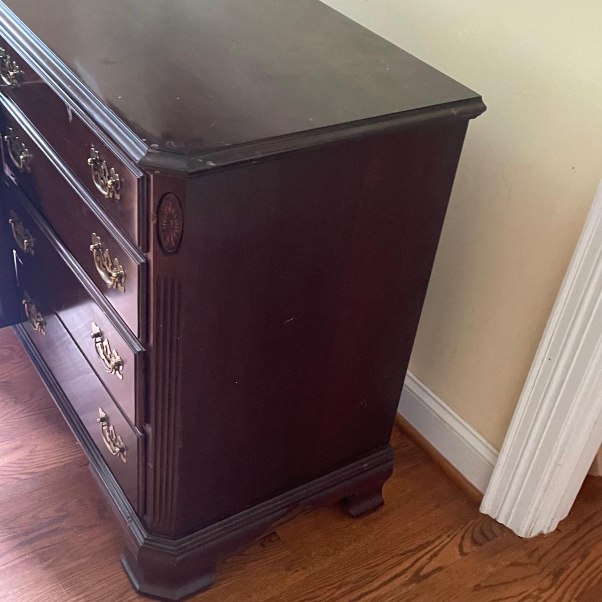 Plenty of storage in this dresser that has 11 dovetailed drawers. It is solid cherry wood with brass hardware and is from the Ethan Allen Georgian Court collection; matching four poster bed and end tables in other lots in this sale. It’s in good condition, but does have some superficial scratches on the top surface. Item is located upstairs, it is heavy, bring help to load.