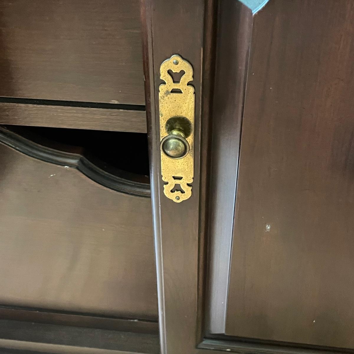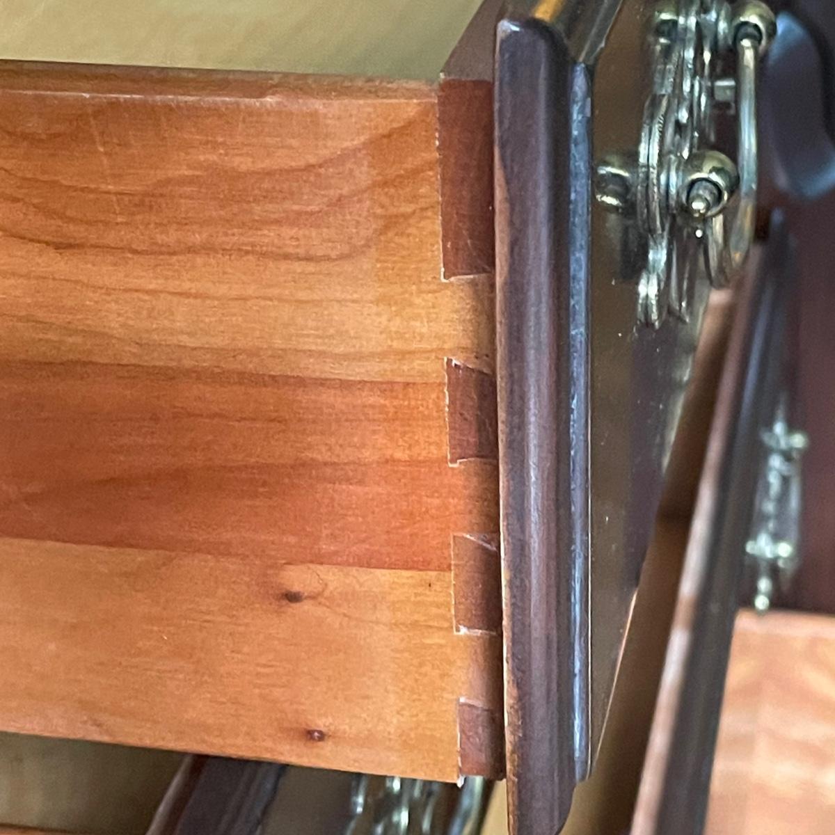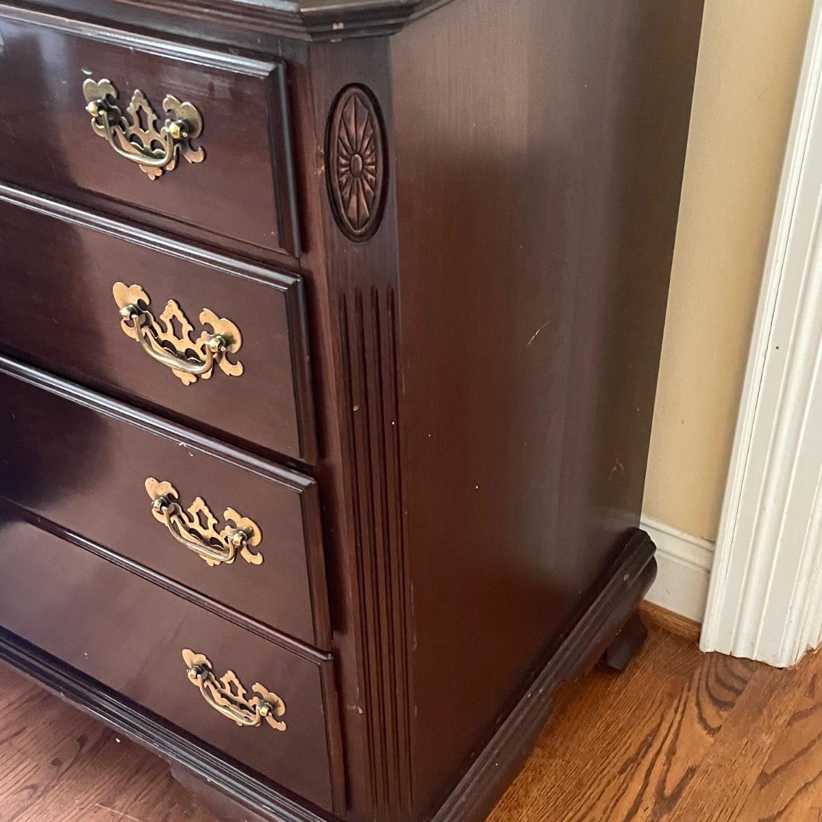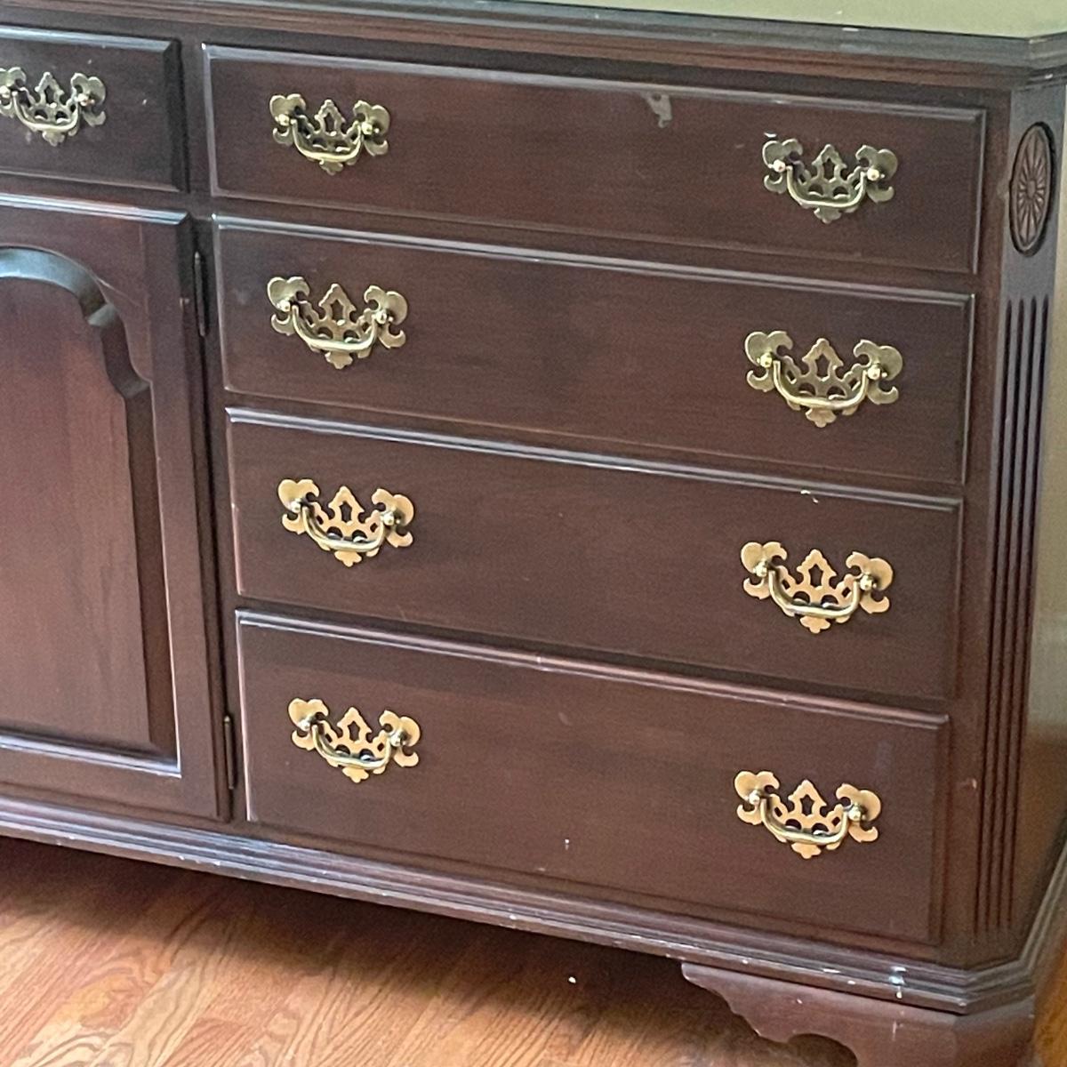 Plenty of storage in this dresser that has 11 dovetailed drawers. It is solid cherry wood with brass hardware and is from the Ethan Allen Georgian Court collection; matching four poster bed and end tables in other lots in this sale. It’s in good condition, but does have some superficial scratches on the top surface. Item is located upstairs, it is heavy, bring help to load.
