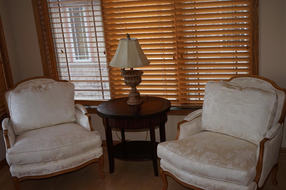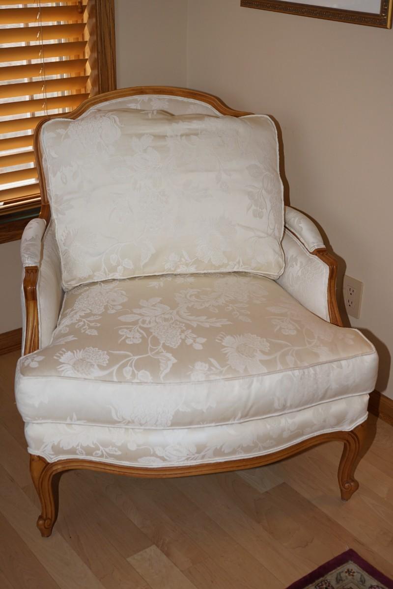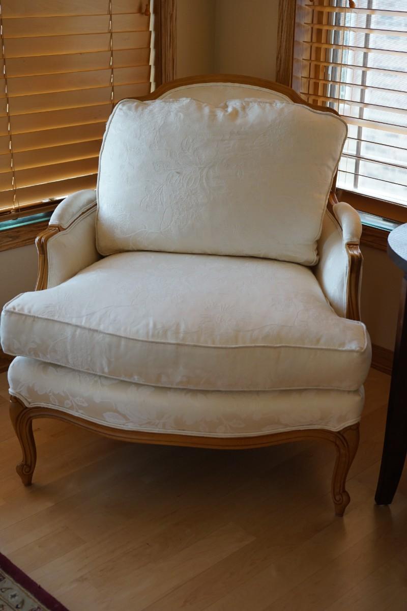 ETHAN ALLEN LOUISV STYLE SIDE CHAIRS ( PAIR) OF WHITE DAMASK STYLE FABRIC