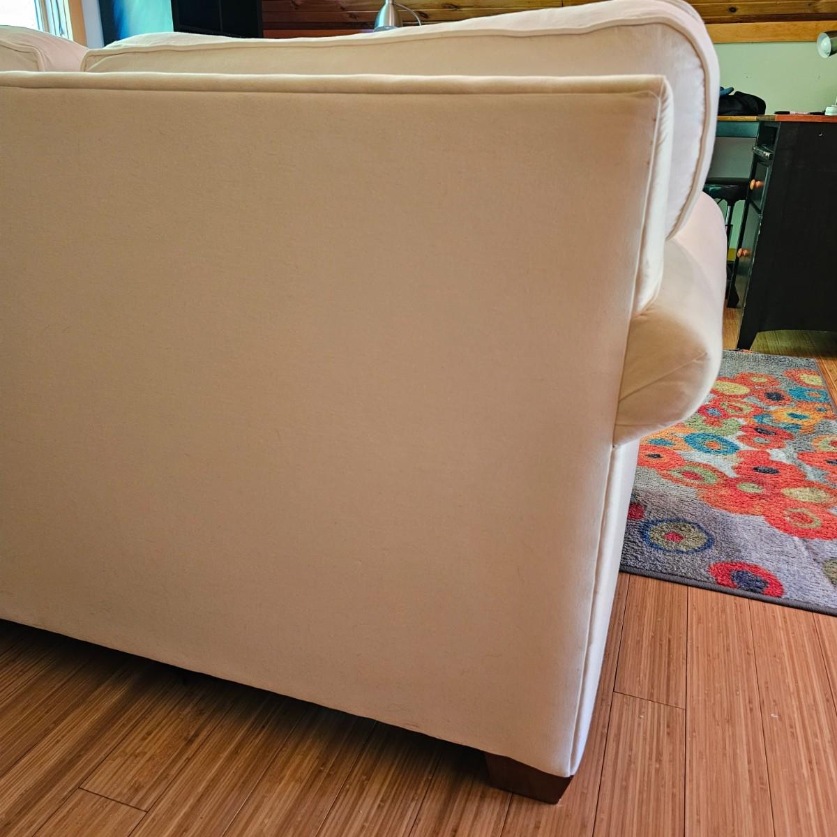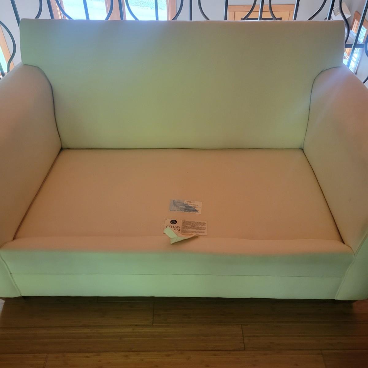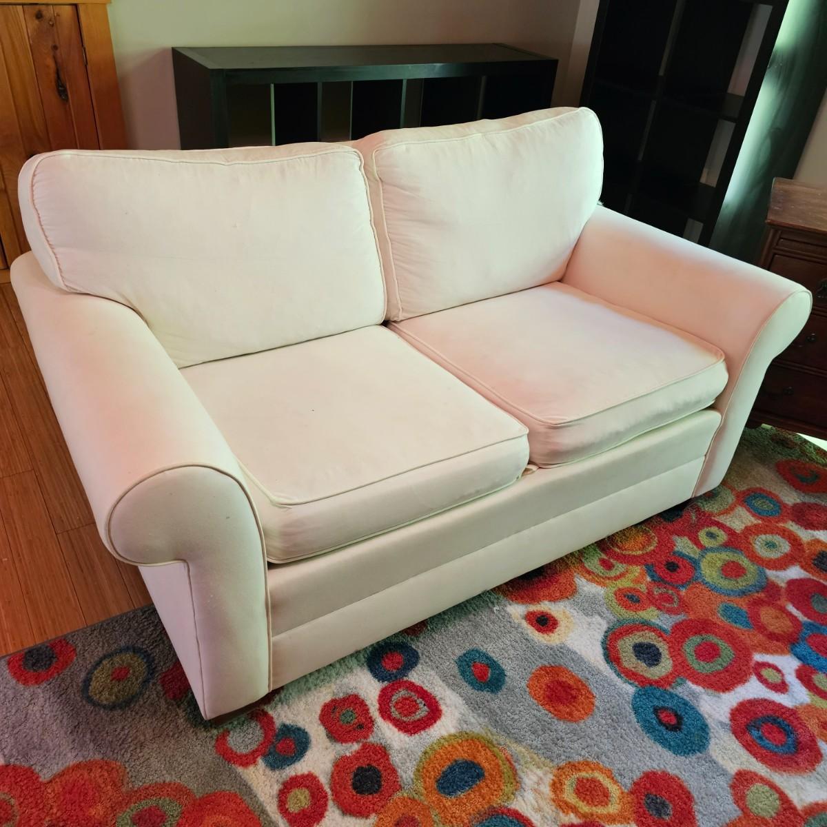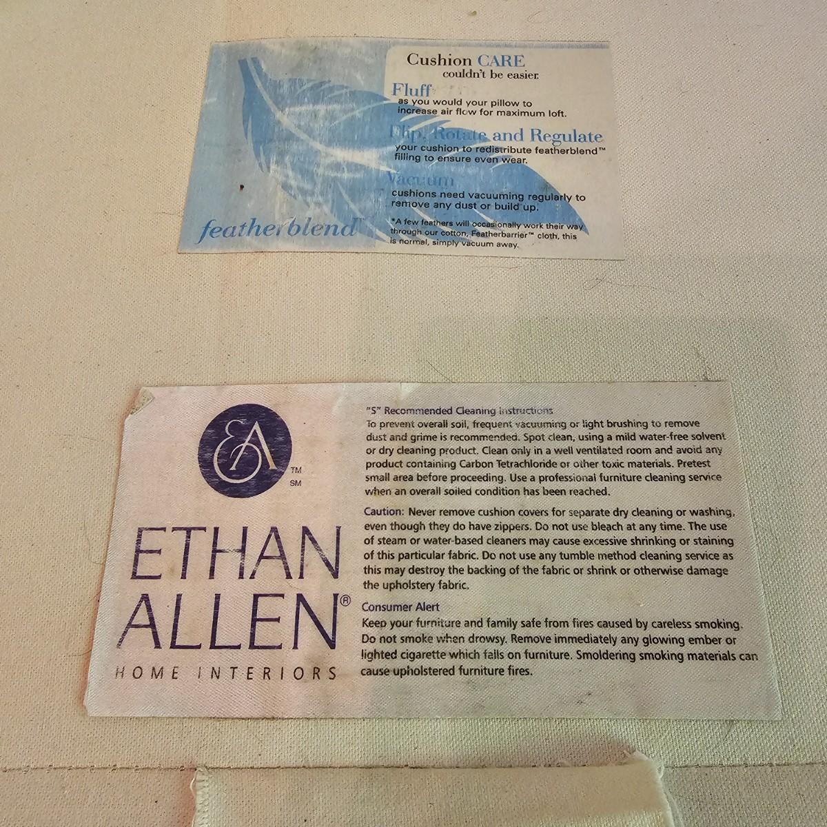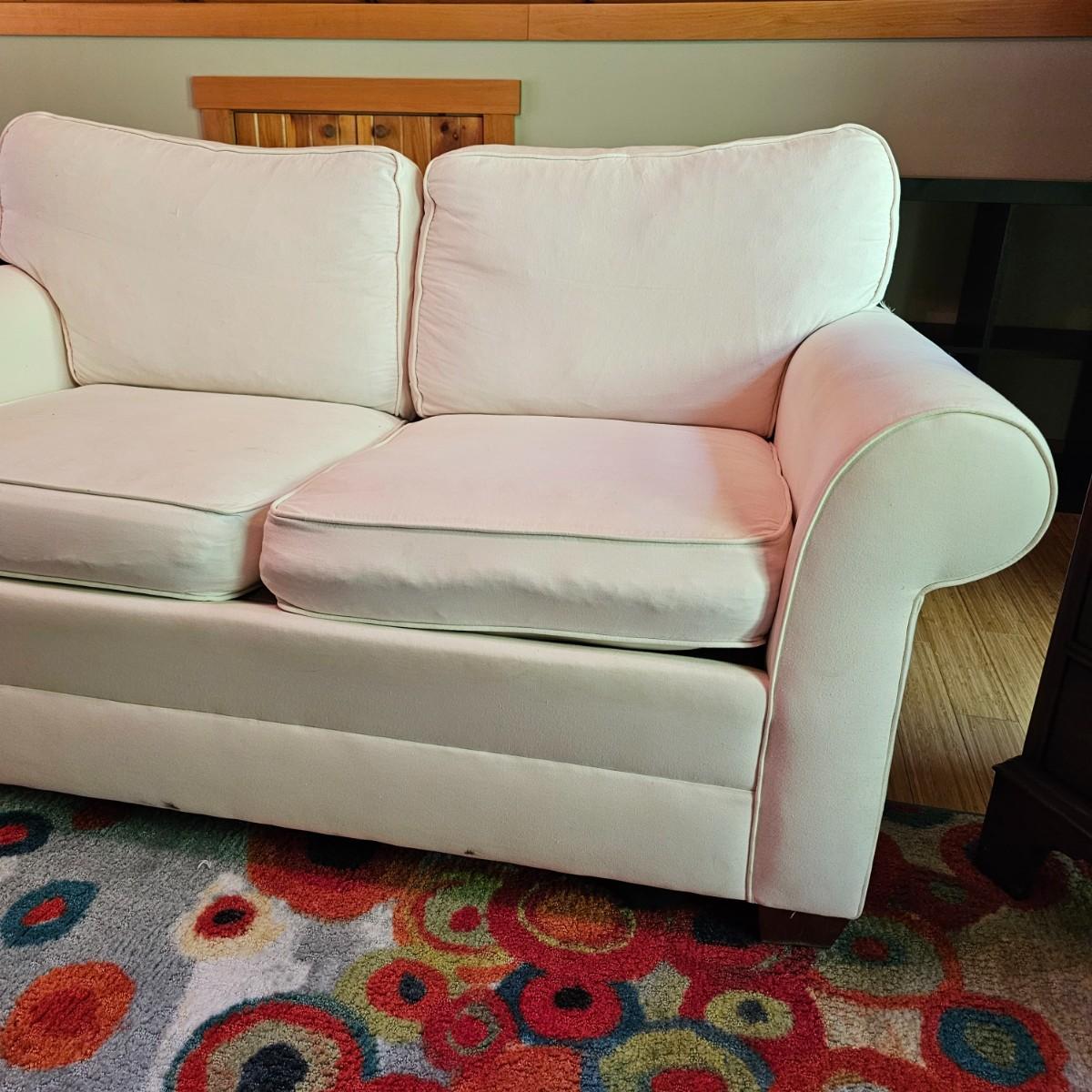 One off-white Ethan Allen upholstered loveseat. Rounded arms and down filled cushions and back rests, measures 60" x 37" x 33"H with 19" seat height. Some discoloration and spotting on fabric surface, see photos for details. Local pickup only. Winning bidder must bring assistance to help move and load this item due to its weight and/or size. Item is in upstairs room.