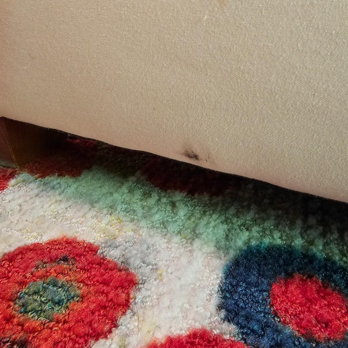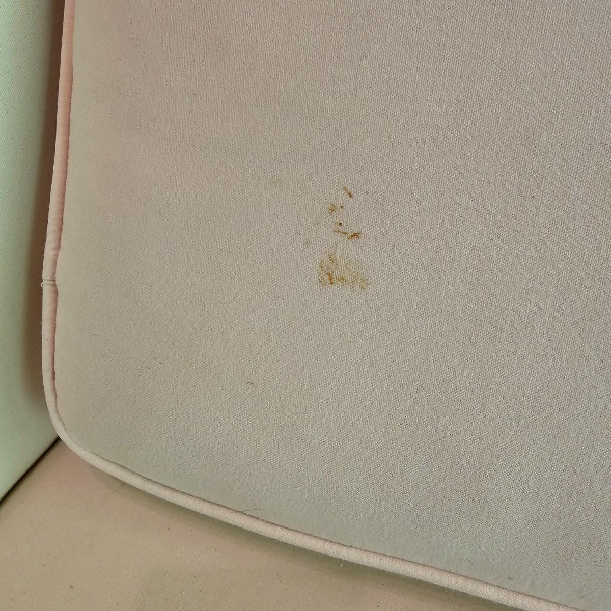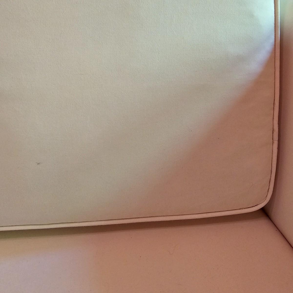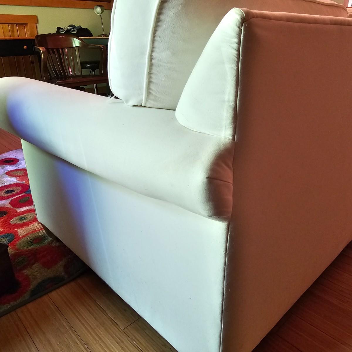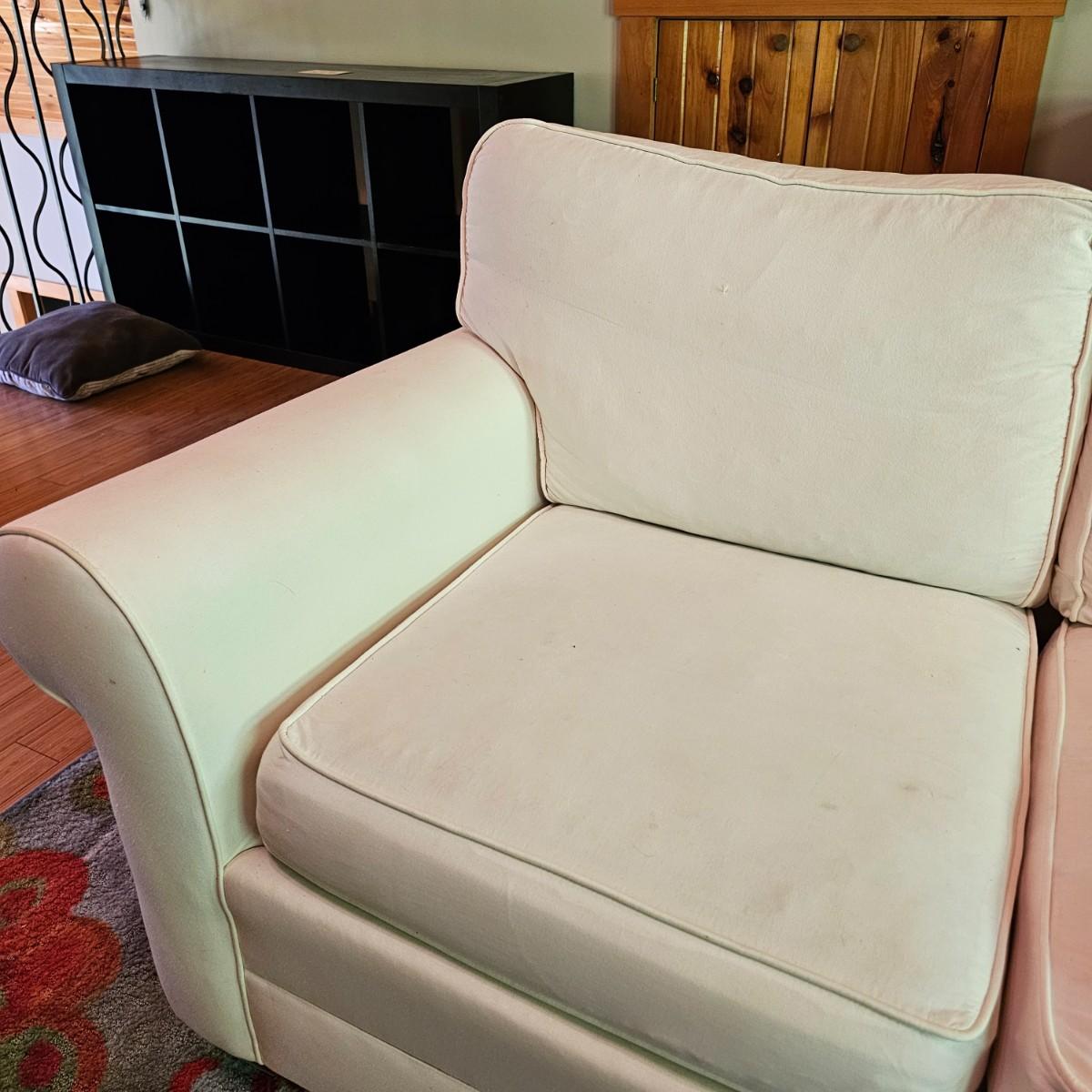 One off-white Ethan Allen upholstered loveseat. Rounded arms and down filled cushions and back rests, measures 60" x 37" x 33"H with 19" seat height. Some discoloration and spotting on fabric surface, see photos for details. Local pickup only. Winning bidder must bring assistance to help move and load this item due to its weight and/or size. Item is in upstairs room.