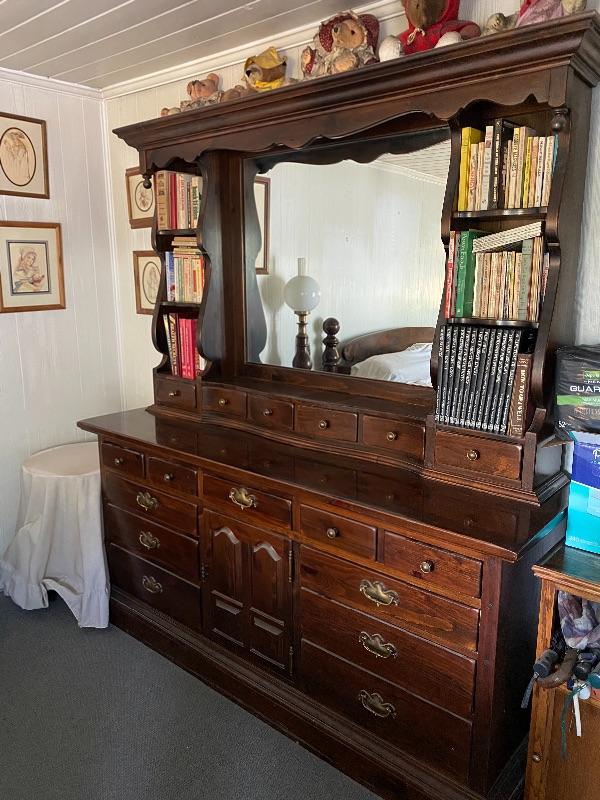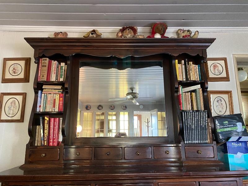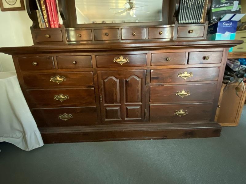 Large Ethan Allen Old Tavern Dresser with Mirrored Hutch. 6’ length. 79” tall