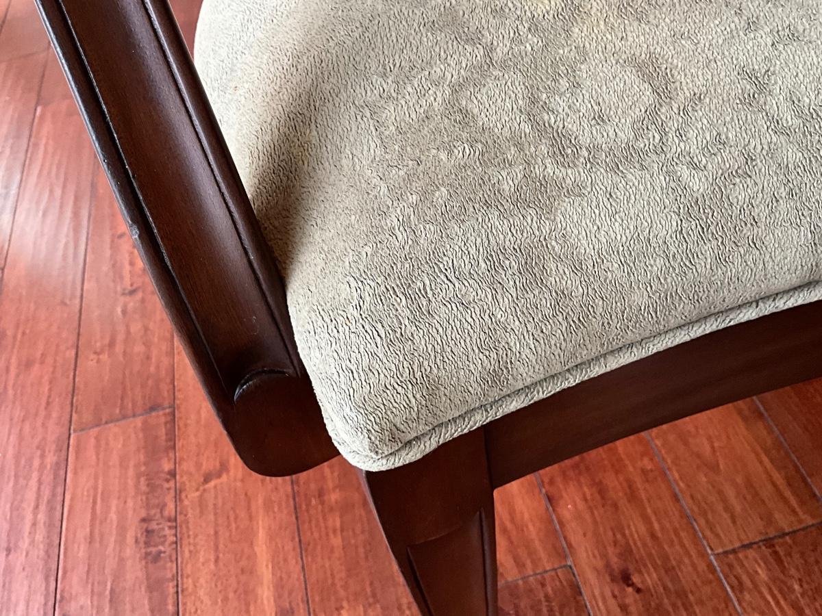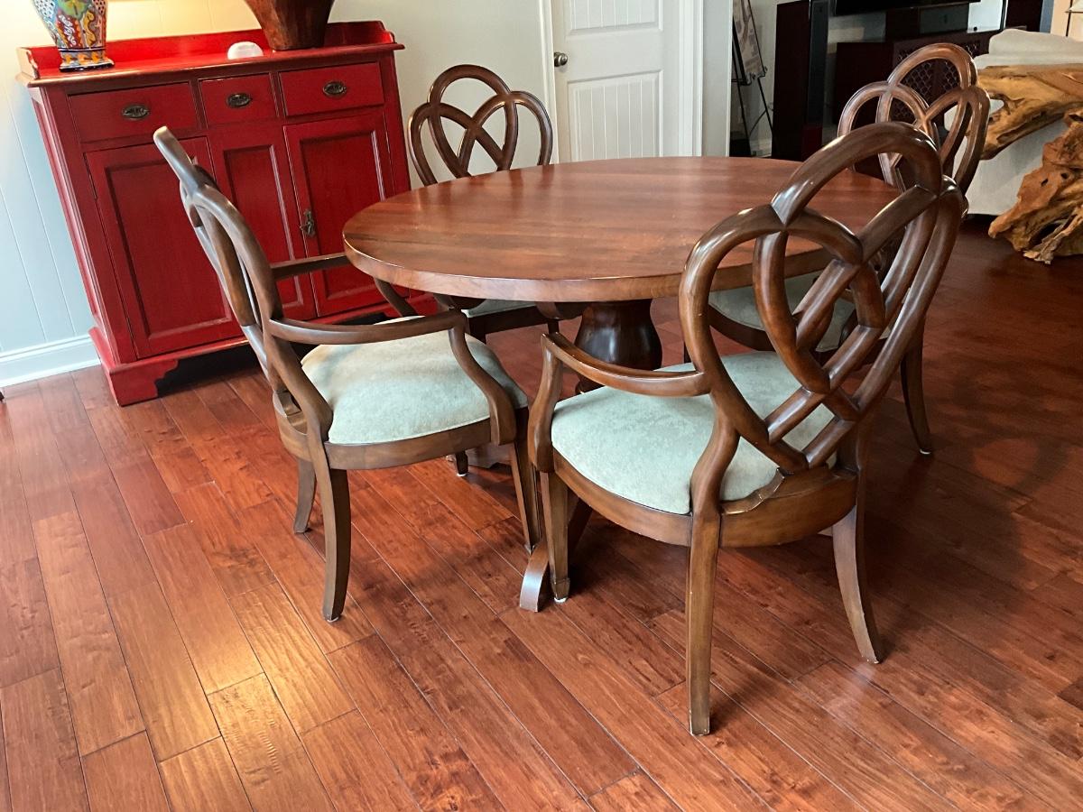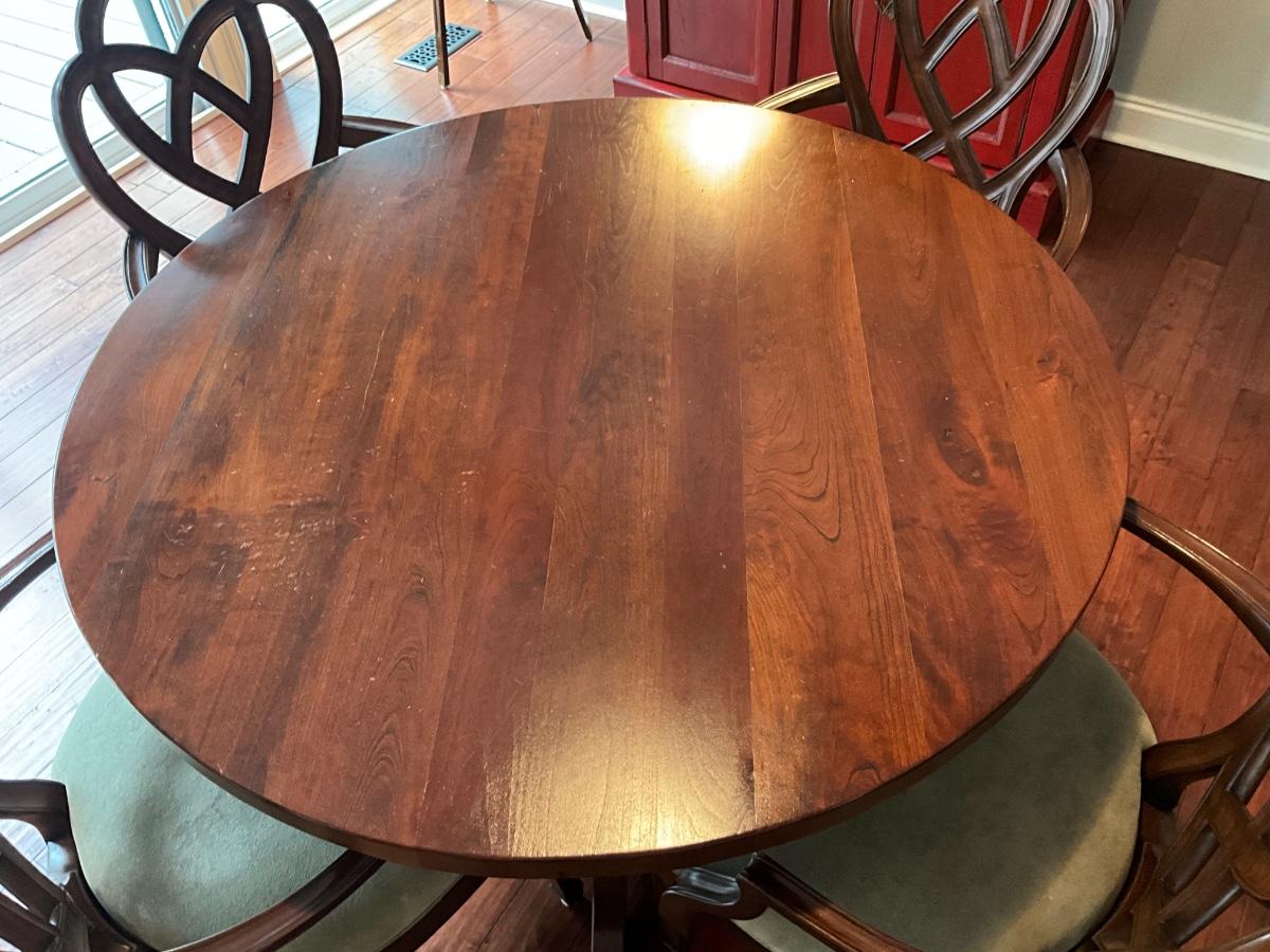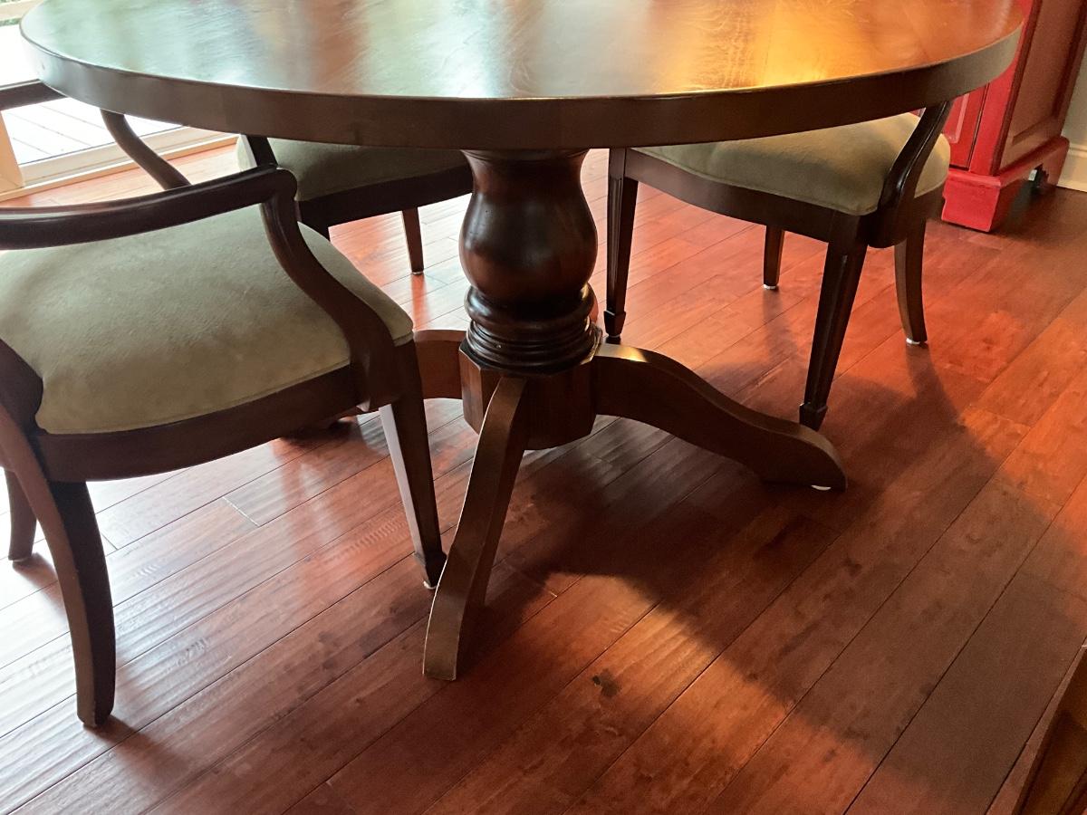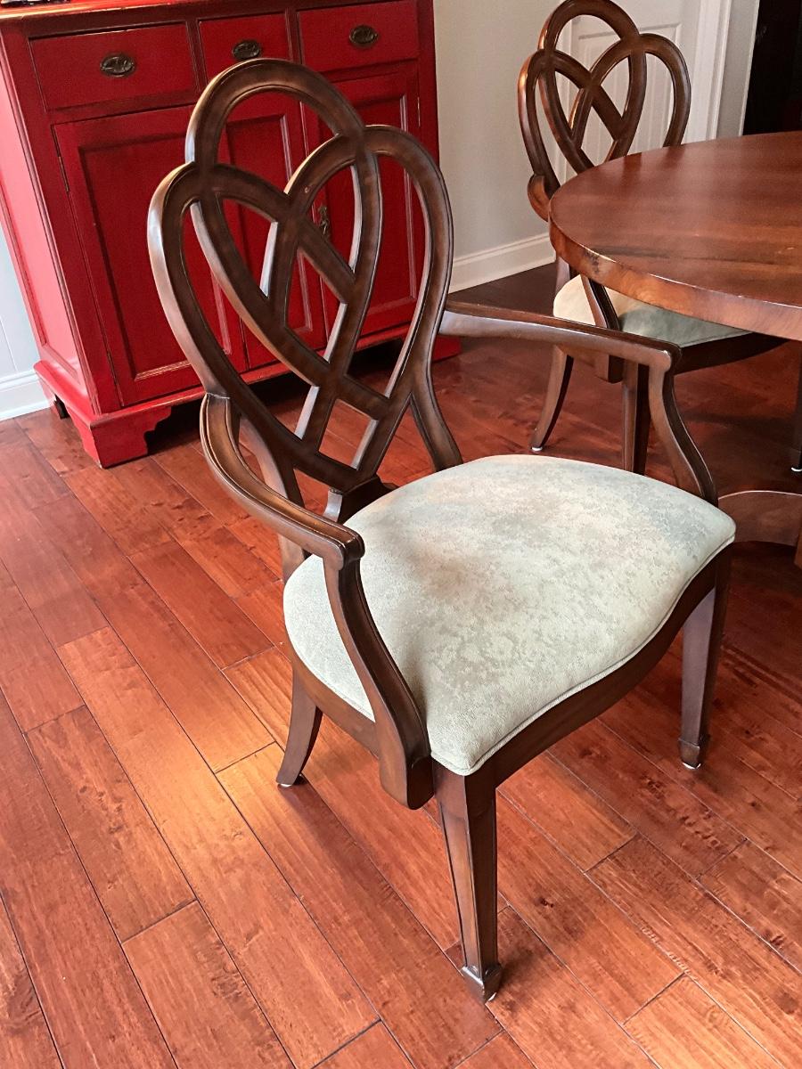 Solid wood dining room table will find some marks and scratches on the top- Custom made from Bennet Street - 48 inches round 30 inches tall. Armchairs are 25 inches wide, 40 inches tall 22 inches deep. Seat width is 22 inches seat depth is 18 inches and it’s 19 inches from the floor to the seat. Lowest I can find the chairs out there used is for $540 a pair