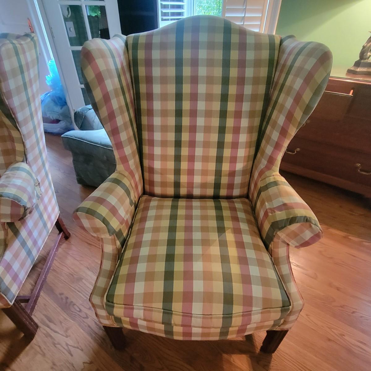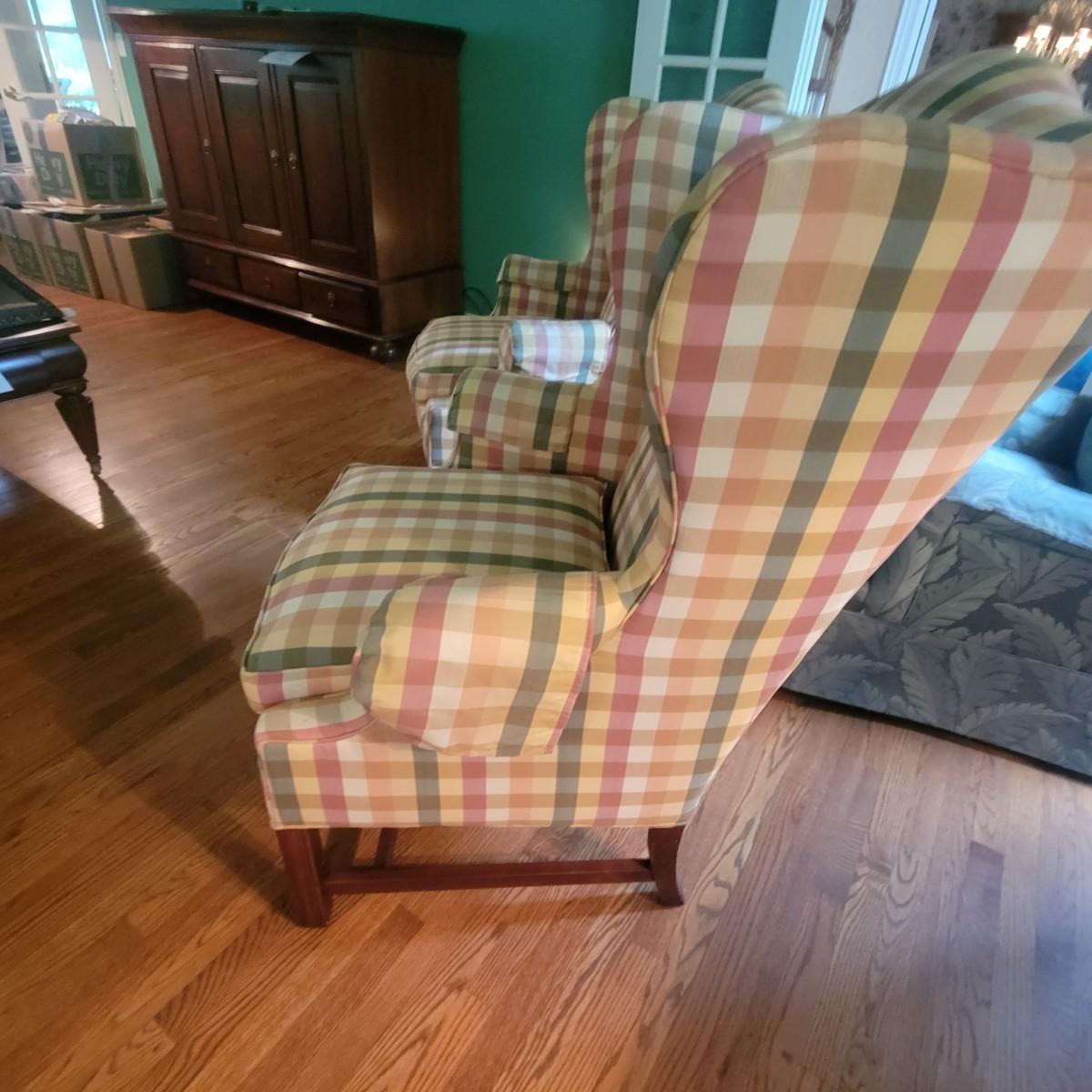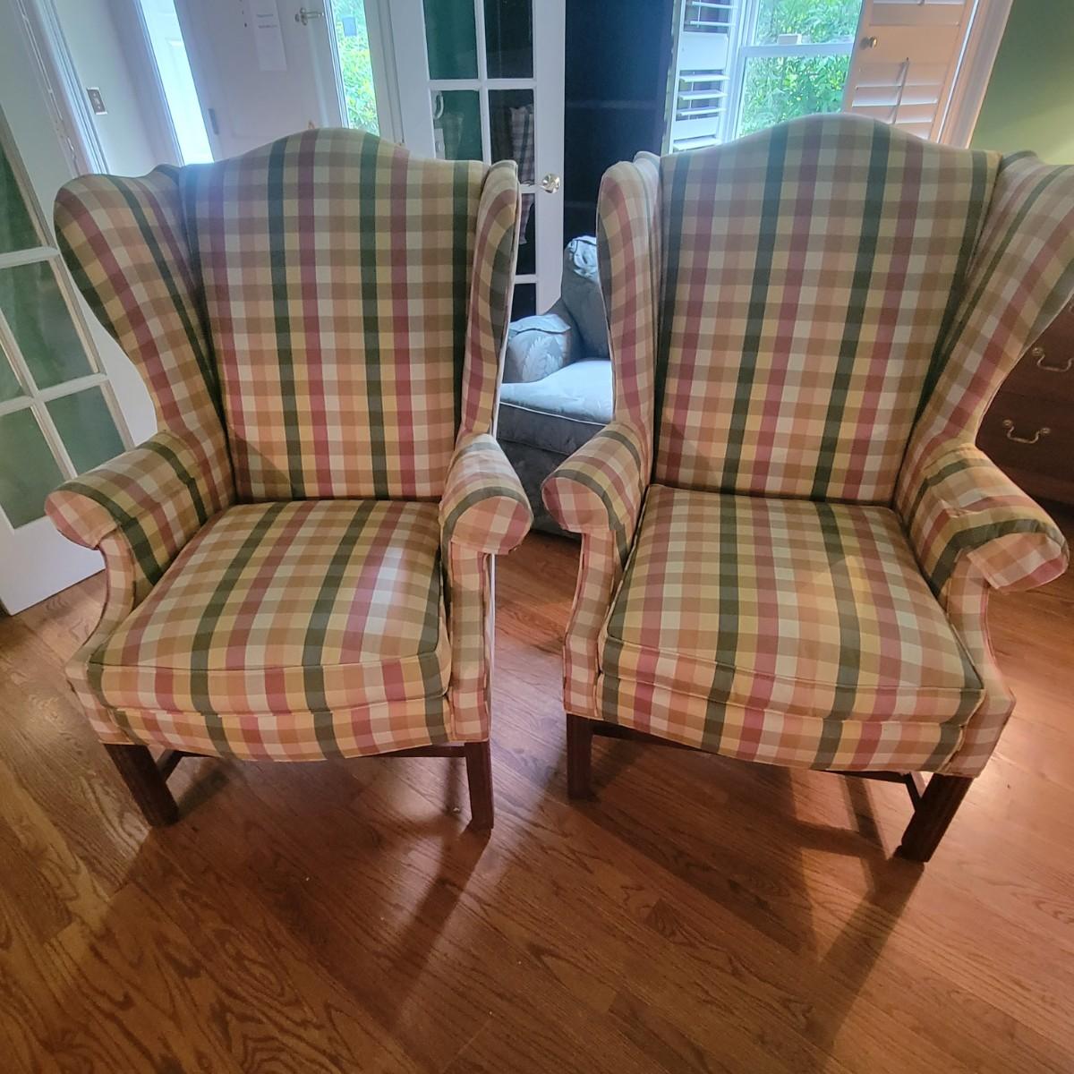 Two wingback chairs with plaid fabric and cherry legs. Fabric and chairs are in good condition. Measure approximately 32" x 40" x 48" with a seat height of 20”. Wooden legs are dirty, see pictures. Local pickup only