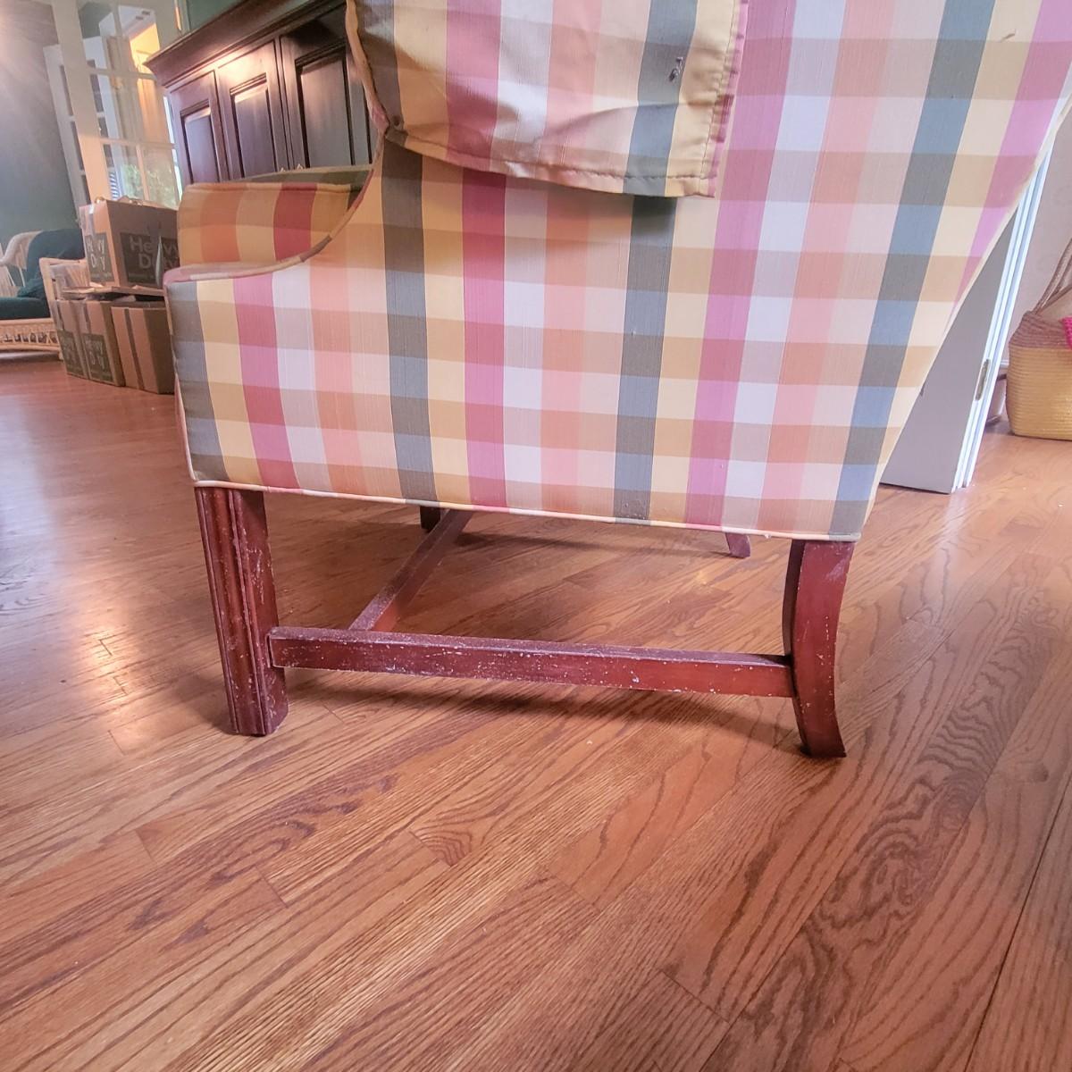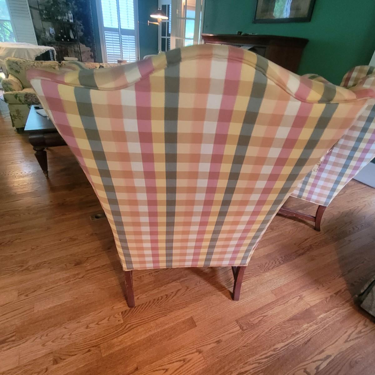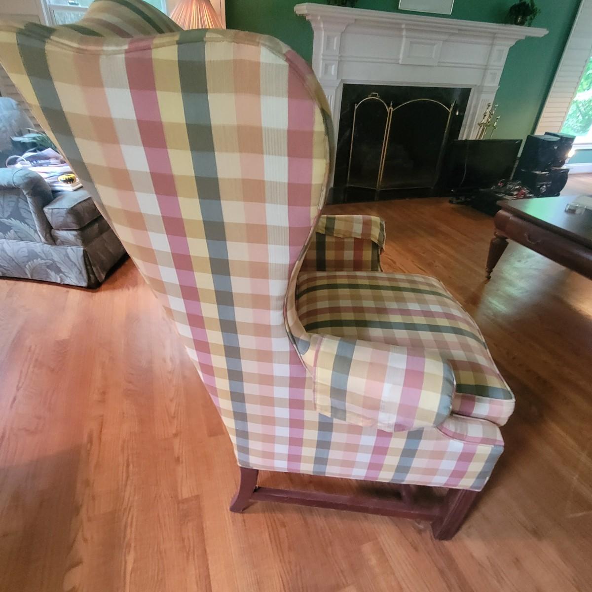Two wingback chairs with plaid fabric and cherry legs. Fabric and chairs are in good condition. Measure approximately 32" x 40" x 48" with a seat height of 20”. Wooden legs are dirty, see pictures. Local pickup only