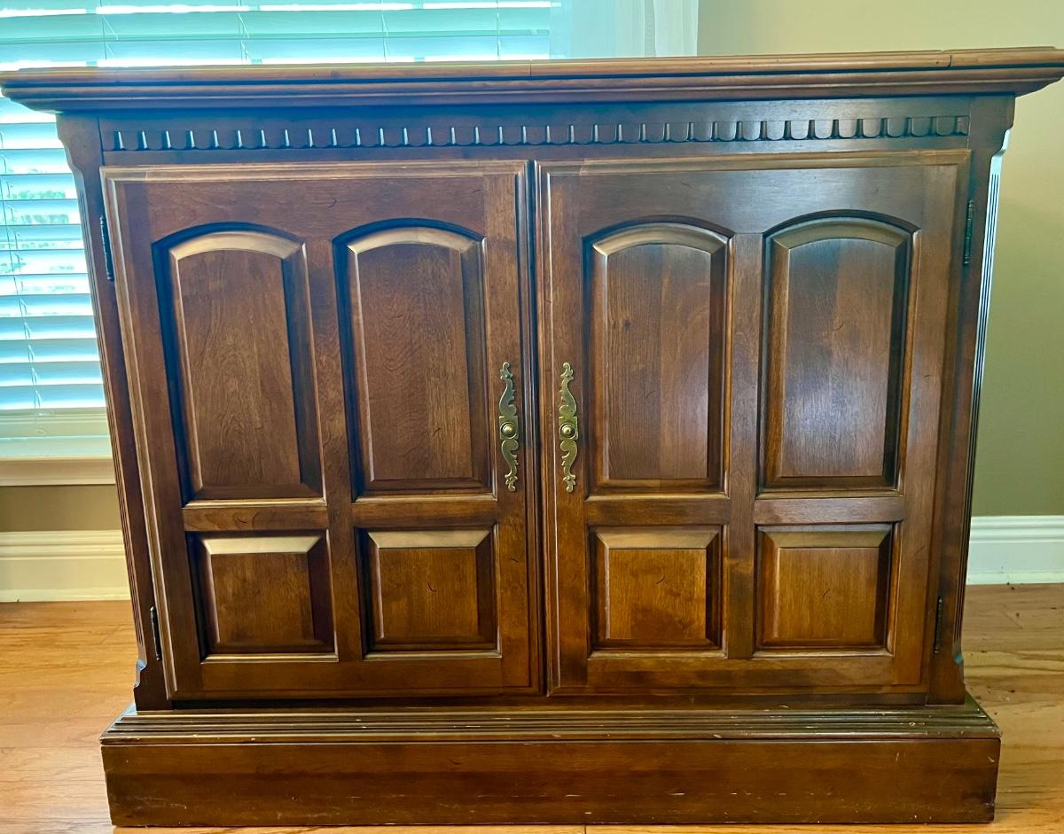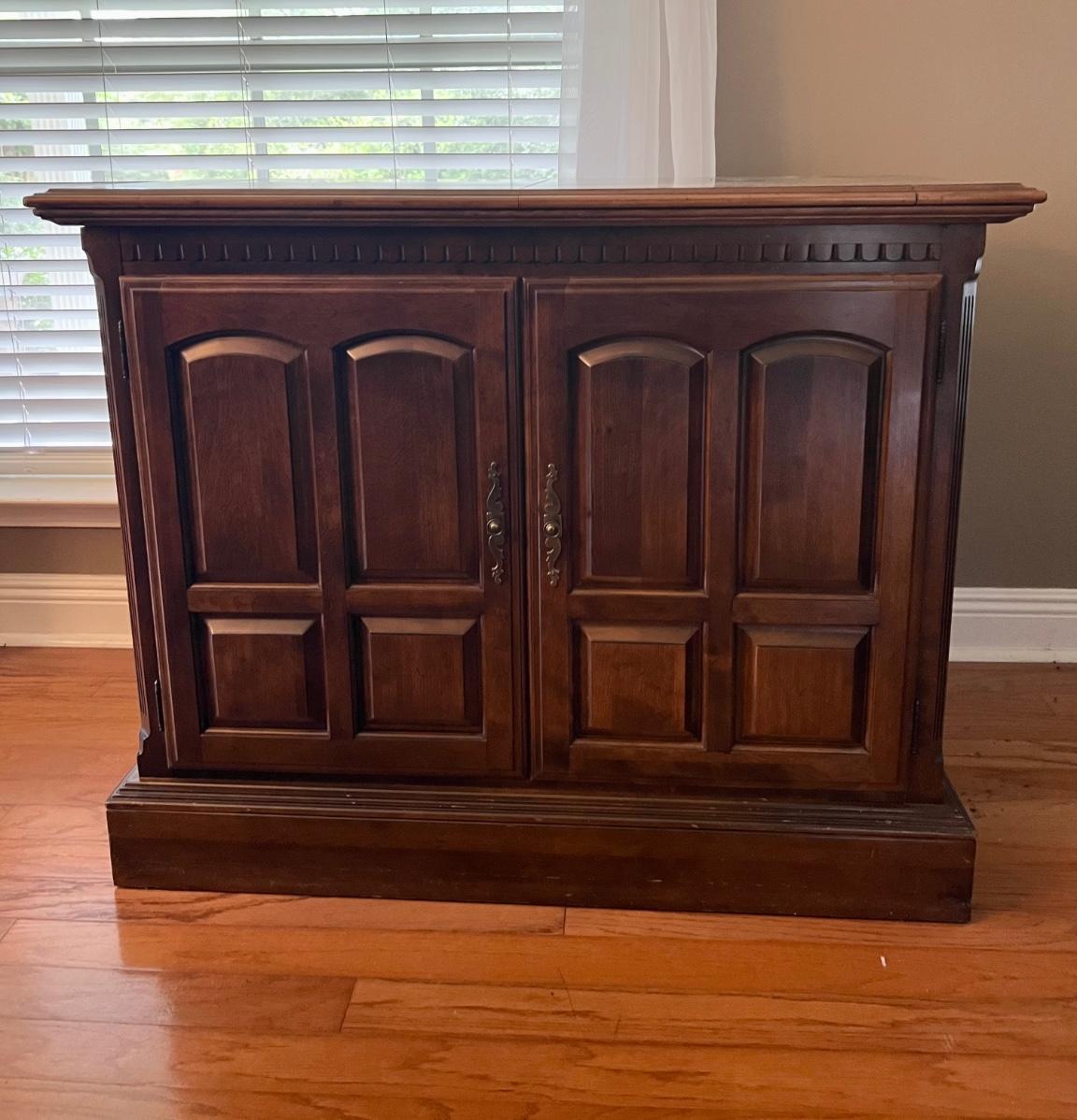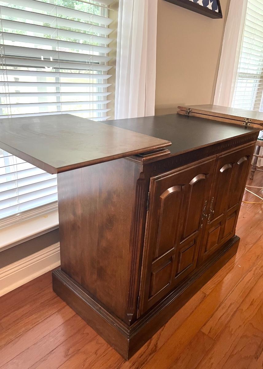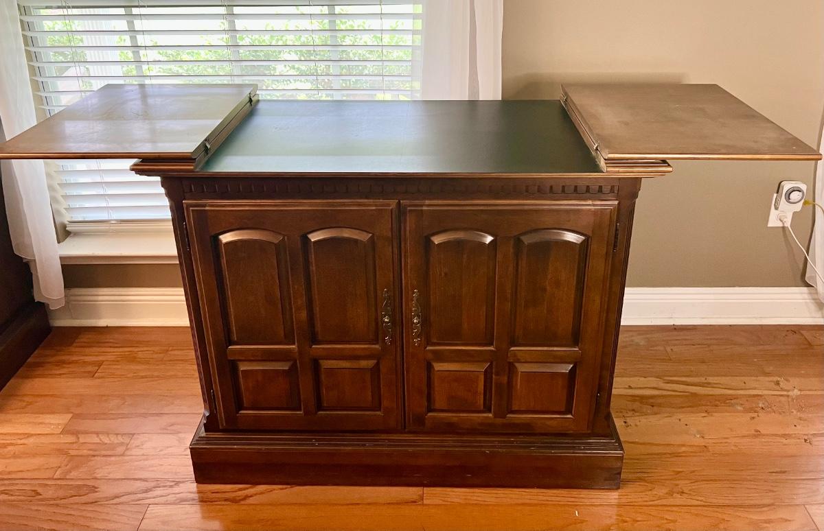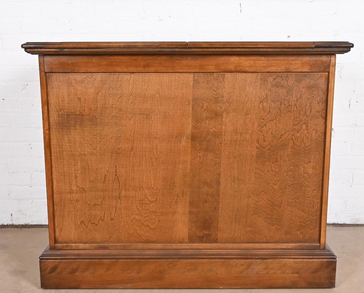Ethan Allen Regency Maple with Black Flip Top Server or Bar Cabinet with drawer. Piece is very heavy but is on wheels for easy moving at home. Measures when closed 34 inches tall, 42 inches long and 21 inches deep. Measures 63 inches when opened.