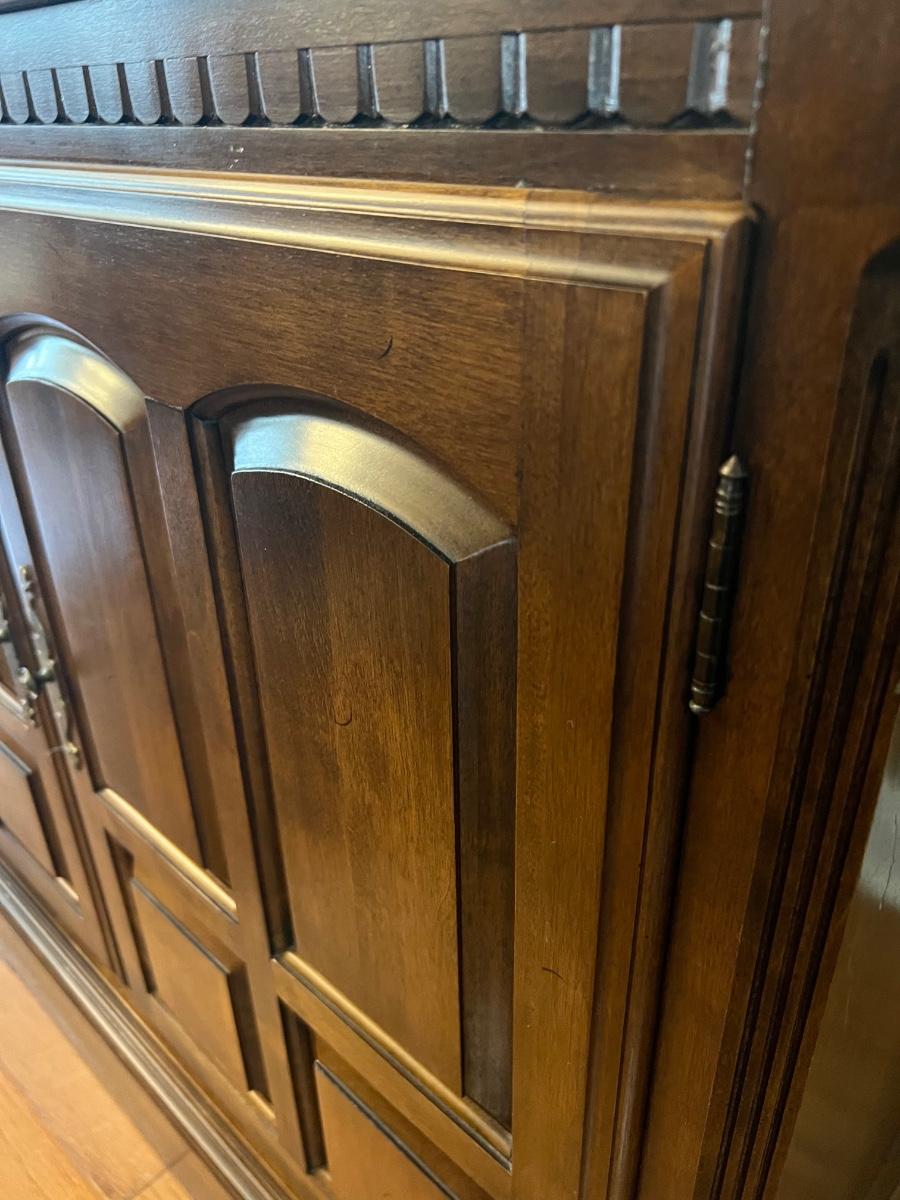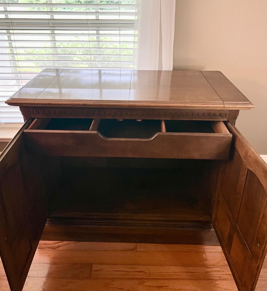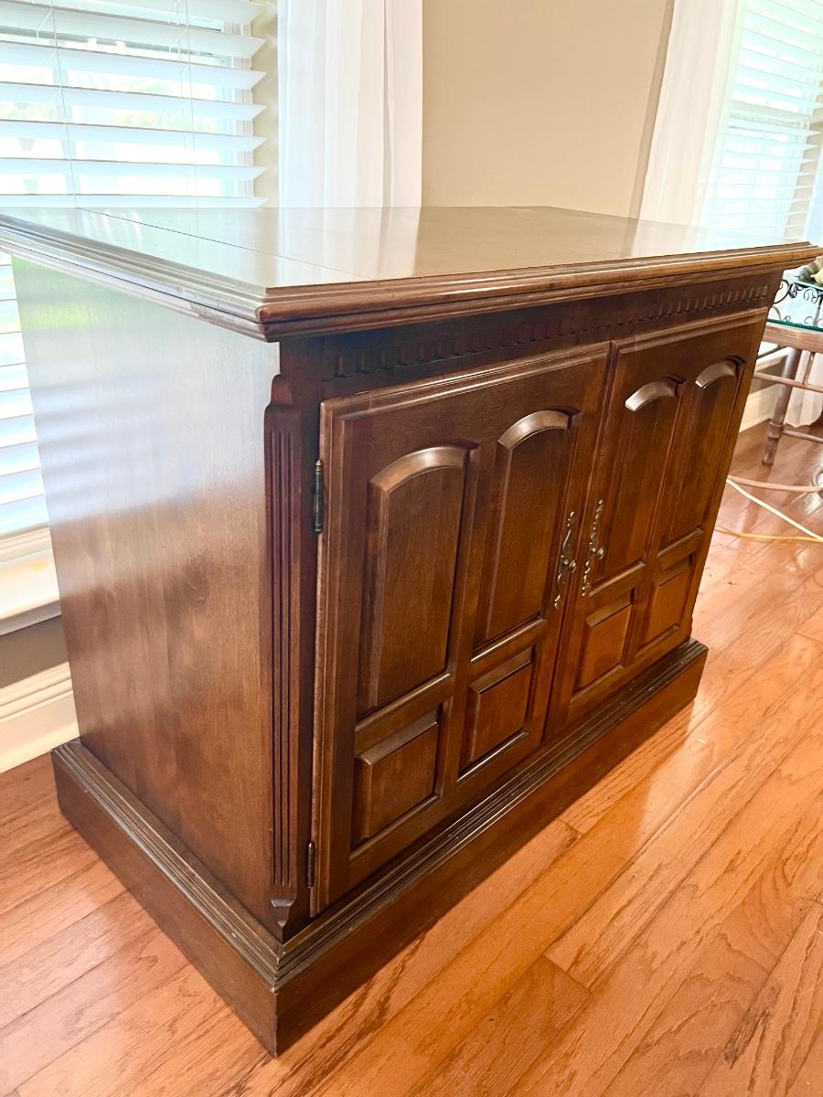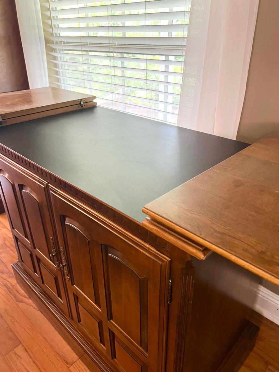 Ethan Allen Regency Maple with Black Flip Top Server or Bar Cabinet with drawer. Piece is very heavy but is on wheels for easy moving at home. Measures when closed 34 inches tall, 42 inches long and 21 inches deep. Measures 63 inches when opened.