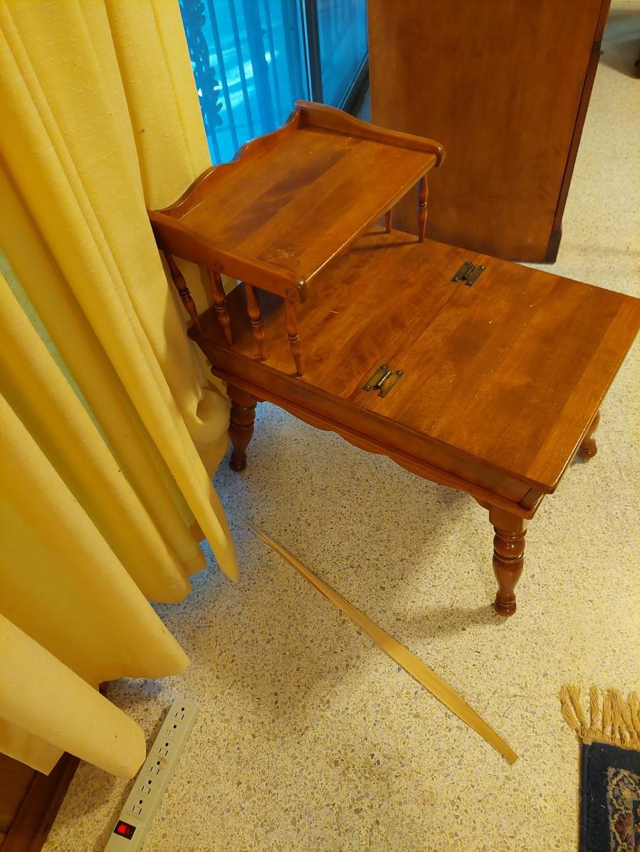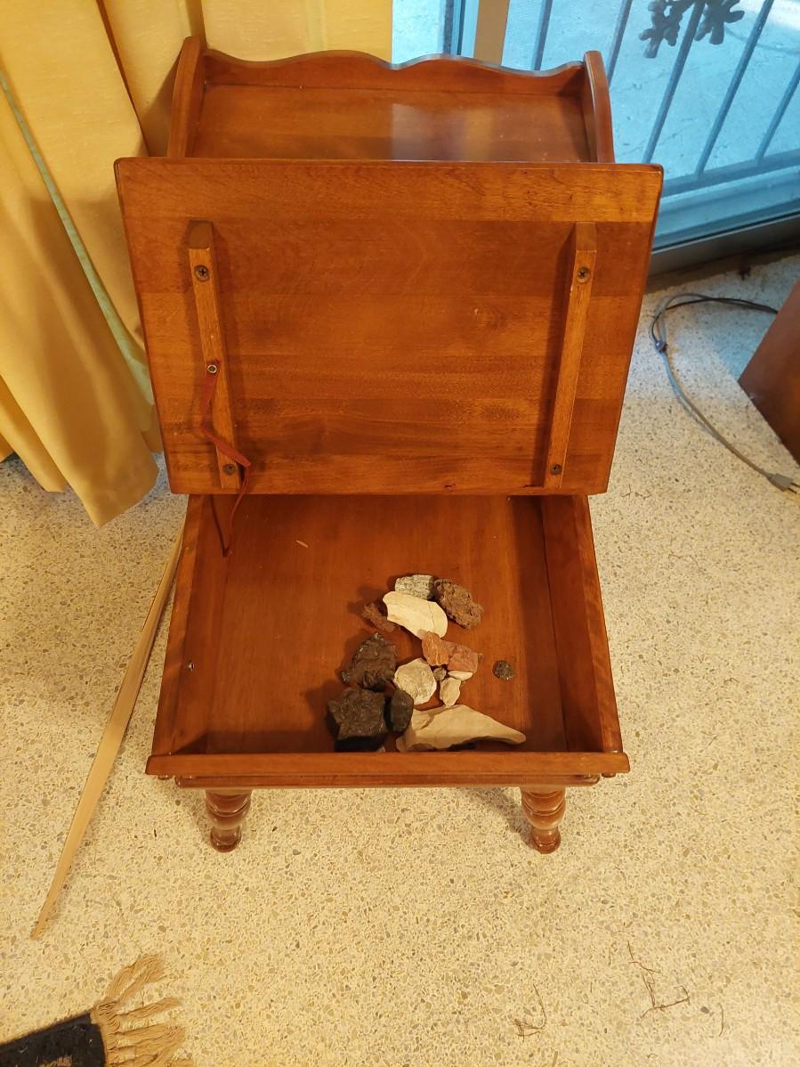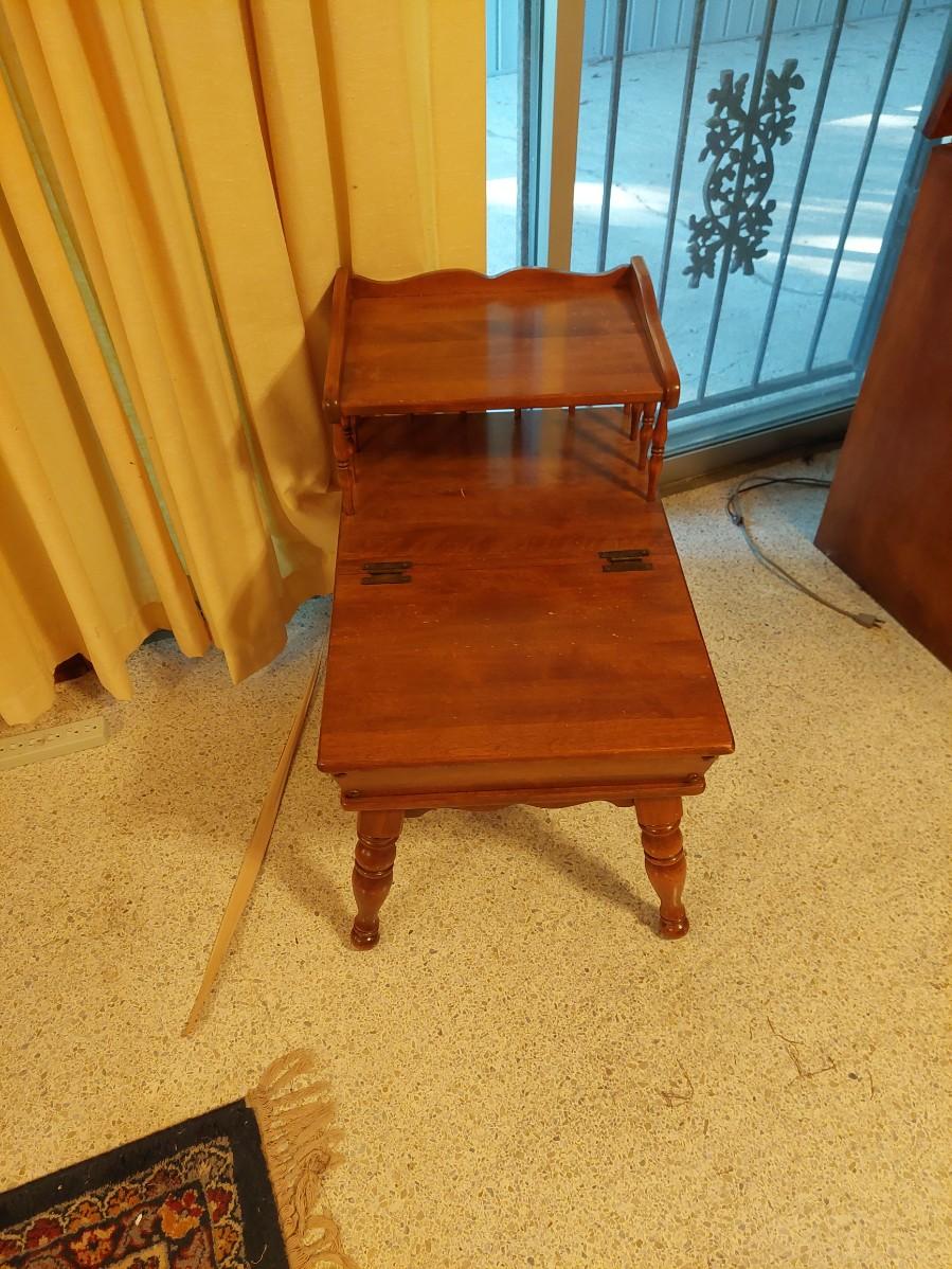 A great side table made of all wood. Dimensions are 26" tall 18" wide &27" deep