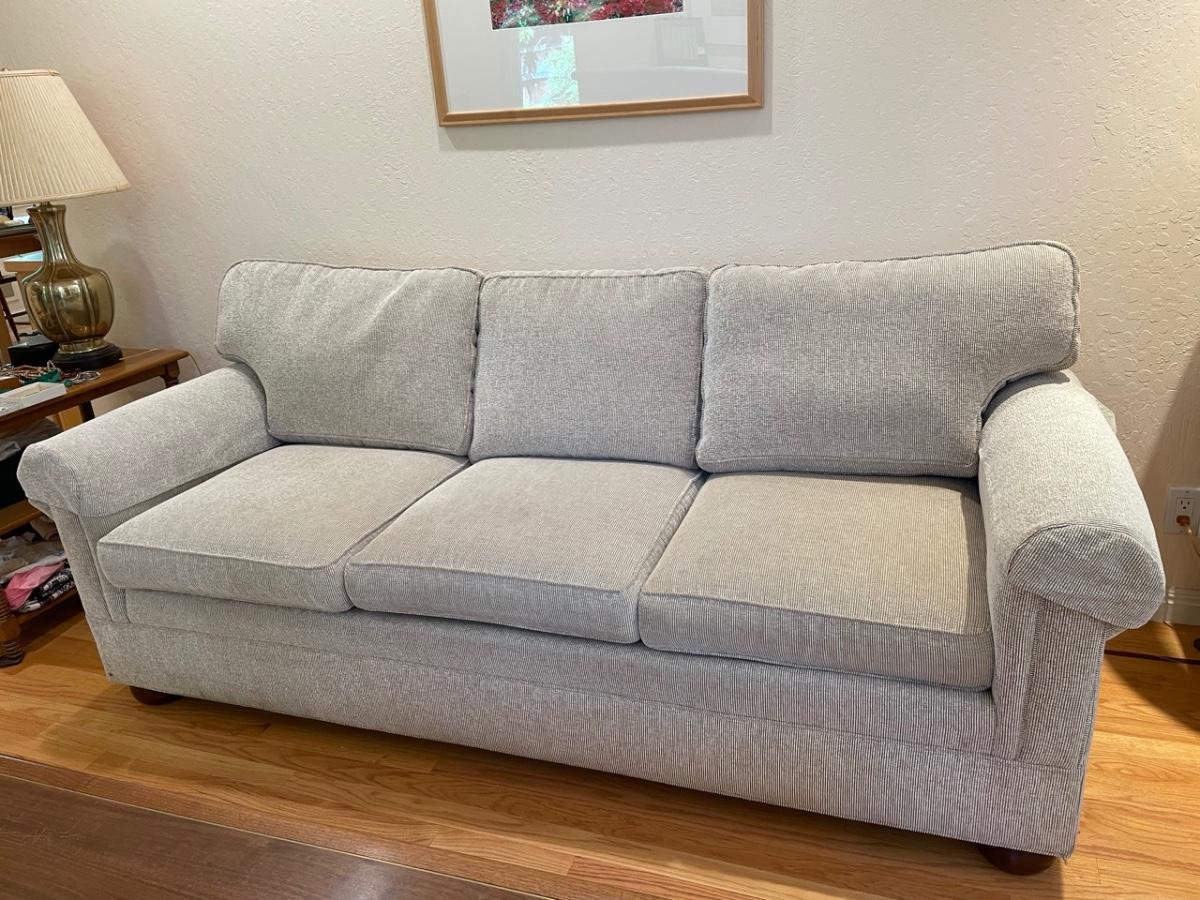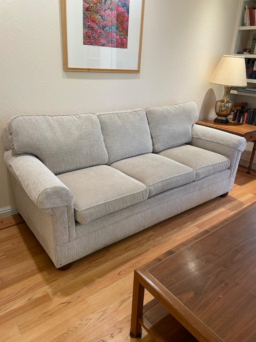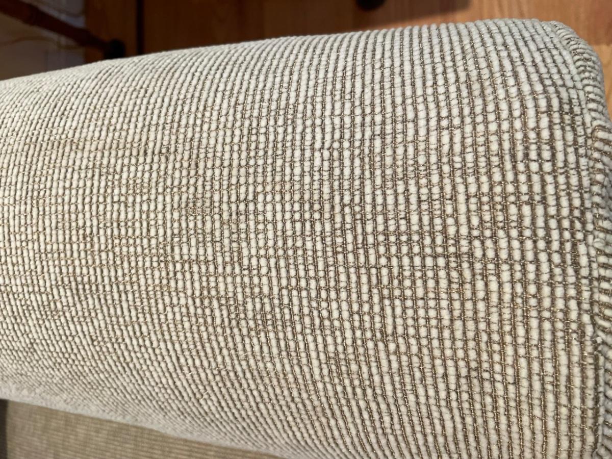 In great condition. Chenille type fabric. Cream. Firm cushions