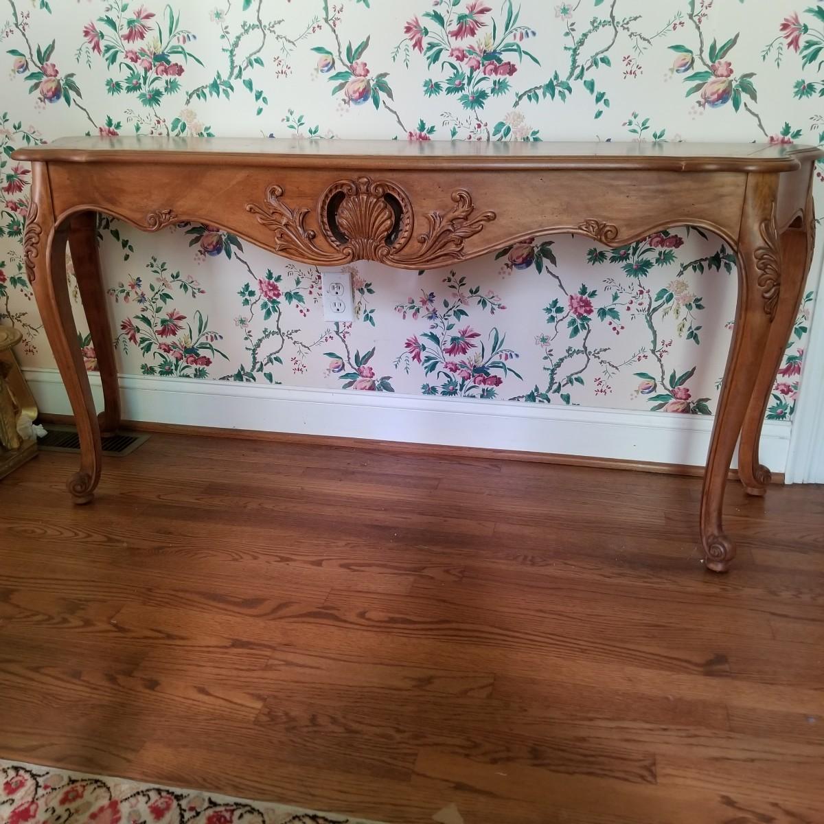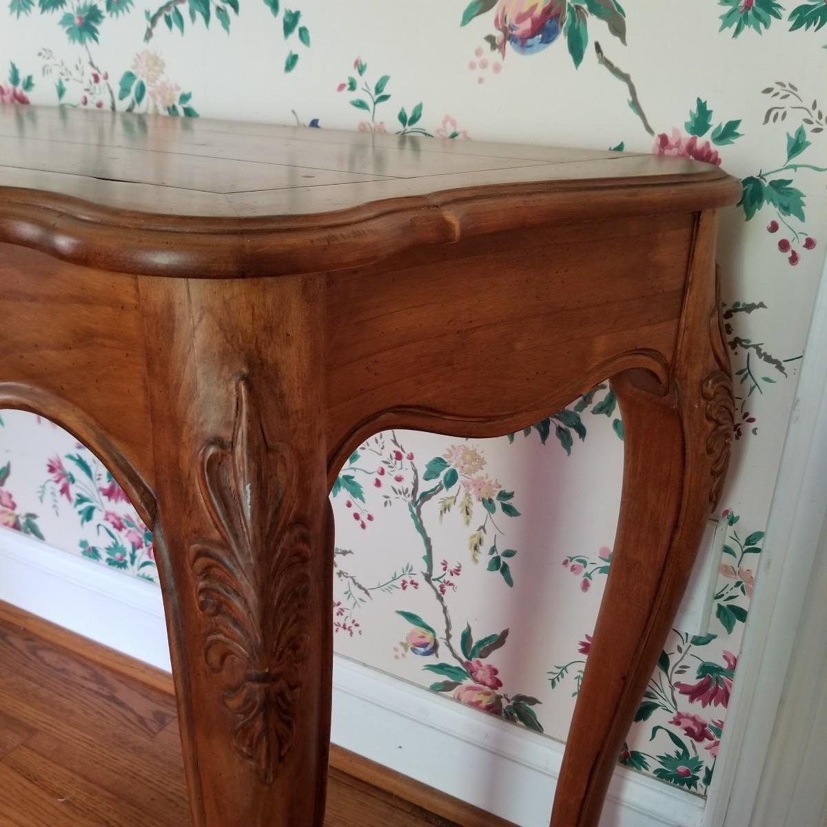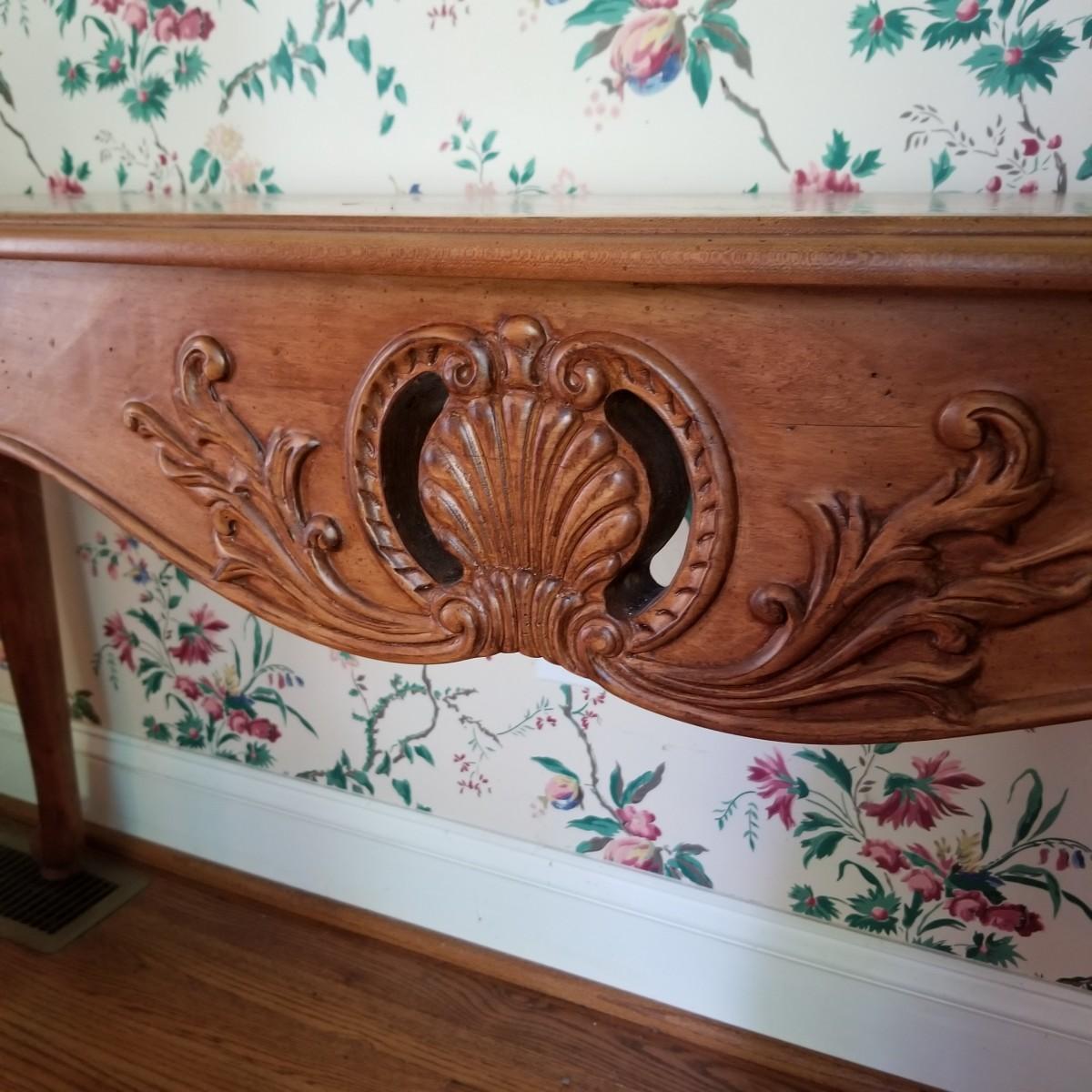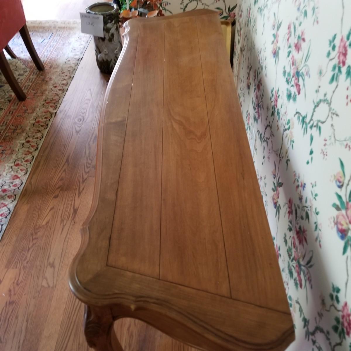 Ethan Allen sofa table from the Legacy collection. Table is solid wood with some slight scuffs on edges. Top is smooth. Table ends are deeper in back than front, see photos. Table measures 59" x 16.5" x 27.5". See other lots in auction for matching hutch and dining room table. Local pickup only.