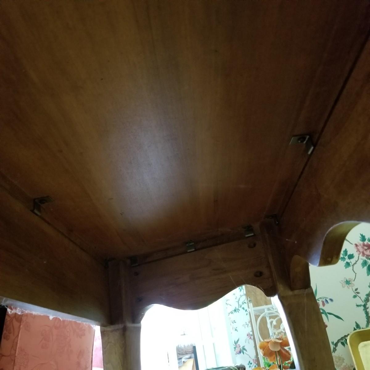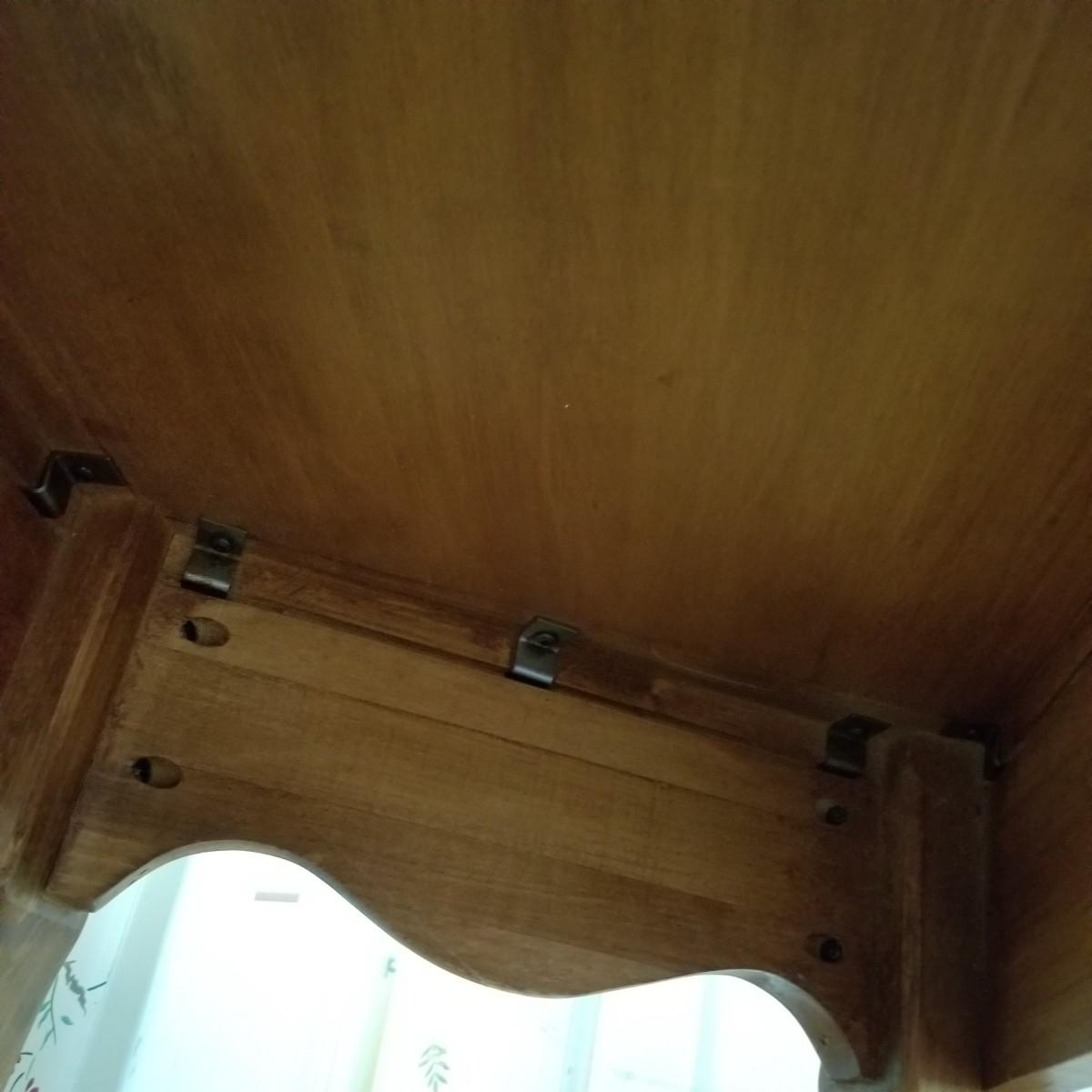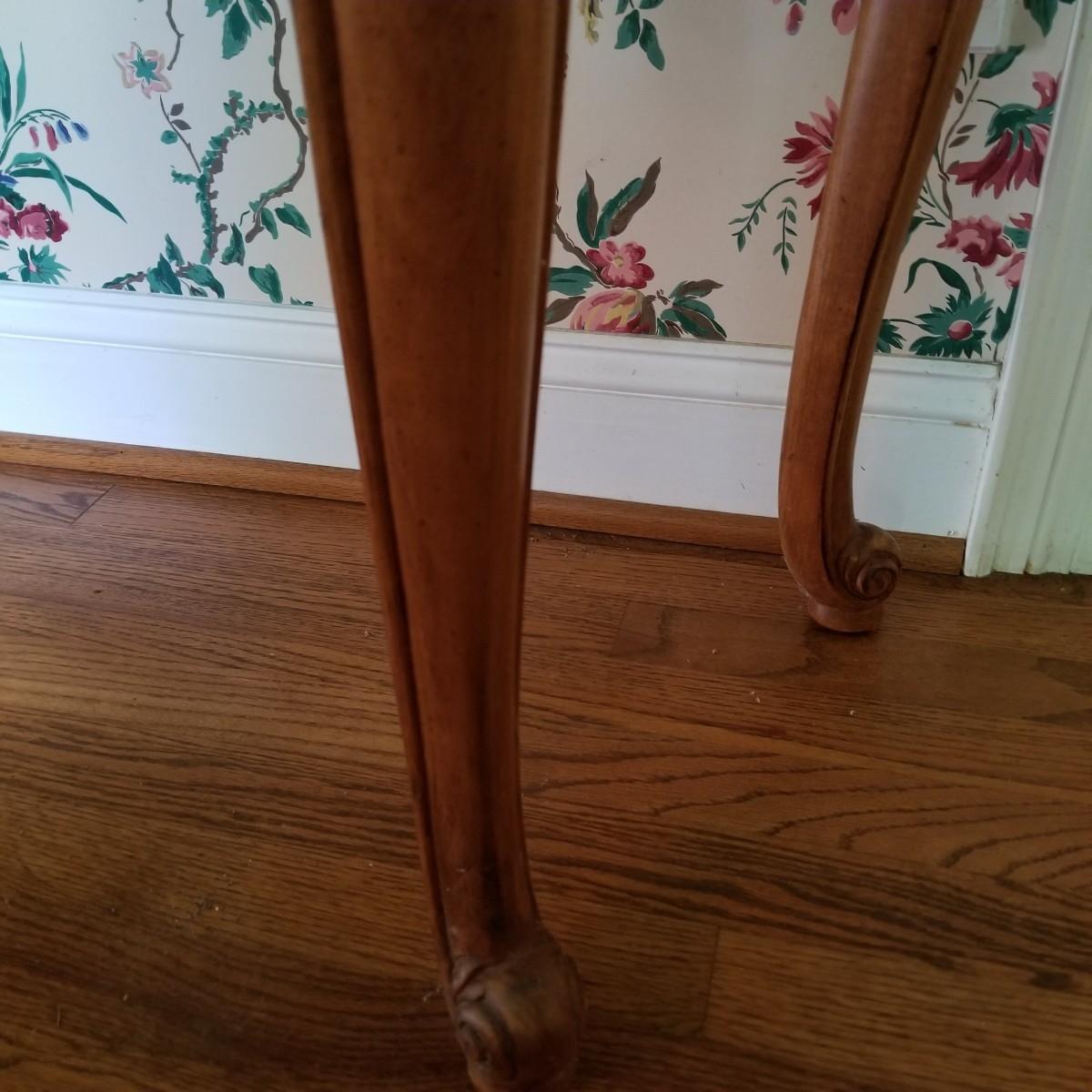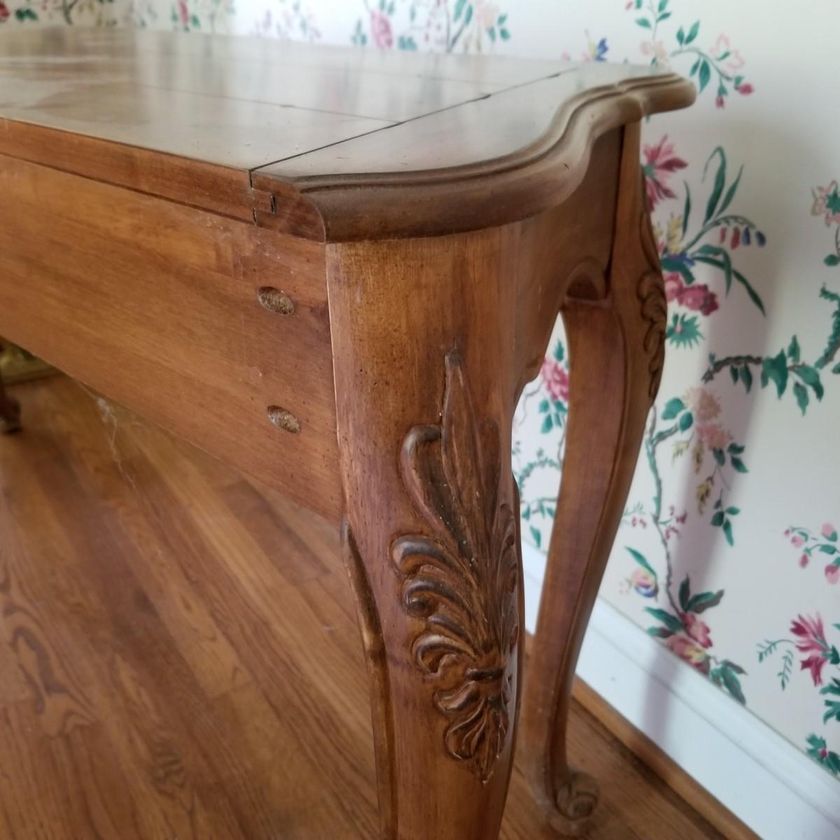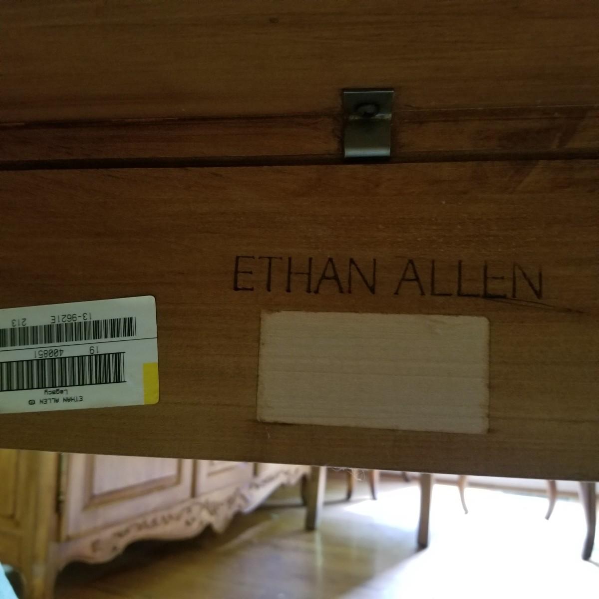 Ethan Allen sofa table from the Legacy collection. Table is solid wood with some slight scuffs on edges. Top is smooth. Table ends are deeper in back than front, see photos. Table measures 59" x 16.5" x 27.5". See other lots in auction for matching hutch and dining room table. Local pickup only.