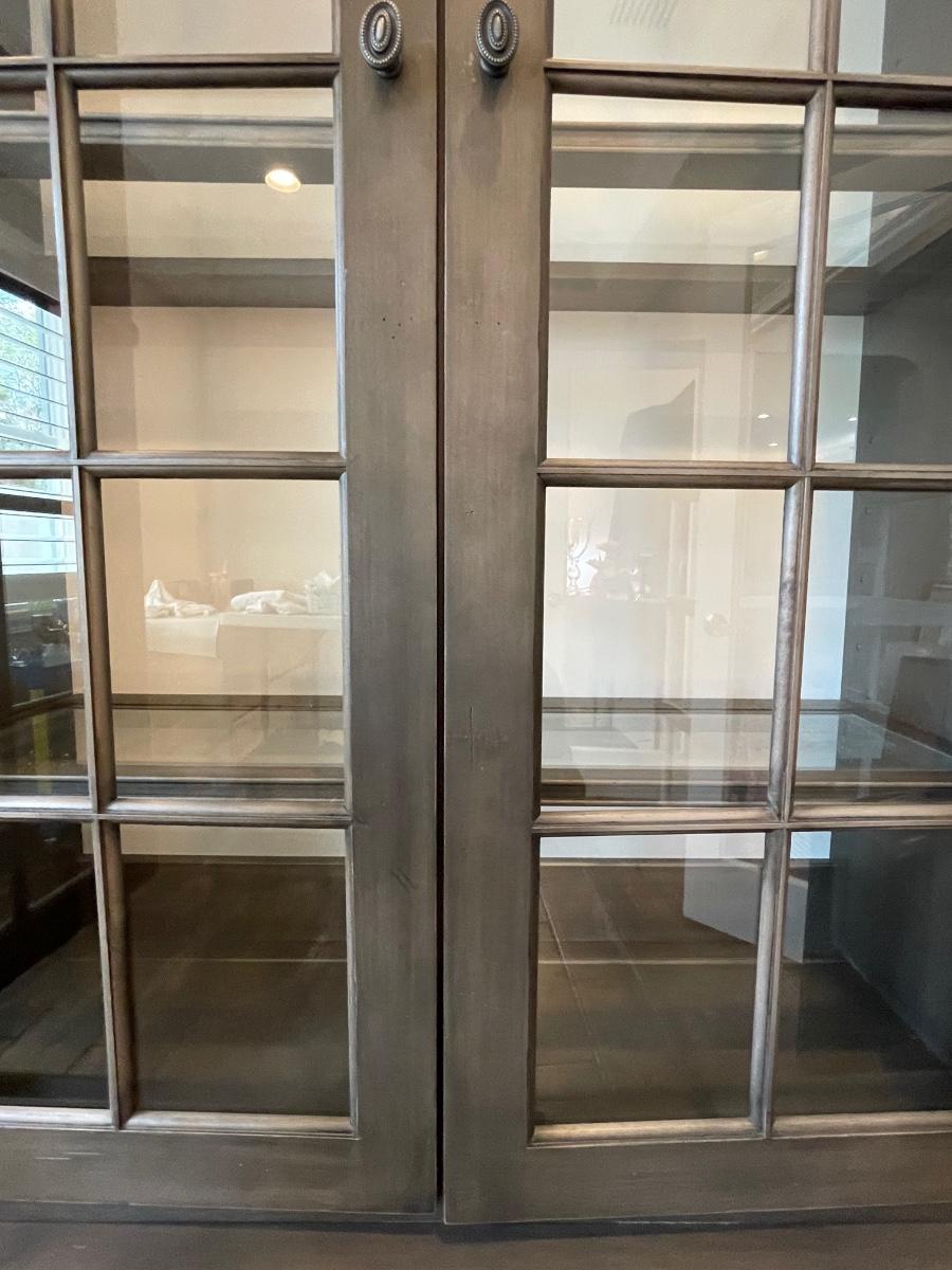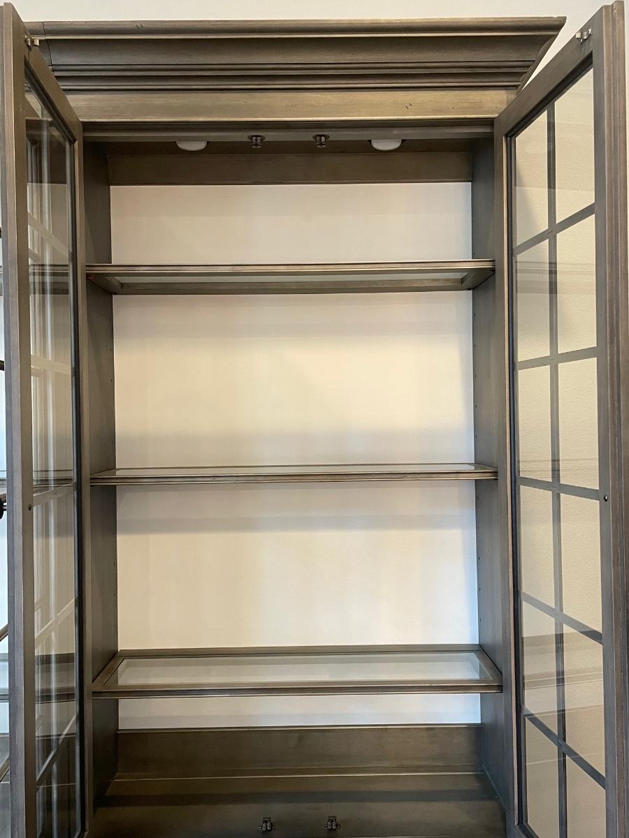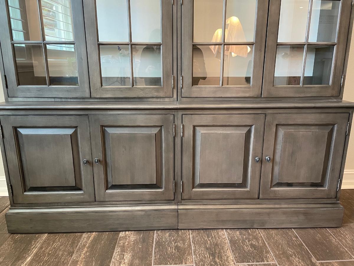 Glass-front upper display cabinets and raised-panel doors on the lower cabinets. Made up of 4 pieces - 2 uppers and 2 bases. Adjustable shelves. Lights in the top of the upper cabinets. Open back. The finish is called "Stonstreet";semi-opaque medium gray stain with a charcoal gray glaze--slightly distressed. Retails for $7180. Questions and offers for furniture can be made by email, phone call or text. 813-784-0235. Jenny@tendercaretampa.com
