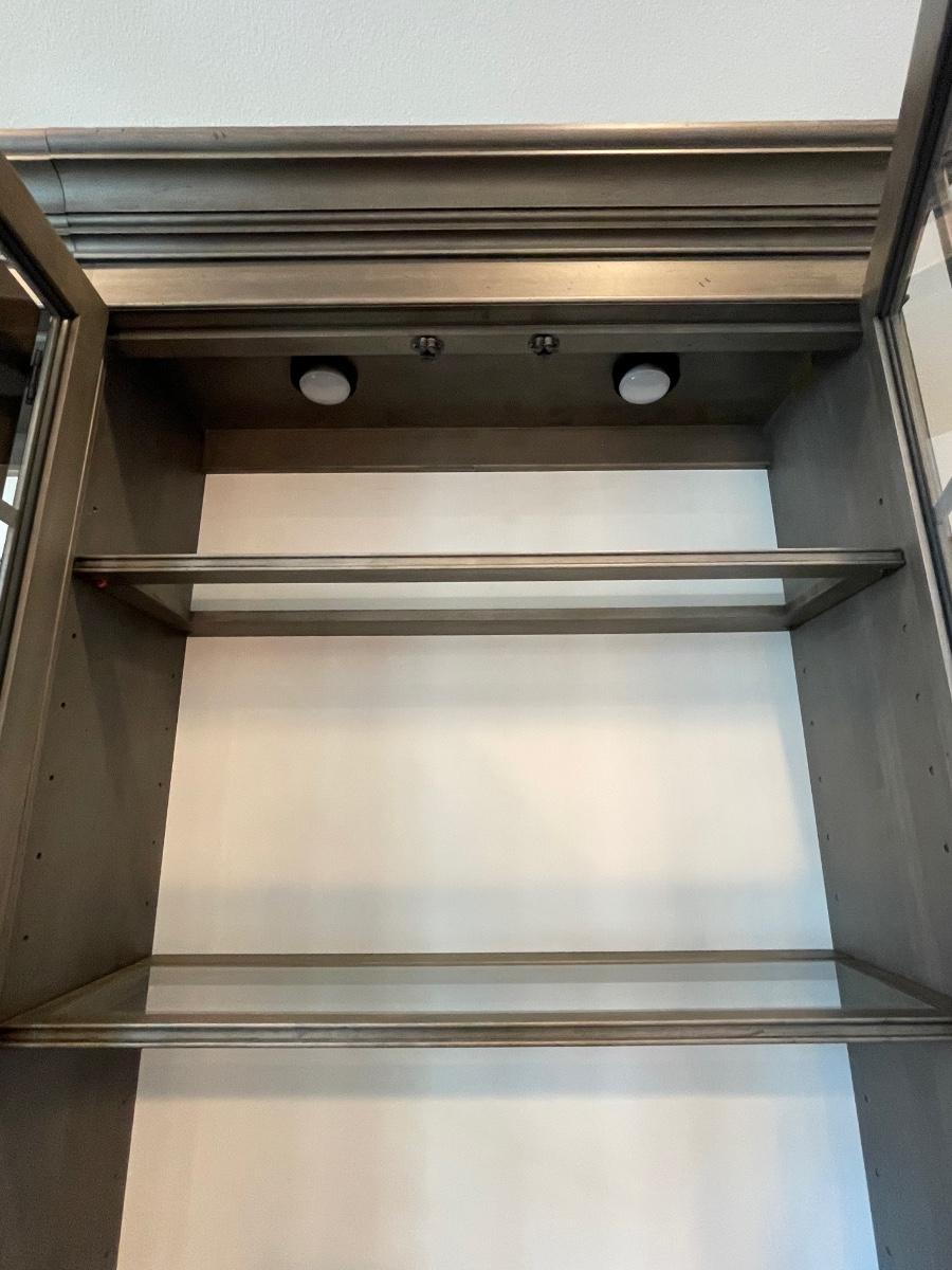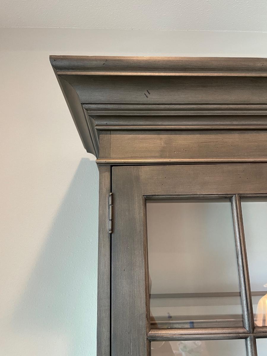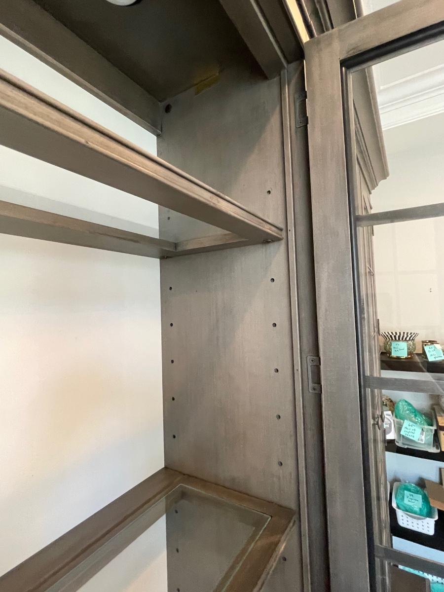 Glass-front upper display cabinets and raised-panel doors on the lower cabinets. Made up of 4 pieces - 2 uppers and 2 bases. Adjustable shelves. Lights in the top of the upper cabinets. Open back. The finish is called "Stonstreet";semi-opaque medium gray stain with a charcoal gray glaze--slightly distressed. Retails for $7180. Questions and offers for furniture can be made by email, phone call or text. 813-784-0235. Jenny@tendercaretampa.com