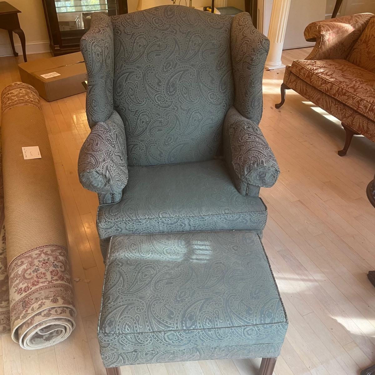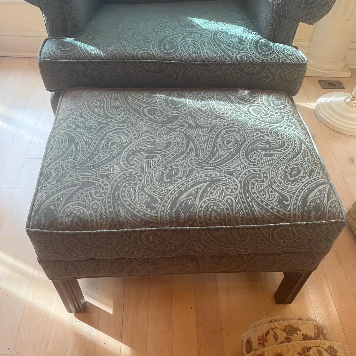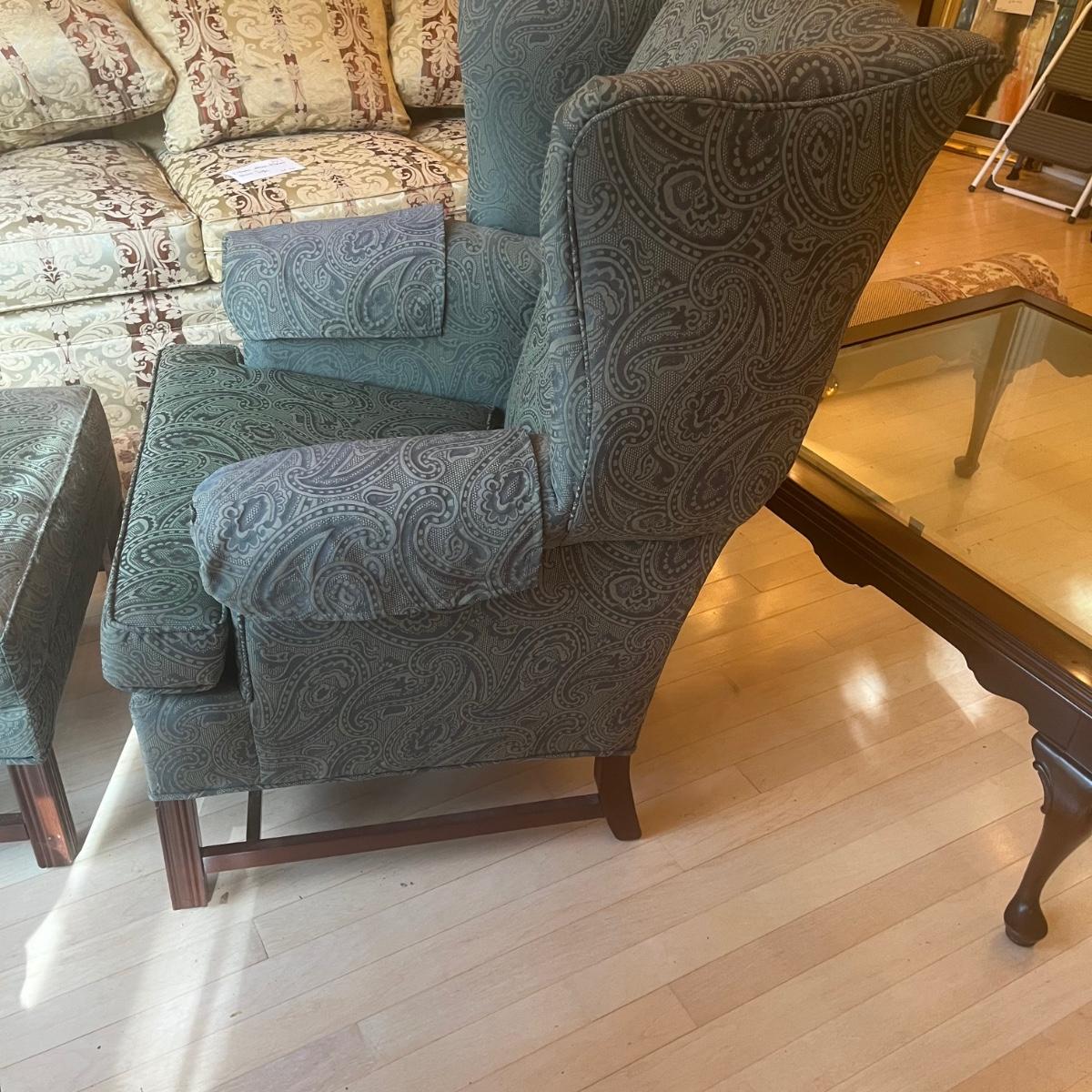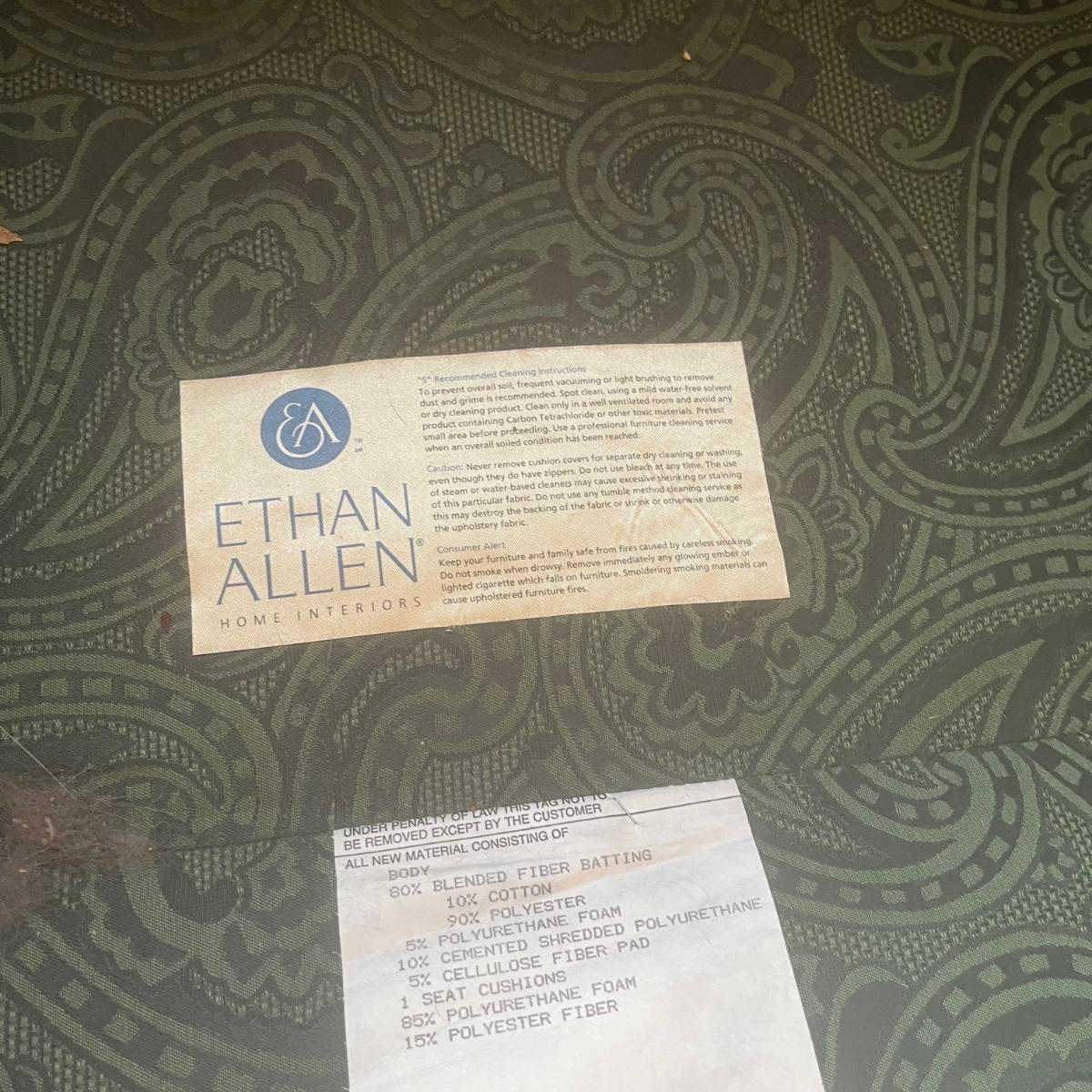 Ethan Allen dark green textured paisley print wing back chair with ottoman. Springs and cushions are firm. Large amounts of cat hair throughout. Chair measures approximately 31"L x27"W x42.5"H, seat height 20"H. Ottoman approximately 25"L x18"W x17"H. Please note this was a smoking household and fabric does hold the smell. Local pickup only.
