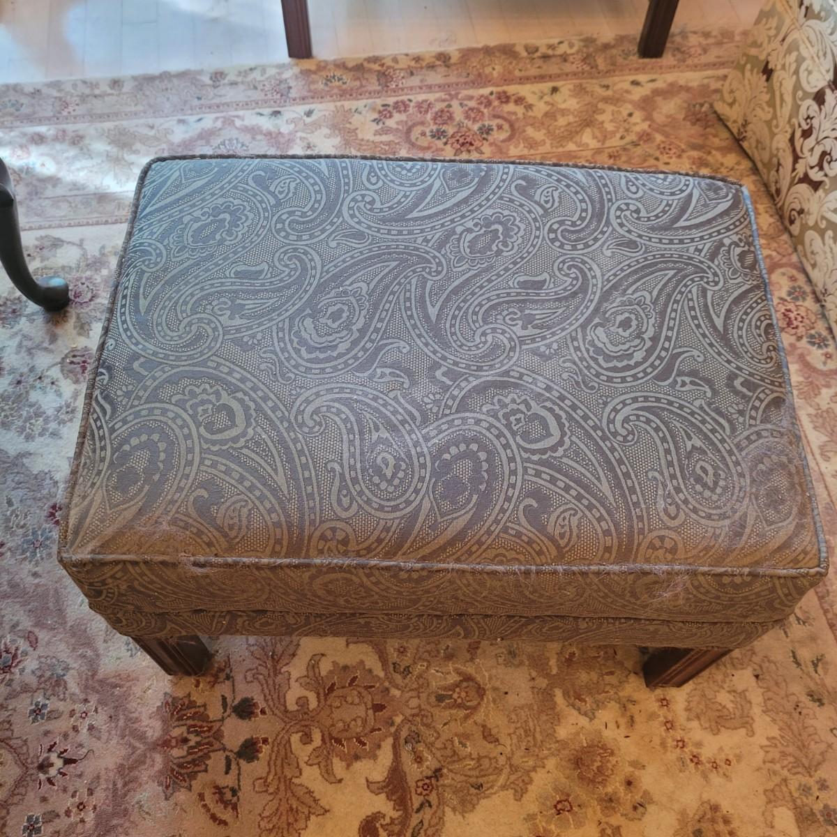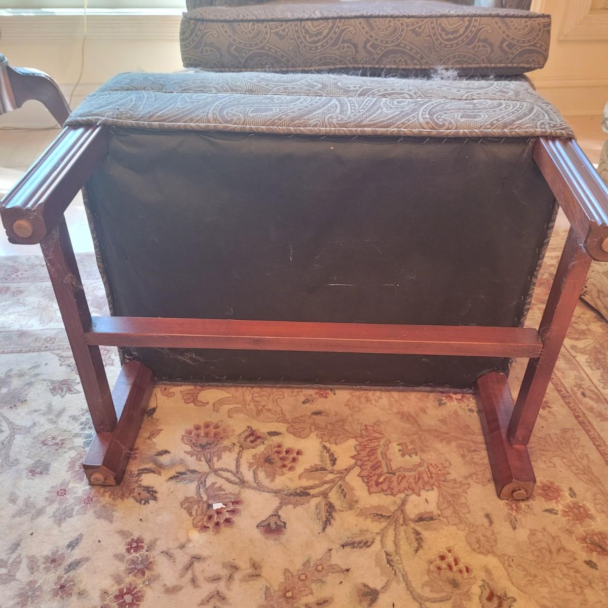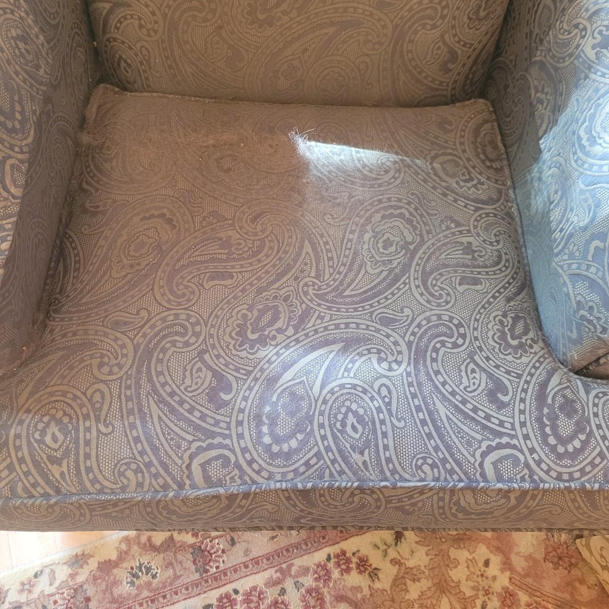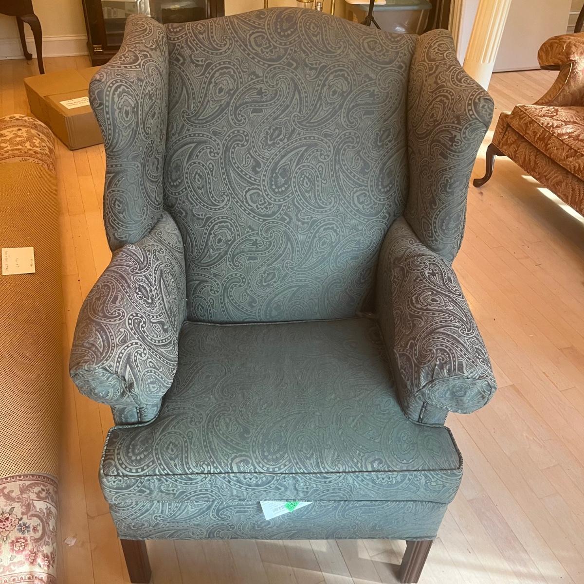Ethan Allen dark green textured paisley print wing back chair with ottoman. Springs and cushions are firm. Large amounts of cat hair throughout. Chair measures approximately 31"L x27"W x42.5"H, seat height 20"H. Ottoman approximately 25"L x18"W x17"H. Please note this was a smoking household and fabric does hold the smell. Local pickup only.