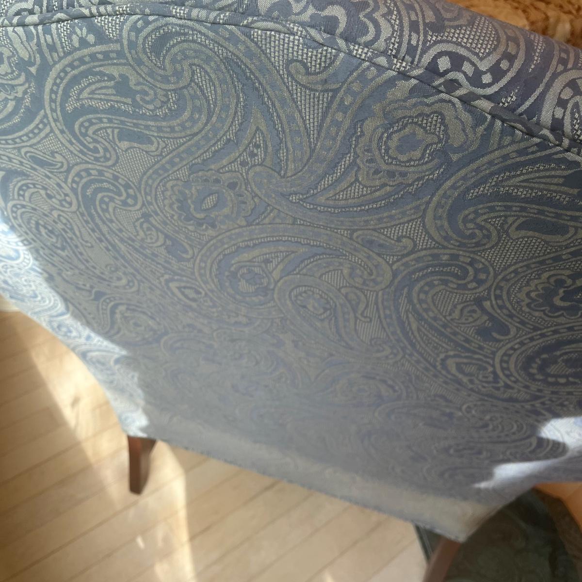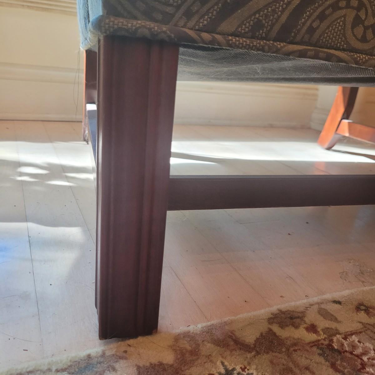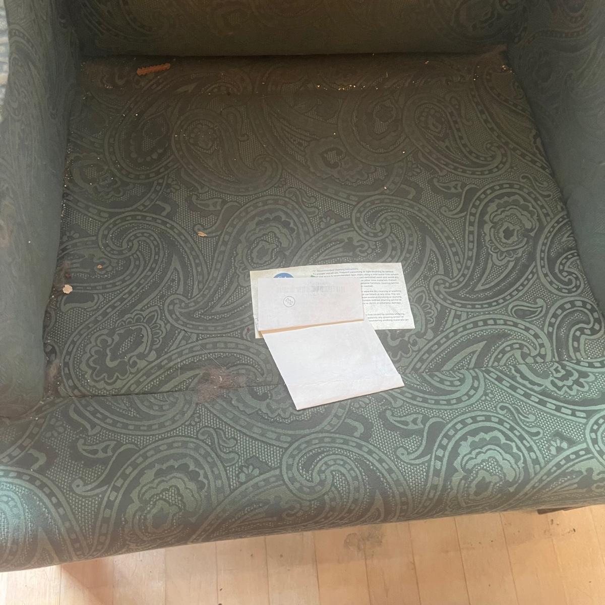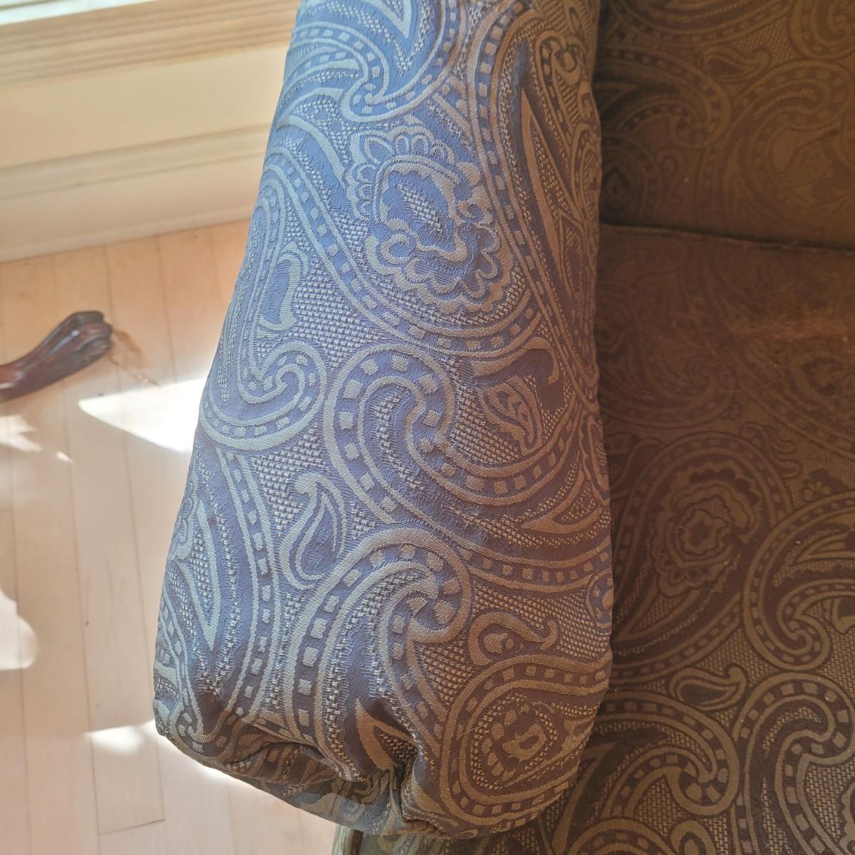 Ethan Allen dark green textured paisley print wing back chair with ottoman. Springs and cushions are firm. Large amounts of cat hair throughout. Chair measures approximately 31"L x27"W x42.5"H, seat height 20"H. Ottoman approximately 25"L x18"W x17"H. Please note this was a smoking household and fabric does hold the smell. Local pickup only.