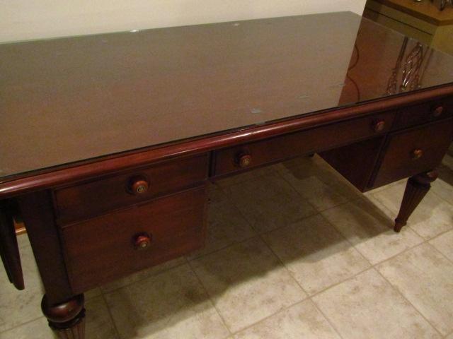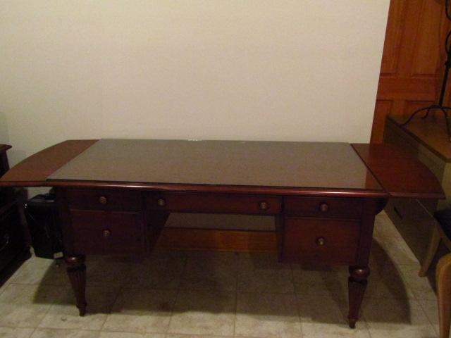 Ethan Allen Wood Desk with Drop Leaf Ends. Approx 82 1/2" Wide with both leaves open, 61" with both leaves down.