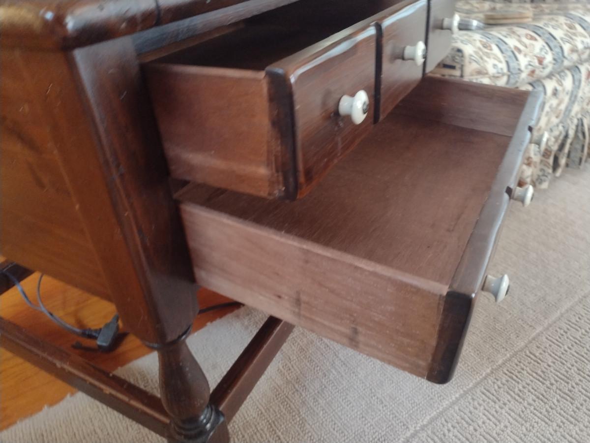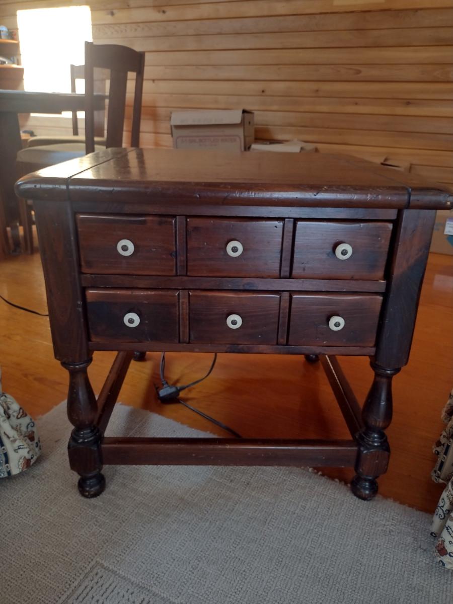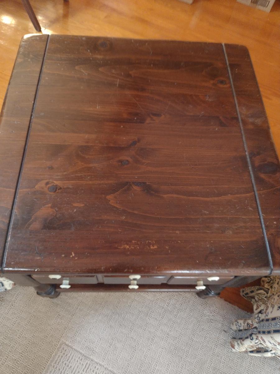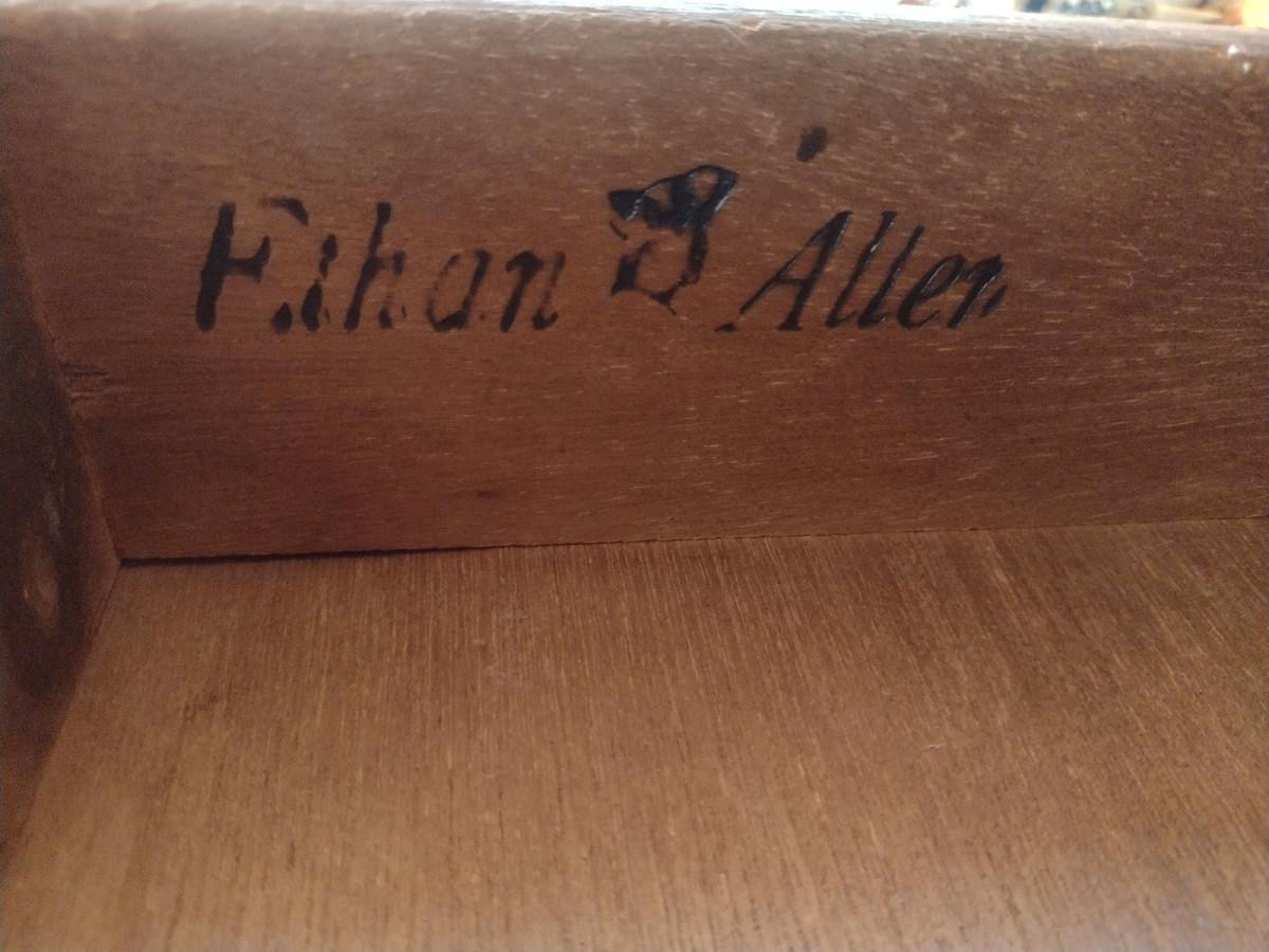 Ethan Allen Wooden Double Drawer Side Table. Item is in used condition and has wear to finish- please see all pictures for condition.