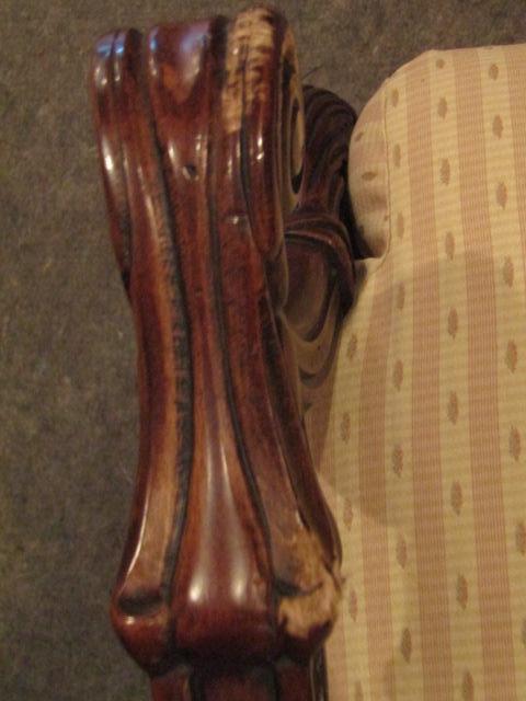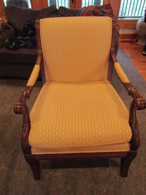 Ethan Allen Wooden Framed Chair with Upholstered Back and Seat (#2). Some damage to wood. Some light staining on seat. Please see all pictures.