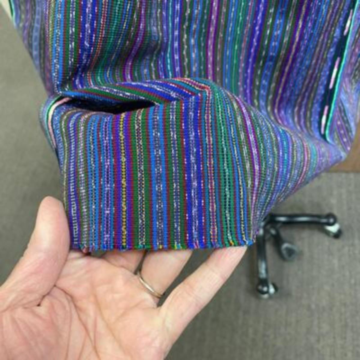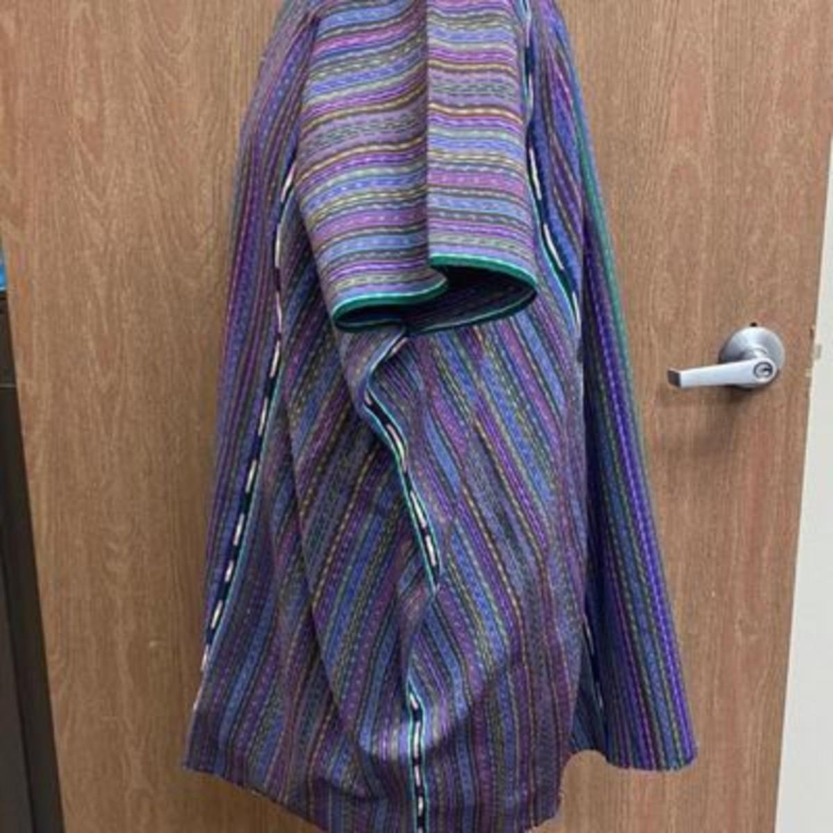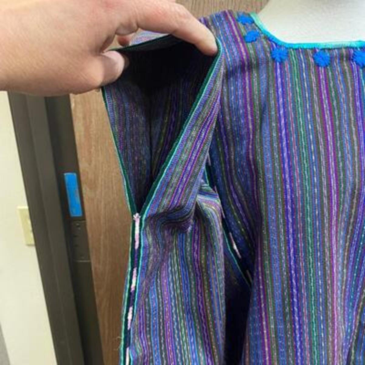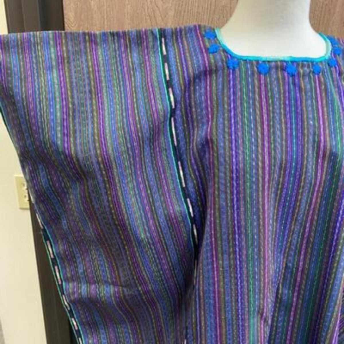 Ethnic Huipil tunic blouse in beautiful shades of blue and purple. Some added hand embroidery at the neck. In good condition. There may be faint spots, didn't notice any. No holes.