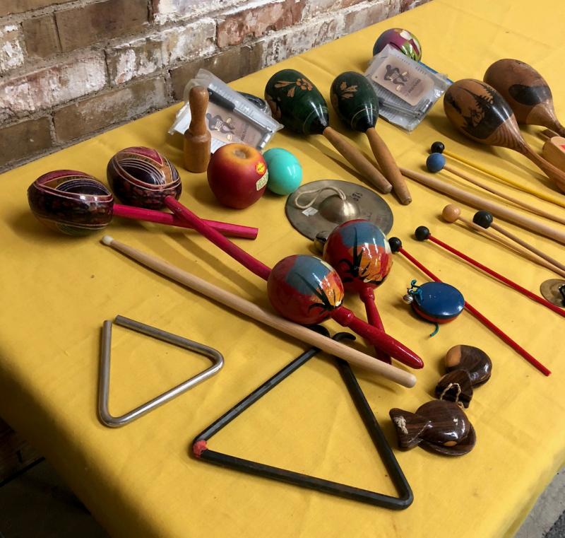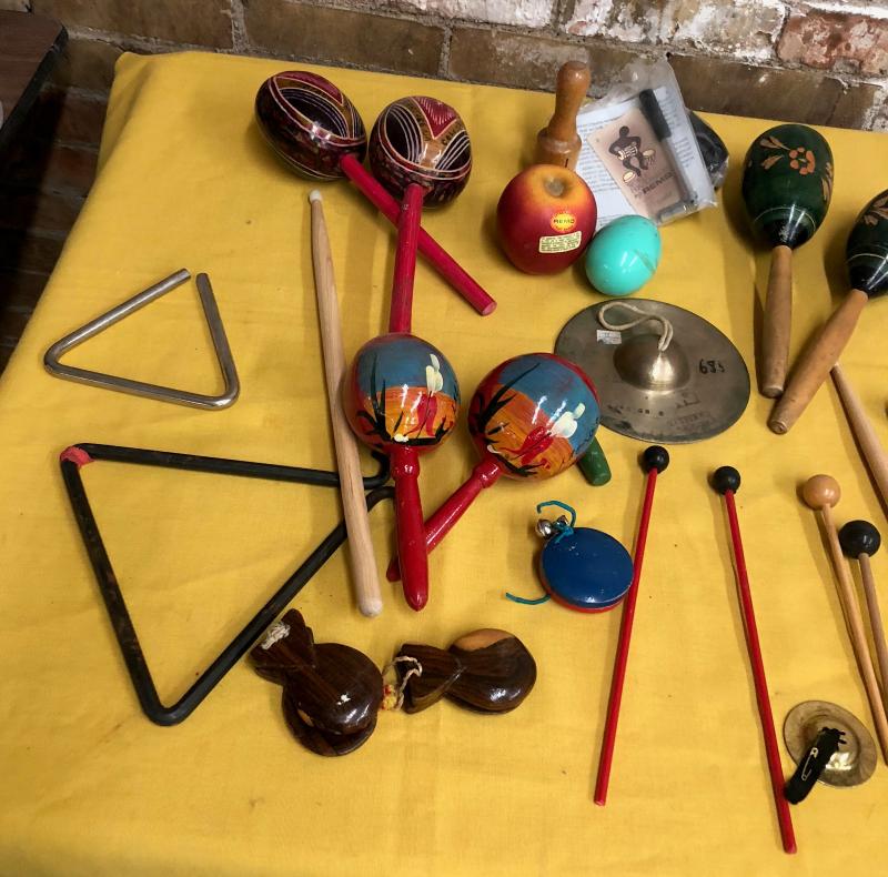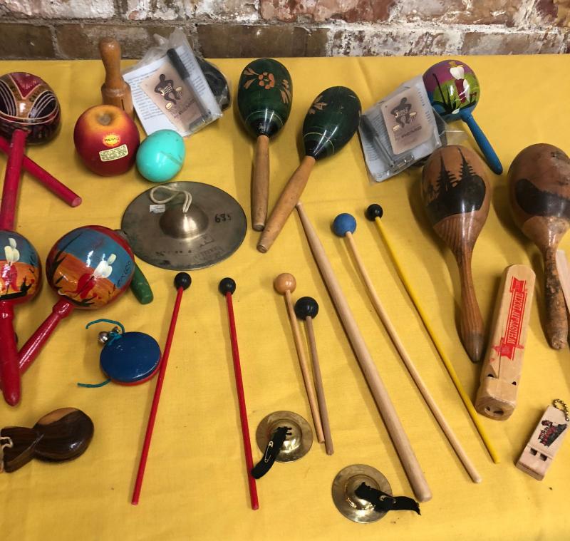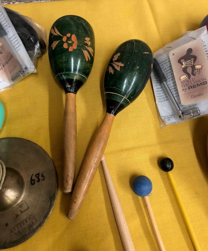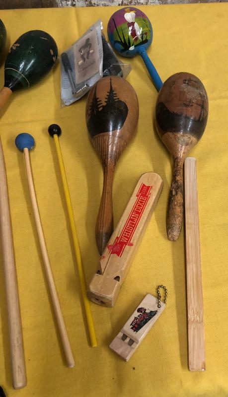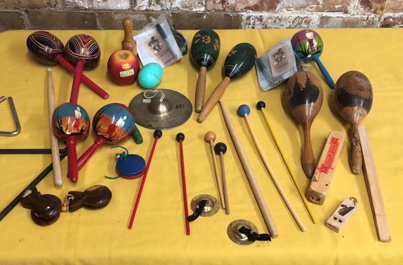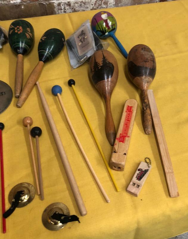 The kids will love these ethnic percussion instruments.maracas..finger cymbals..whistles..all that is shown...