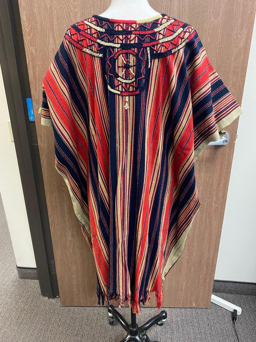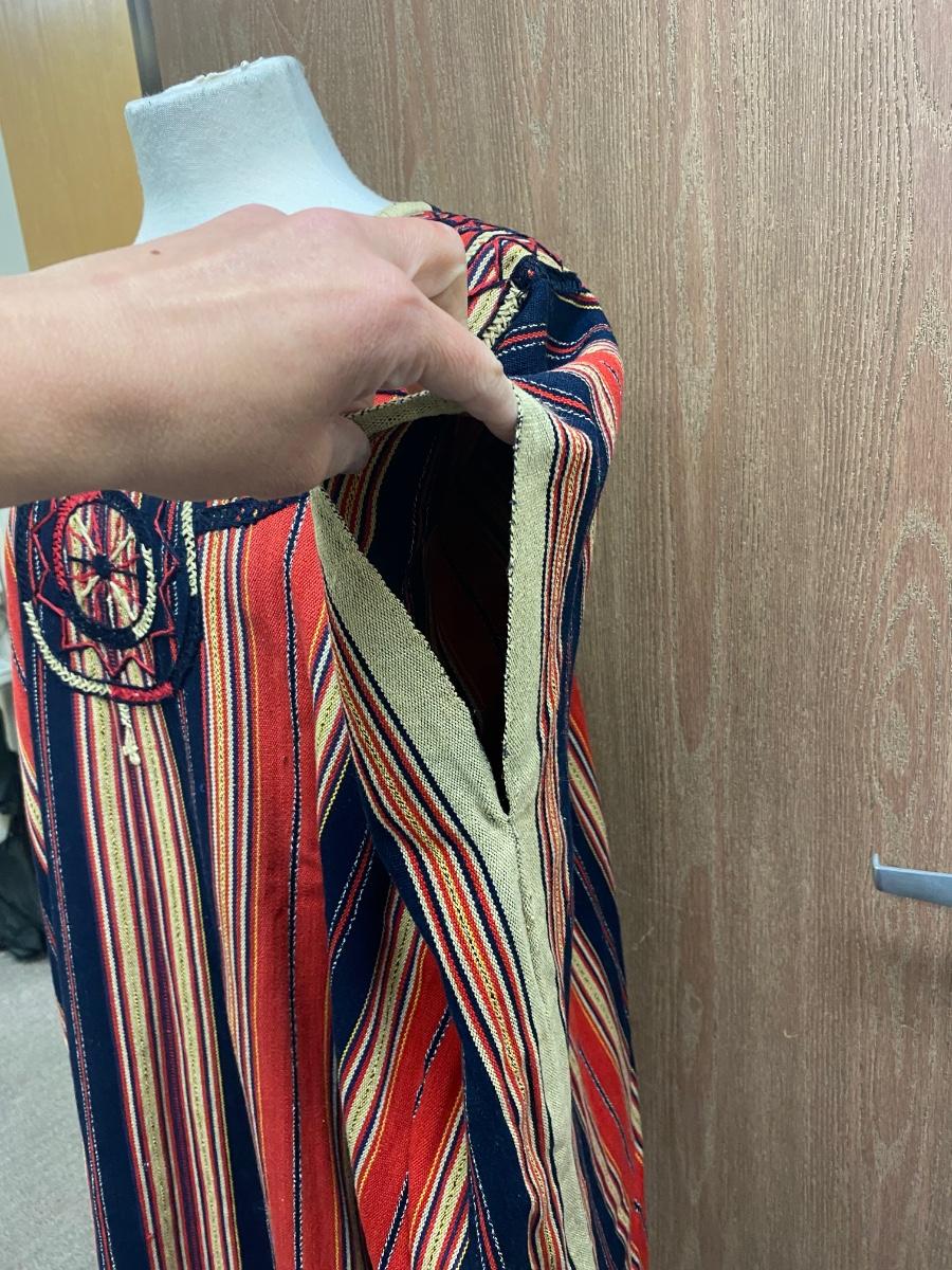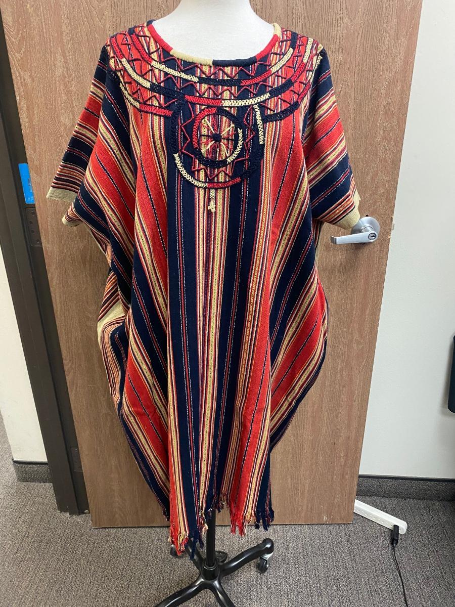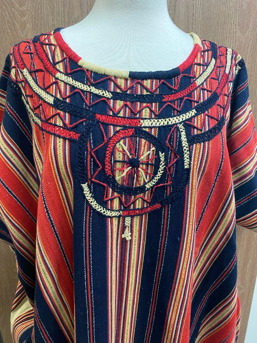Striped & embroidered Mexican tunic dress. Reds, yellows, and navy-blue/ black stripes. Longer length, about at the knees. Good condition, no spots noticed, no holes. No tags but looks to be medium/large sized.