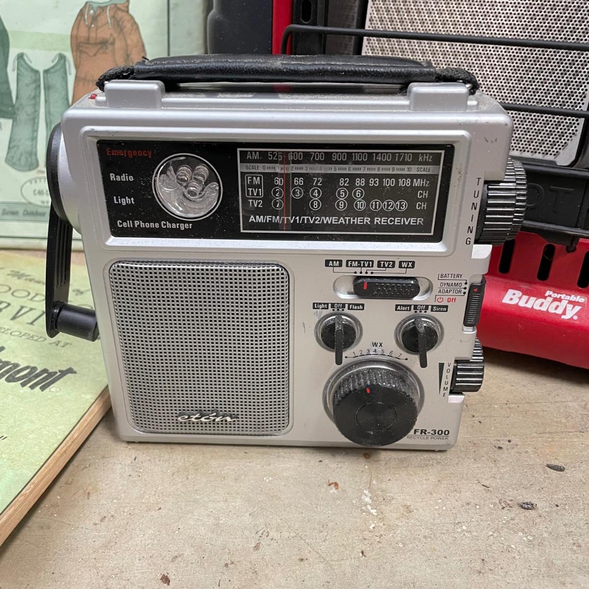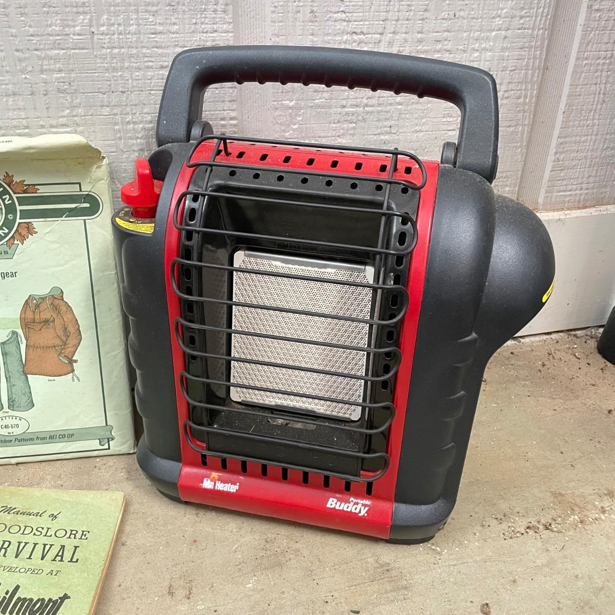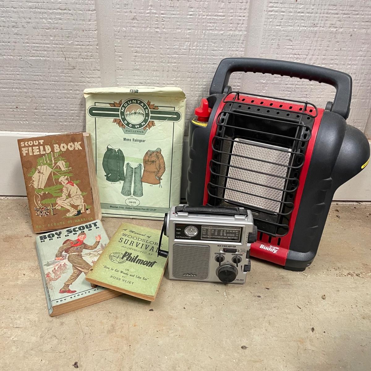 Lot features a Mr Heater propane powered heater, an Etón FR-300 emergency am/fm radio, flashlight, charger that is both battery and crank powered. Radio light turned on when the hand crank was used, it made noise when turned on with its current batteries. The heater was not tested, tank is not included. It measures 14” x 7.5” x 16”. Lot also includes patterns for outdoor wear, two vintage Scout books and a survival guide. We cannot verify contents of patterns kit. See images. Shipping available.