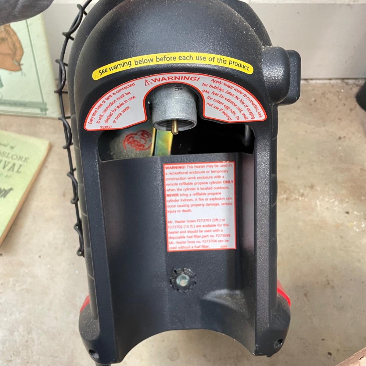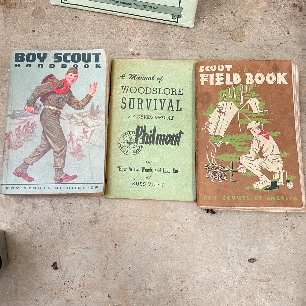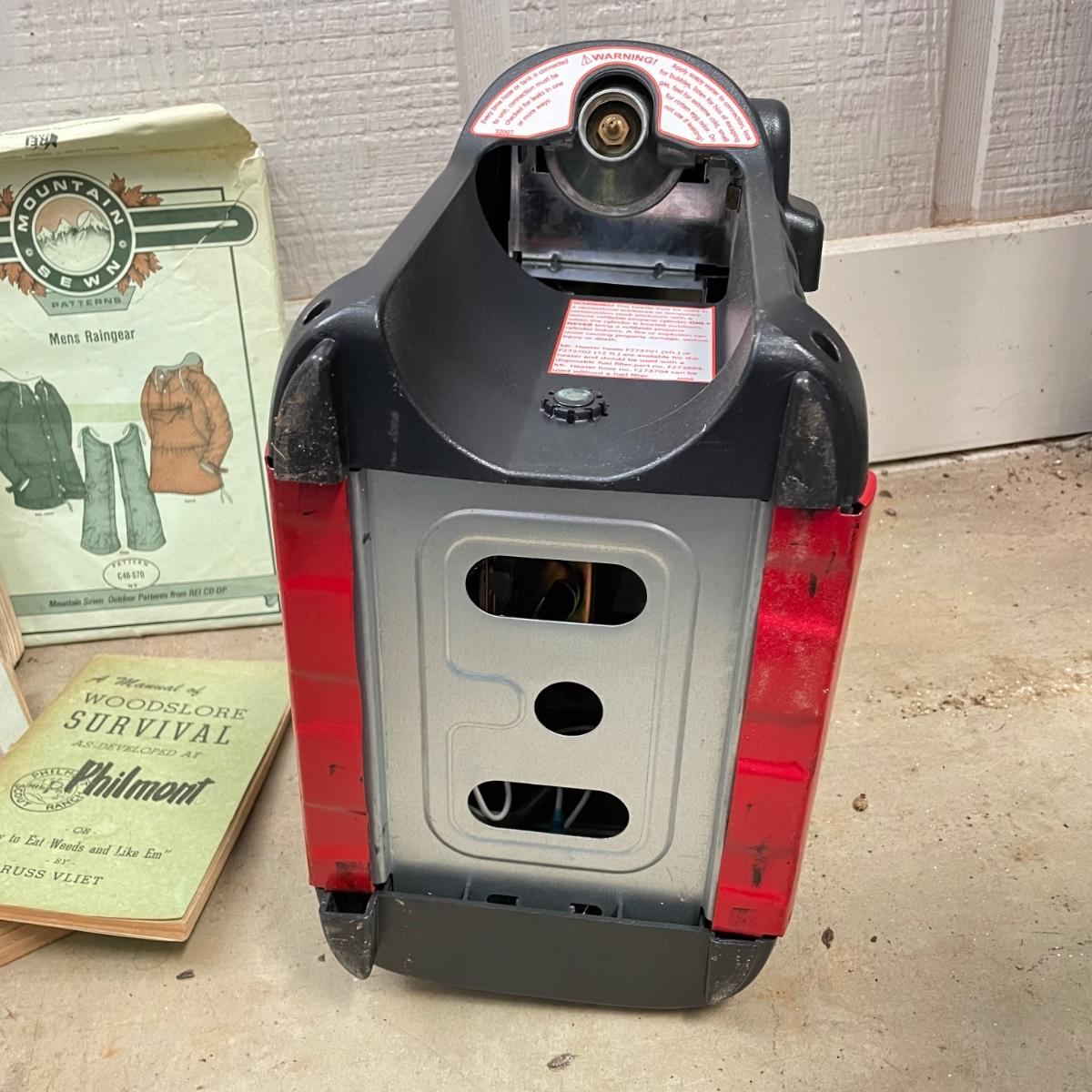 Lot features a Mr Heater propane powered heater, an Etón FR-300 emergency am/fm radio, flashlight, charger that is both battery and crank powered. Radio light turned on when the hand crank was used, it made noise when turned on with its current batteries. The heater was not tested, tank is not included. It measures 14” x 7.5” x 16”. Lot also includes patterns for outdoor wear, two vintage Scout books and a survival guide. We cannot verify contents of patterns kit. See images. Shipping available.