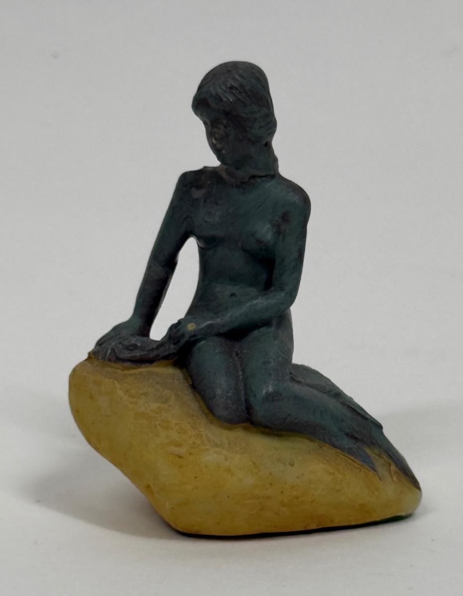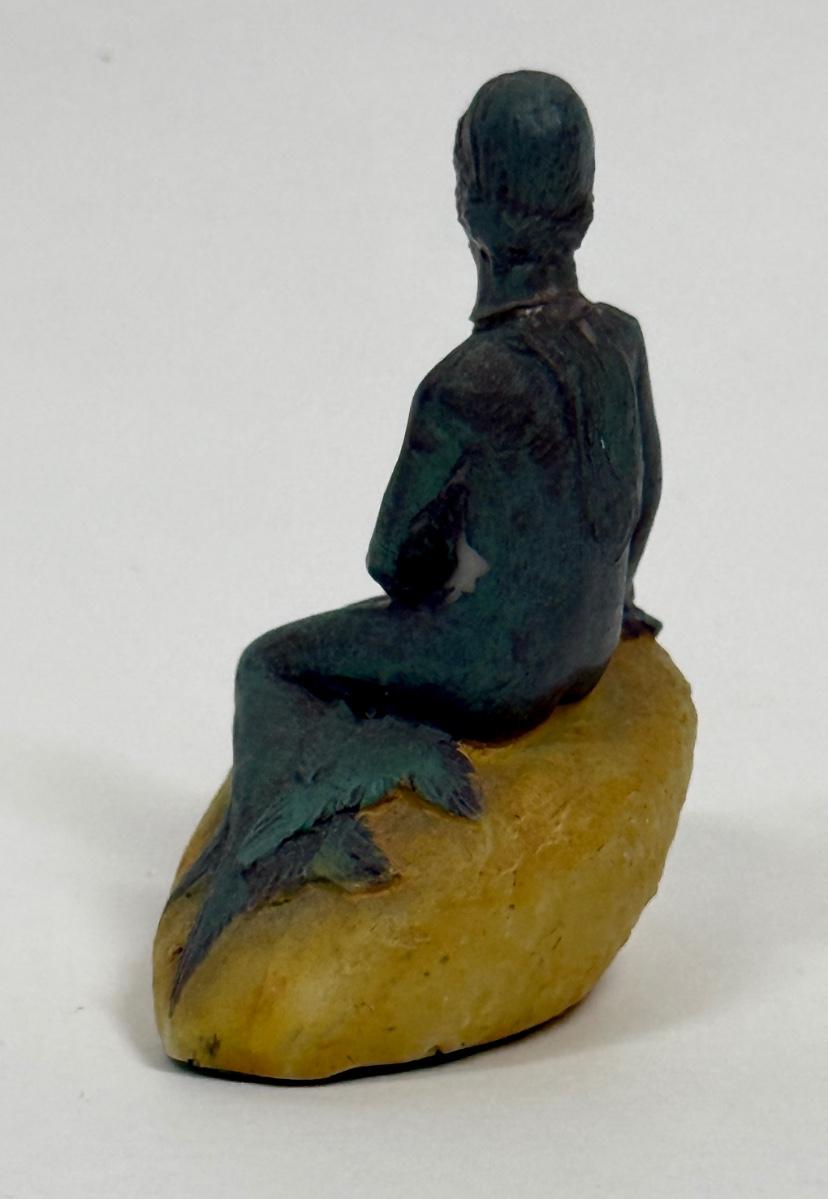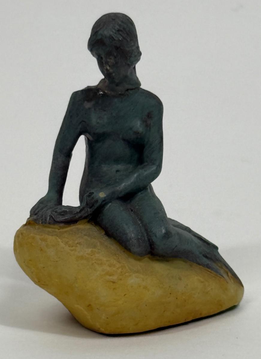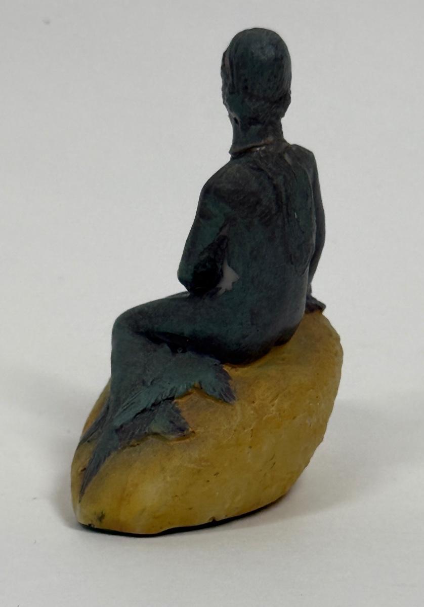 Inspired by The Little Mermaid Bronze Statue in Copenhagen, created in 1913. It depicts the forlorn titular mermaid along the banks of Langelinje Pier. Plastic or Lucite painted to look like weathered brass. Figurine is approx. 2.5" tall. Sitting on a tan-colored rock. Appears to have had the head glued back on after damage, repair looks good and is difficult to notice at first glance.