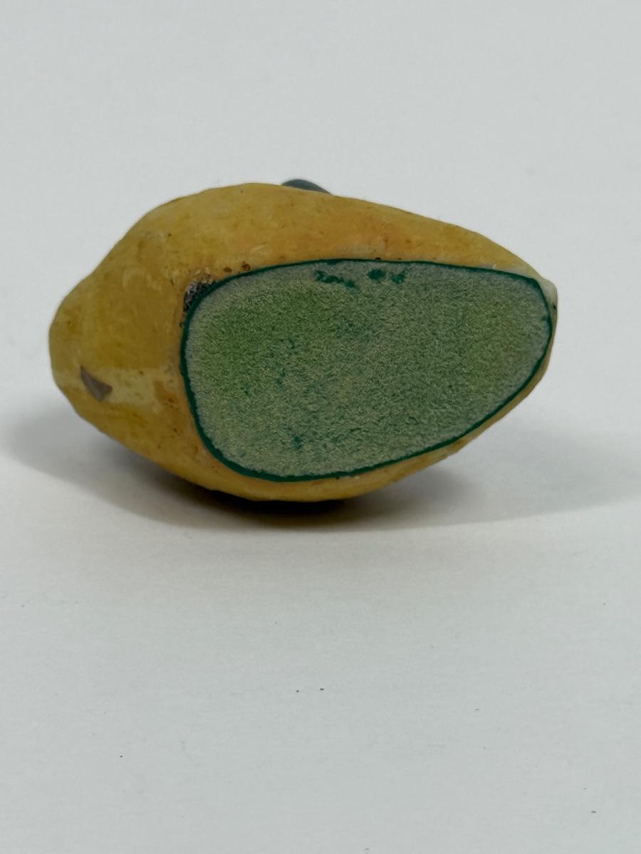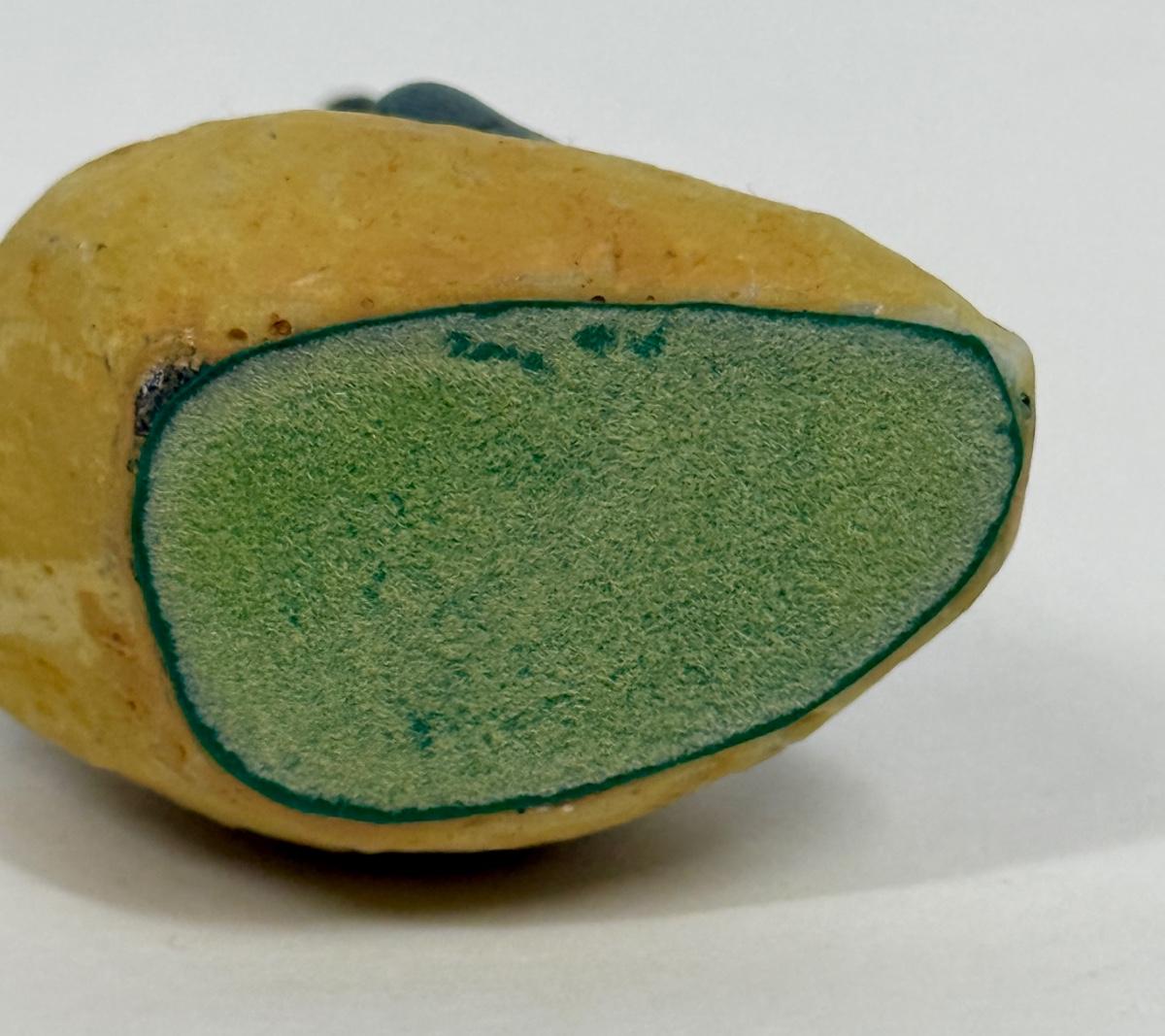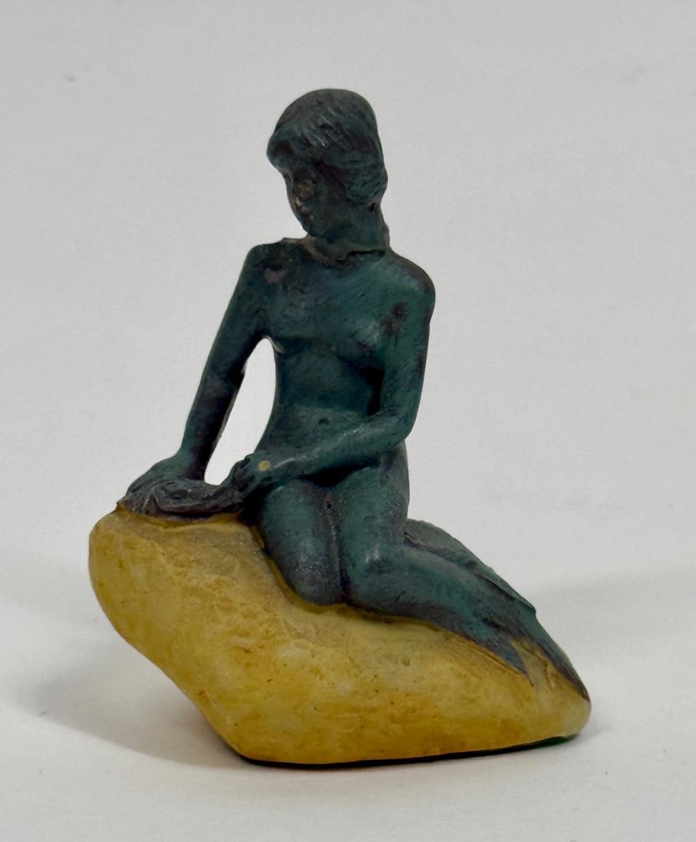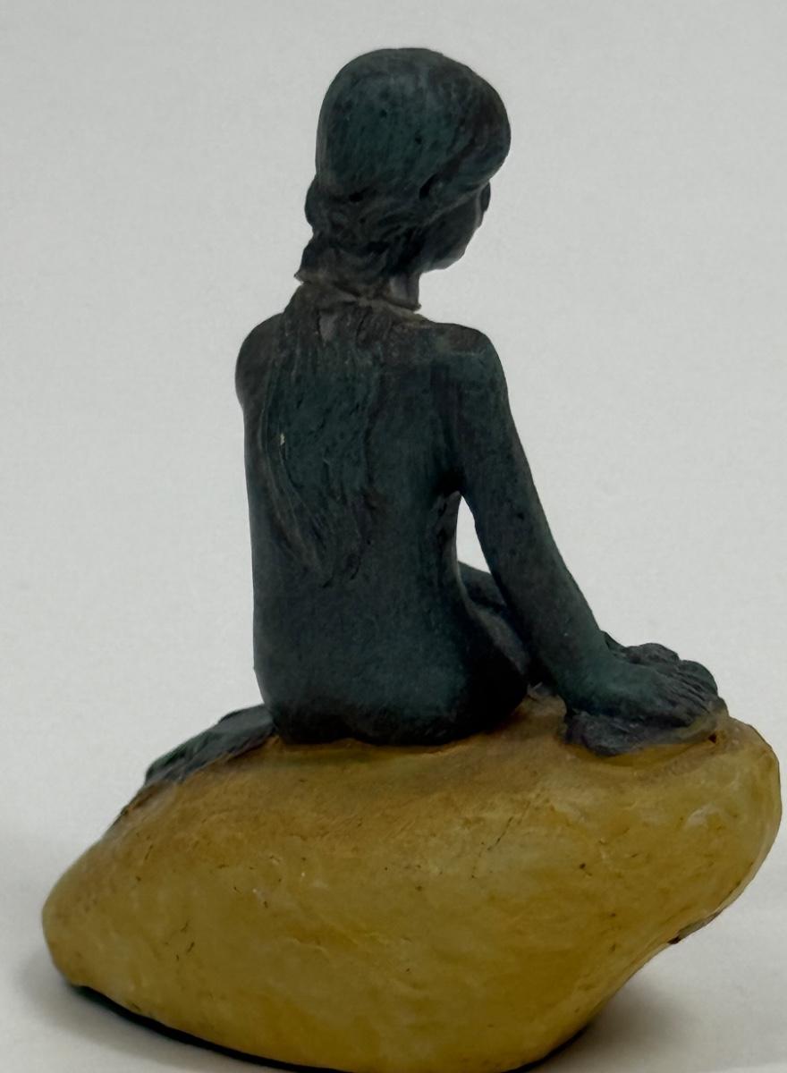 Inspired by The Little Mermaid Bronze Statue in Copenhagen, created in 1913. It depicts the forlorn titular mermaid along the banks of Langelinje Pier. Plastic or Lucite painted to look like weathered brass. Figurine is approx. 2.5" tall. Sitting on a tan-colored rock. Appears to have had the head glued back on after damage, repair looks good and is difficult to notice at first glance.