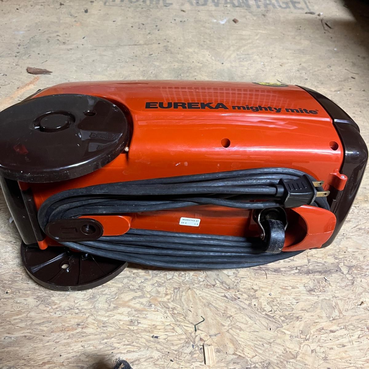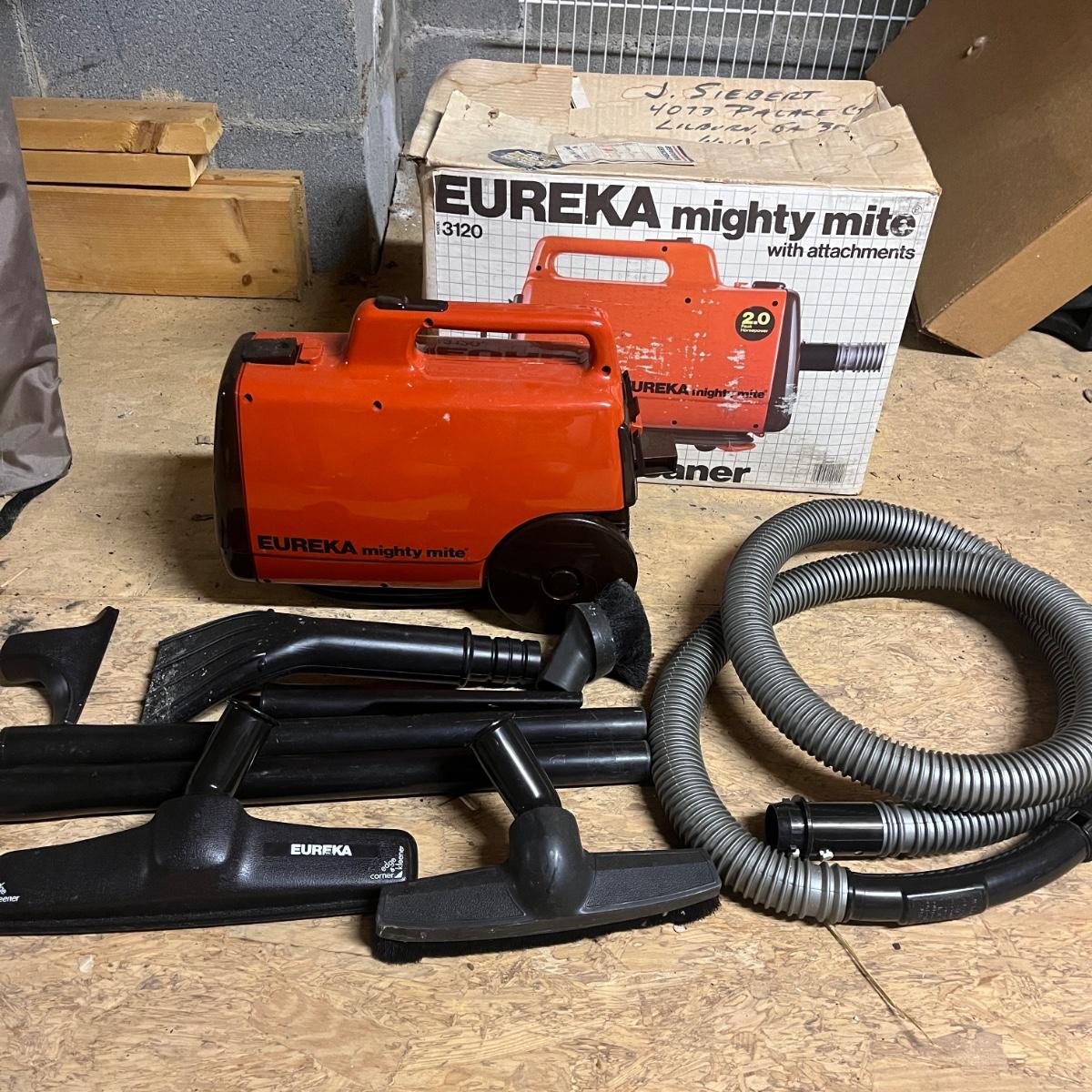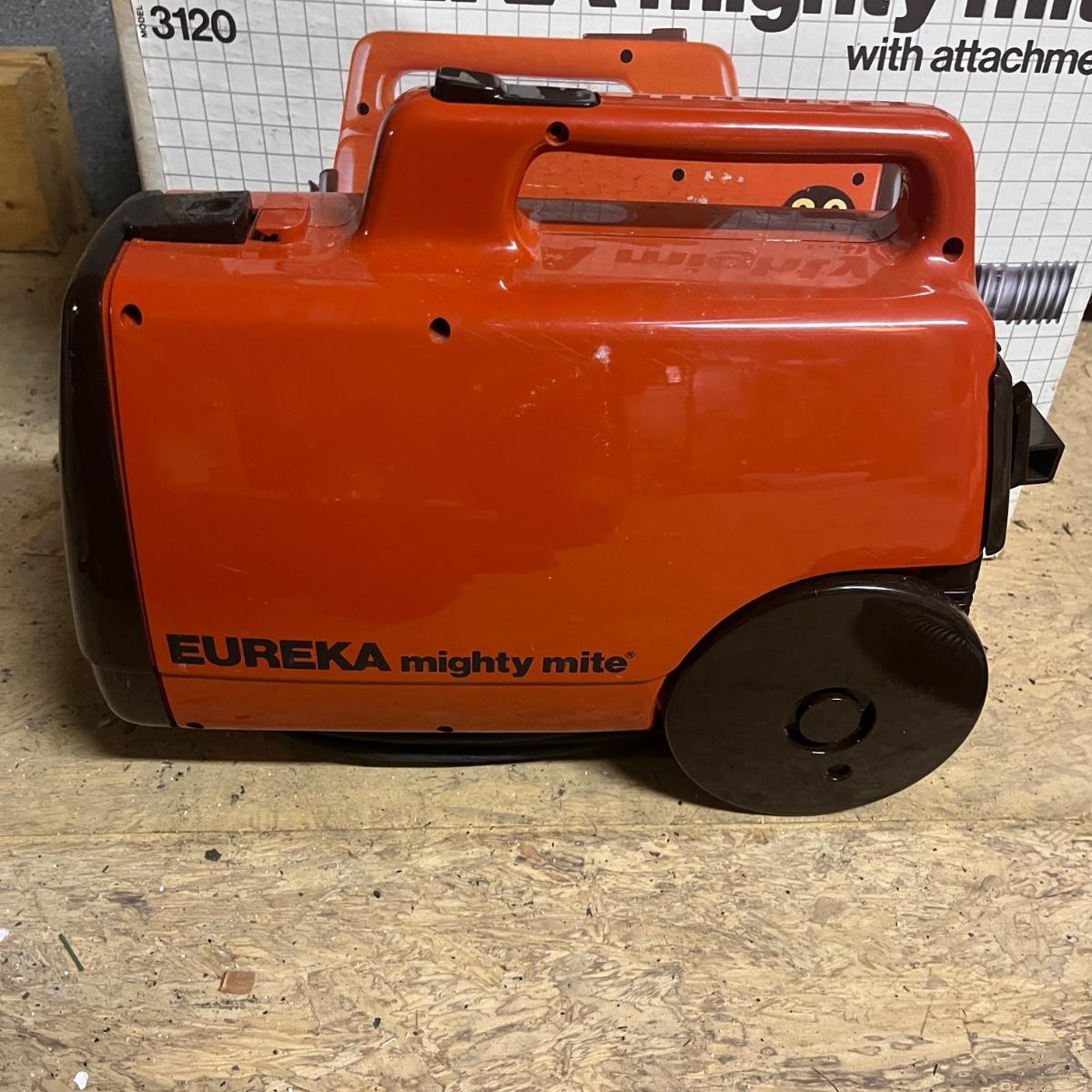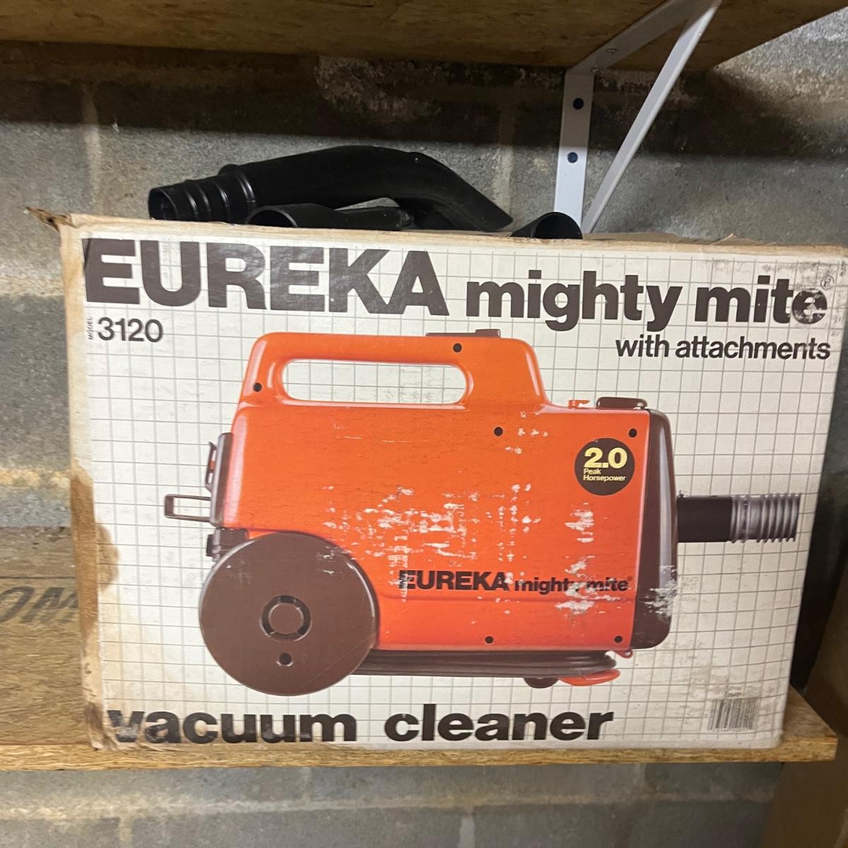 Lot includes a Eureka Mighty Mite canister vacuum with attachments, hose and original box. Machine powered on when plugged in.