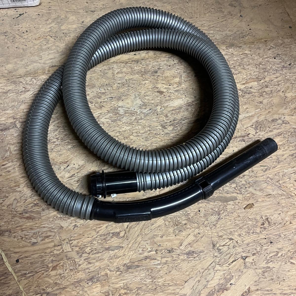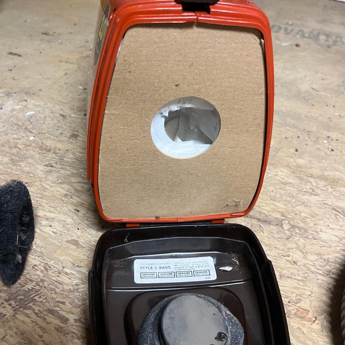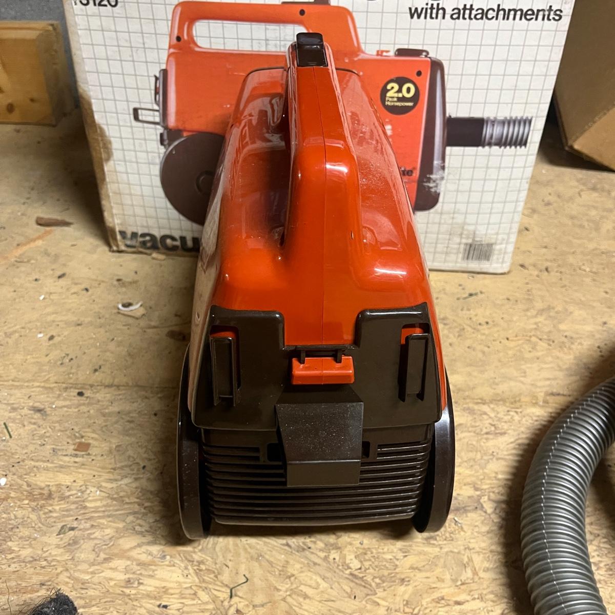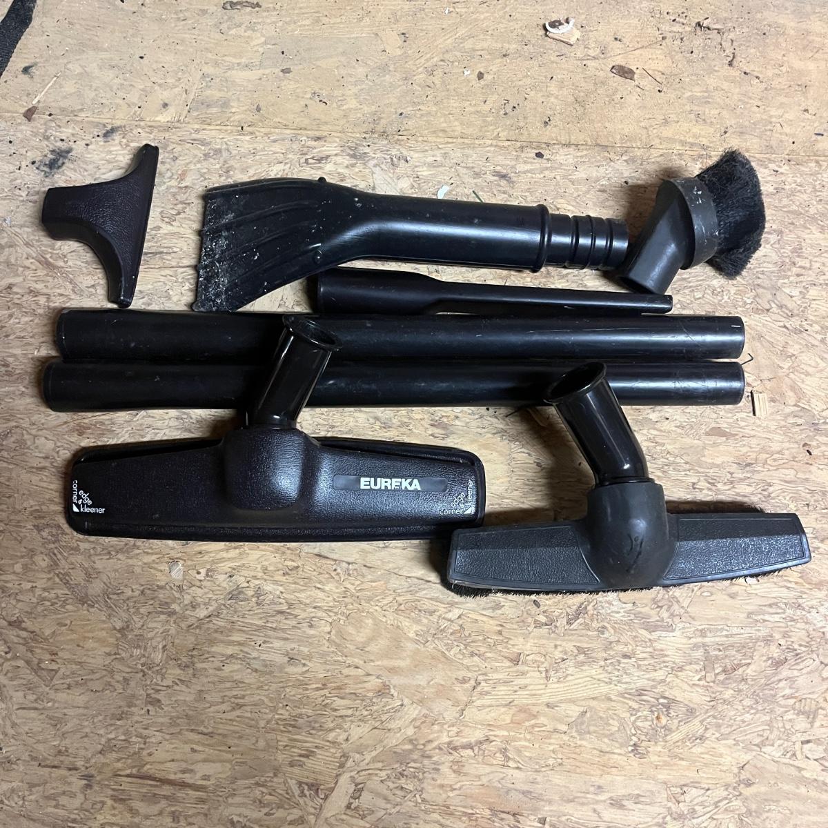 Lot includes a Eureka Mighty Mite canister vacuum with attachments, hose and original box. Machine powered on when plugged in.
