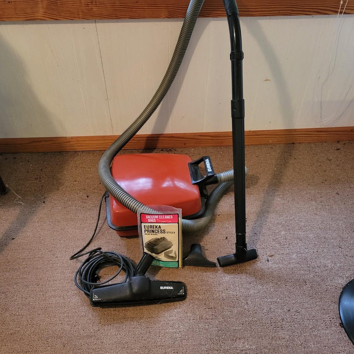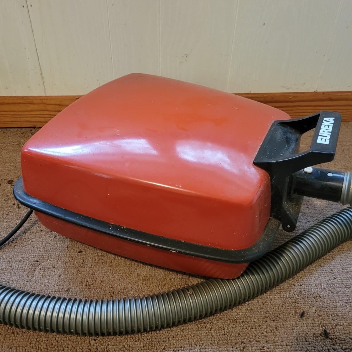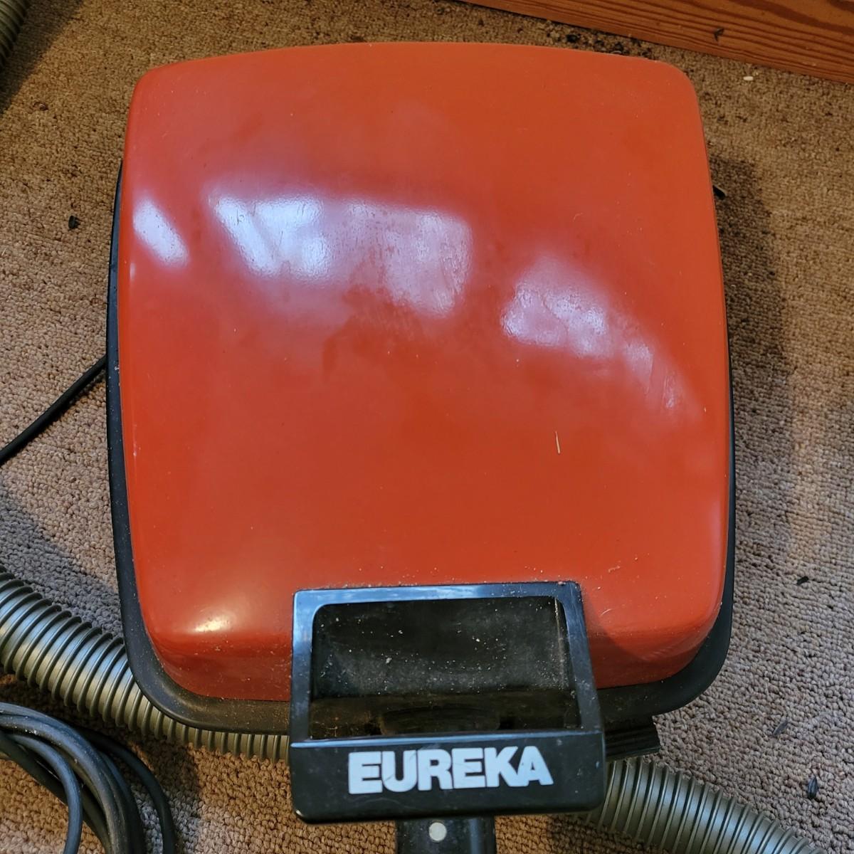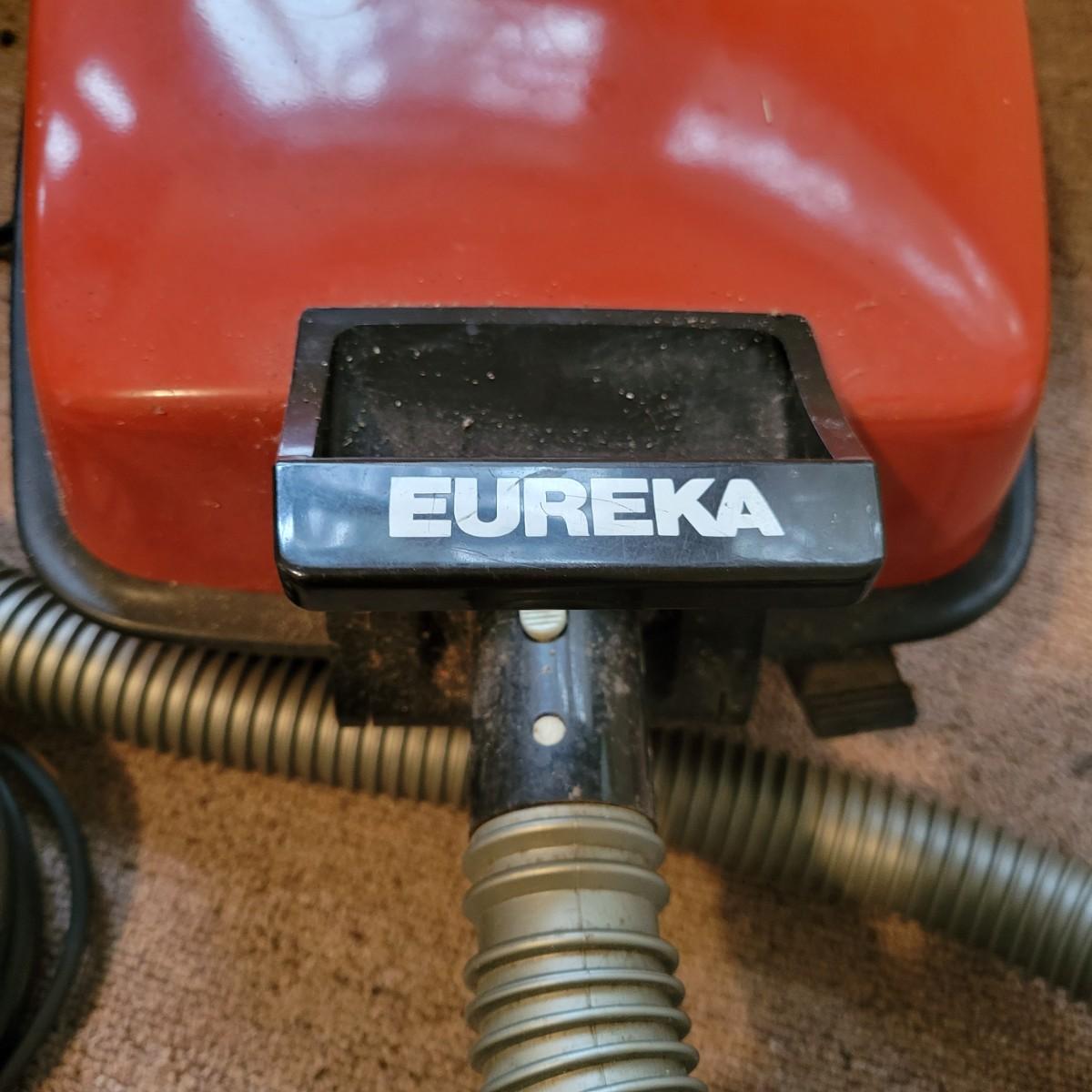 A Eureka rolling canister vacuum that powered on when plugged in. It includes three accessories and measures approximately 14" x 15" x 8.5"H and has a hose length of 7'. Local pickup only