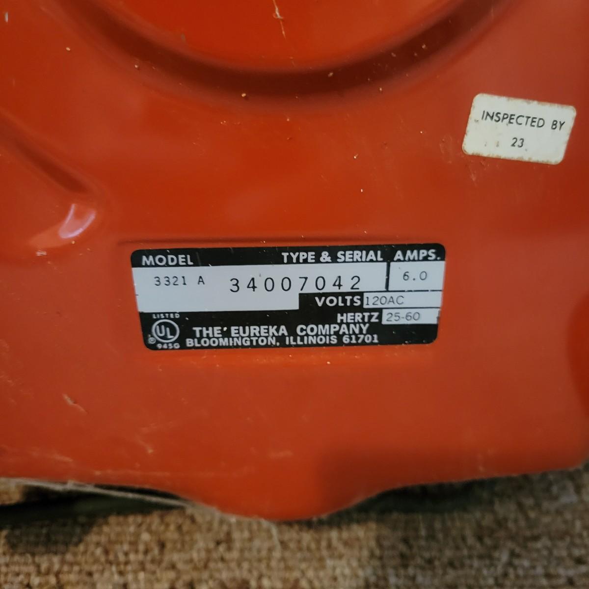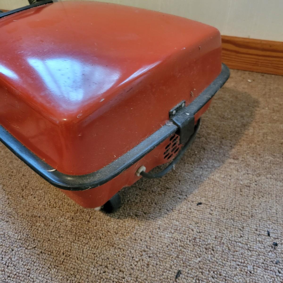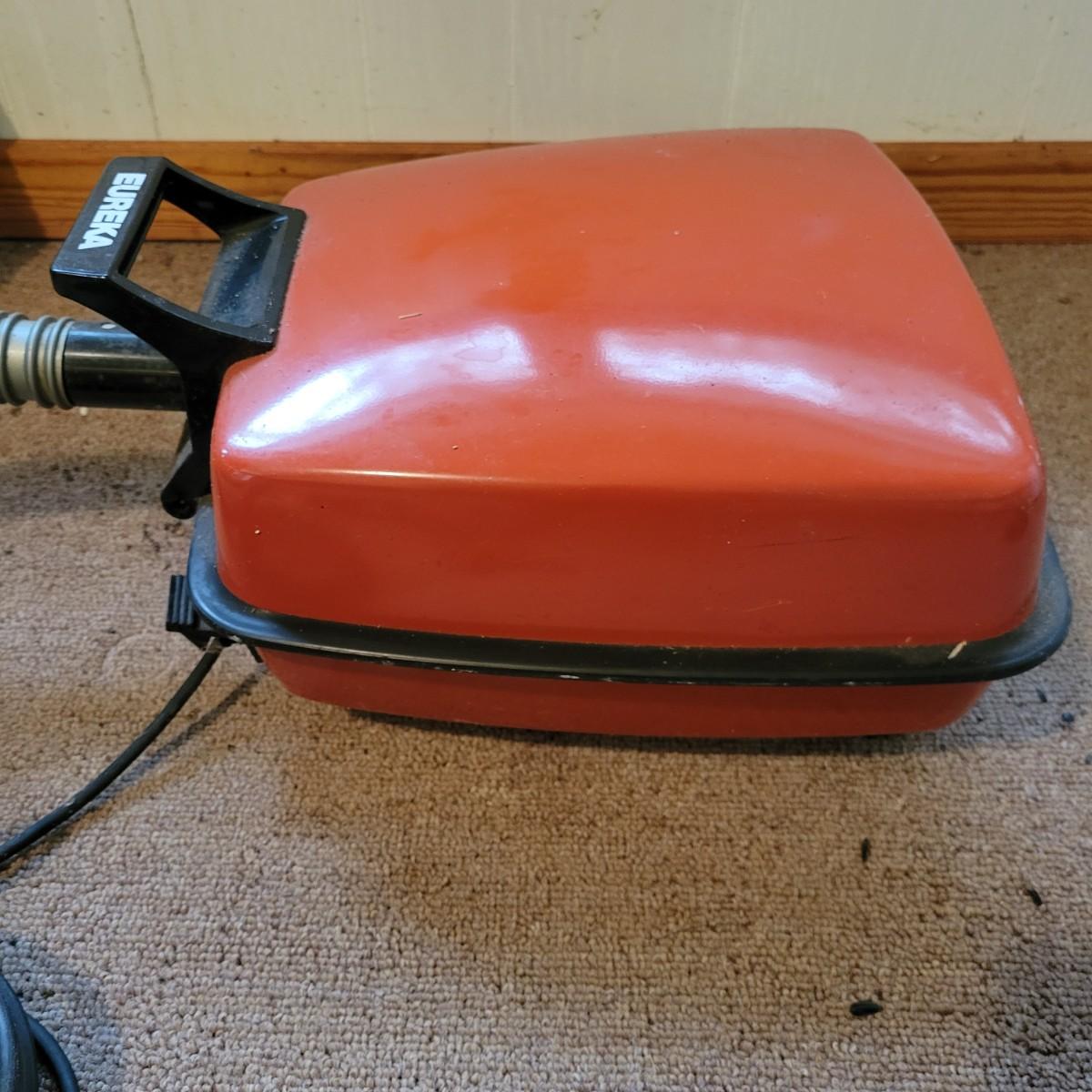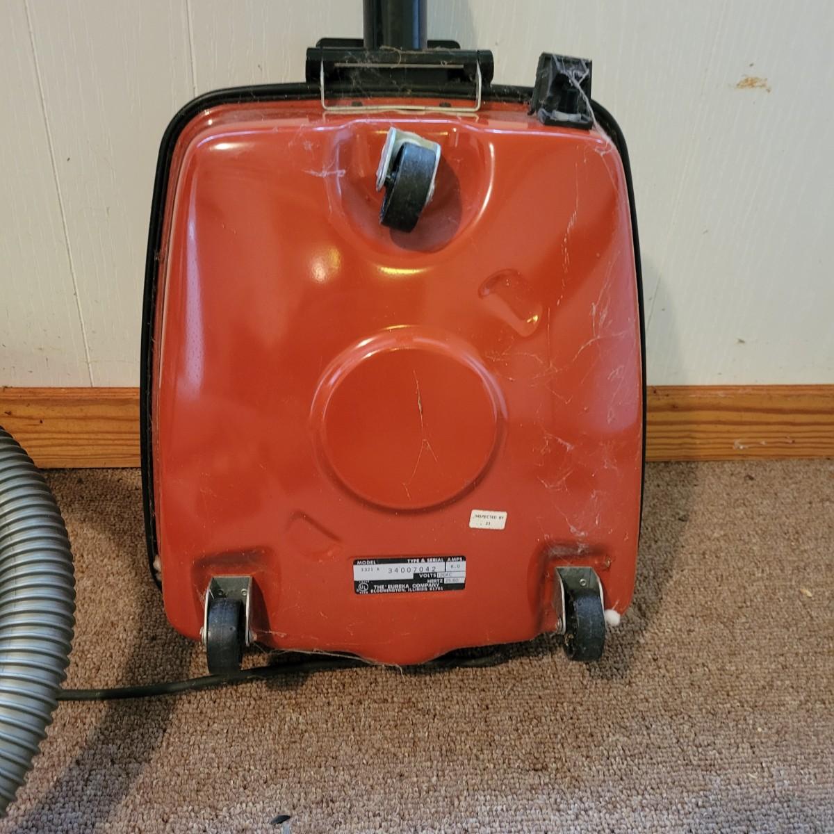 A Eureka rolling canister vacuum that powered on when plugged in. It includes three accessories and measures approximately 14" x 15" x 8.5"H and has a hose length of 7'. Local pickup only