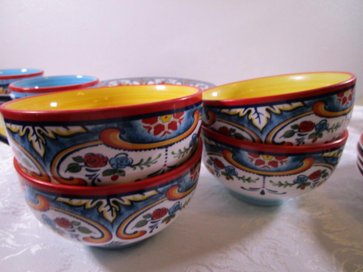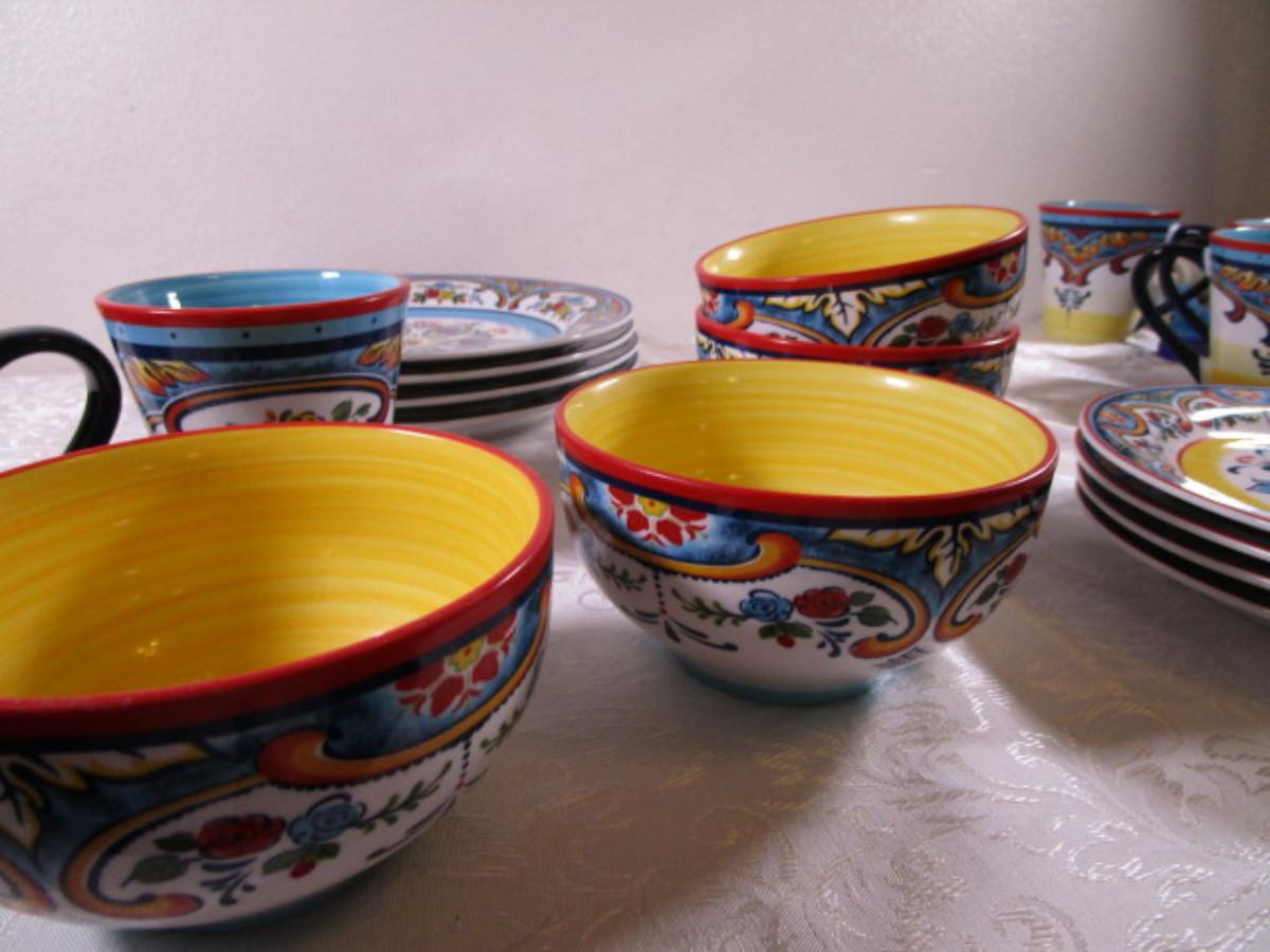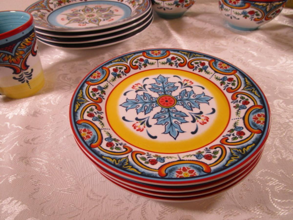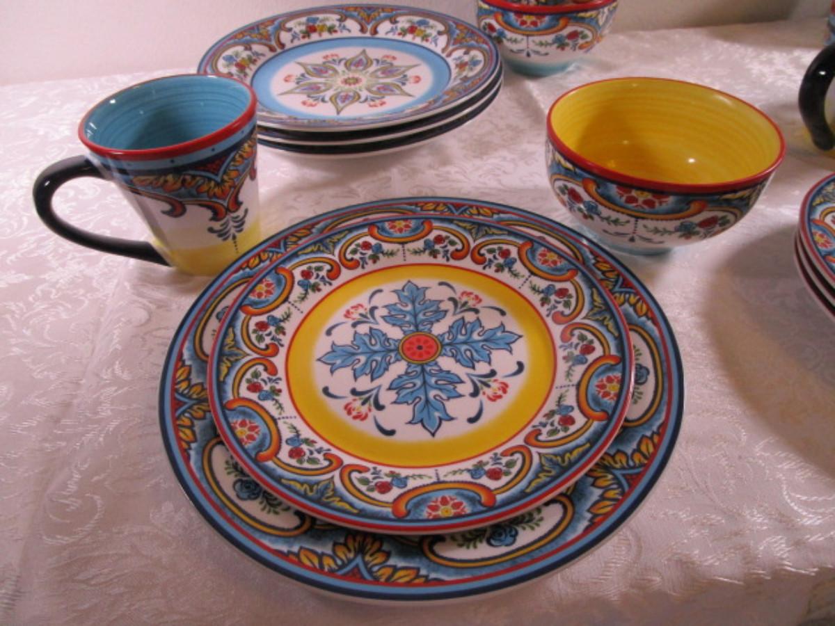 New with stickers, Service for 4, dinner plates, salad plates, mugs, bowls, Sells on Amazon for $76, Microwave safe, dishwasher safe